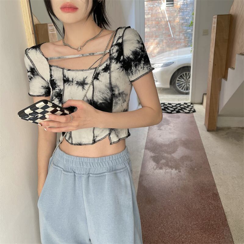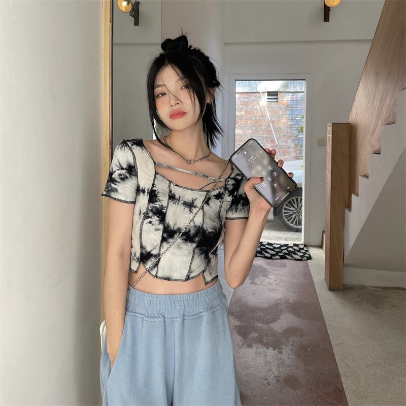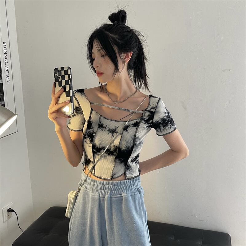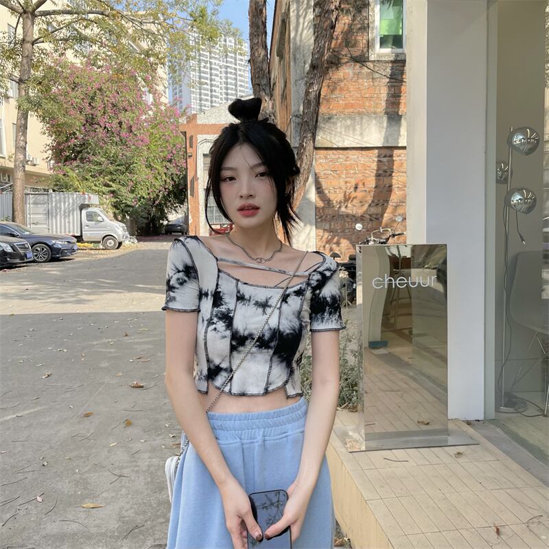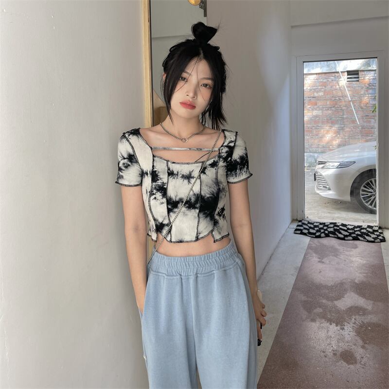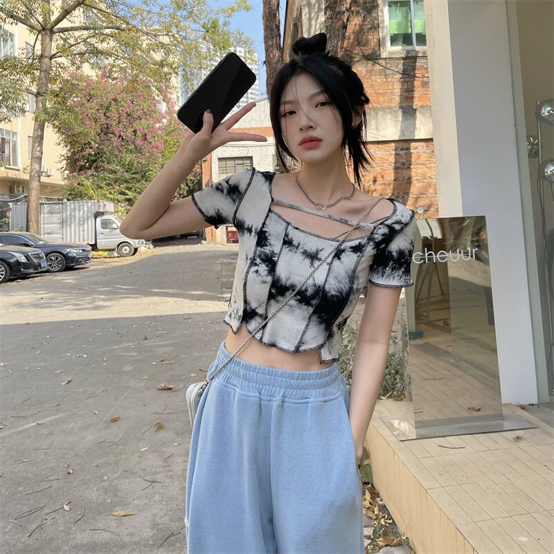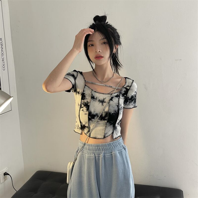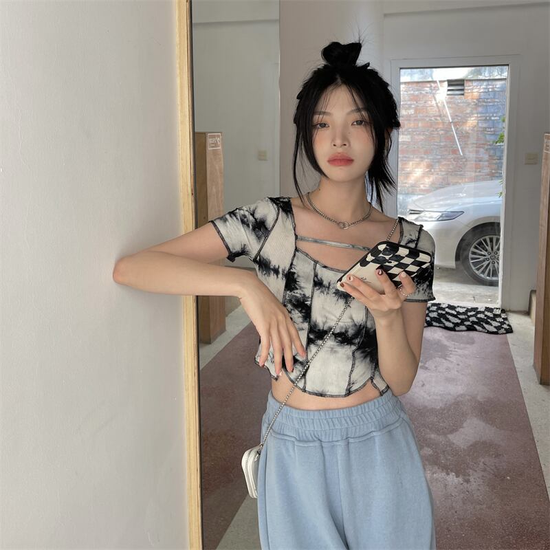 bm甘くてスパイシーなトップ絞り染めスクエアカラーデザインセンスニッチ不規則なハイウエストへそショート半袖Tシャツ女性の夏 大人ガーリー スウィート キュート カジュアル サマー 夏物 スクウェア 7460090236001133 | framboise21