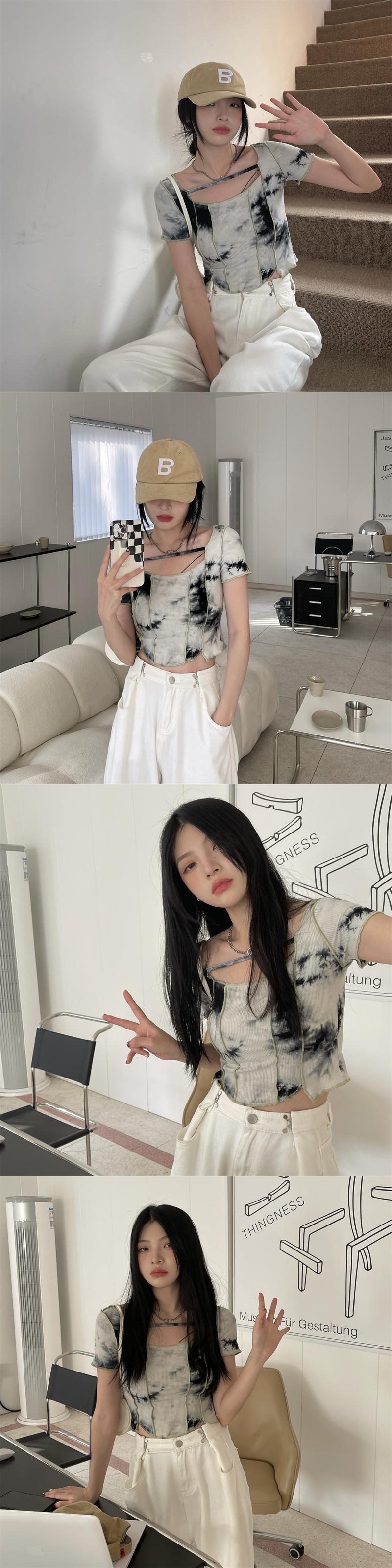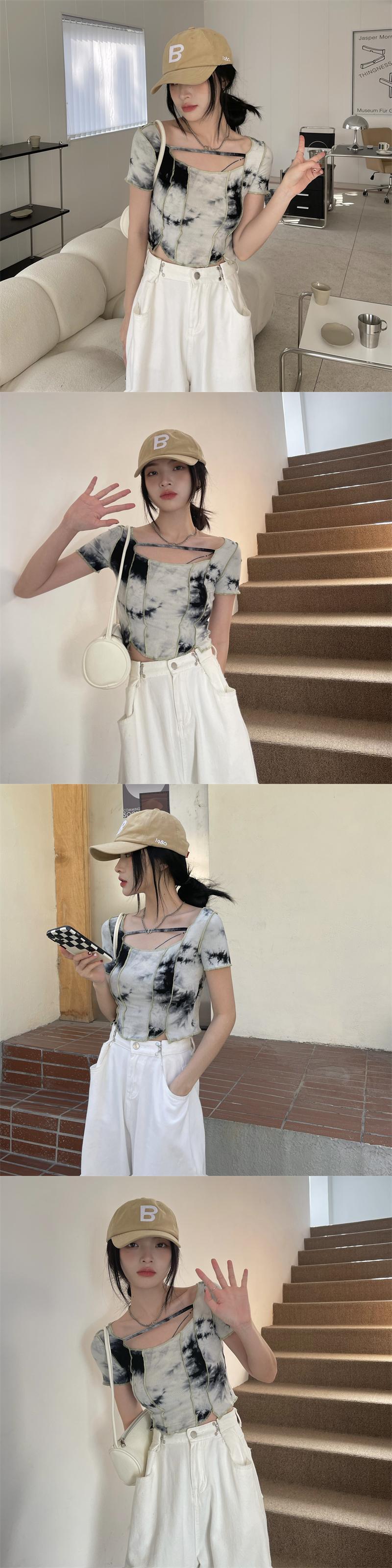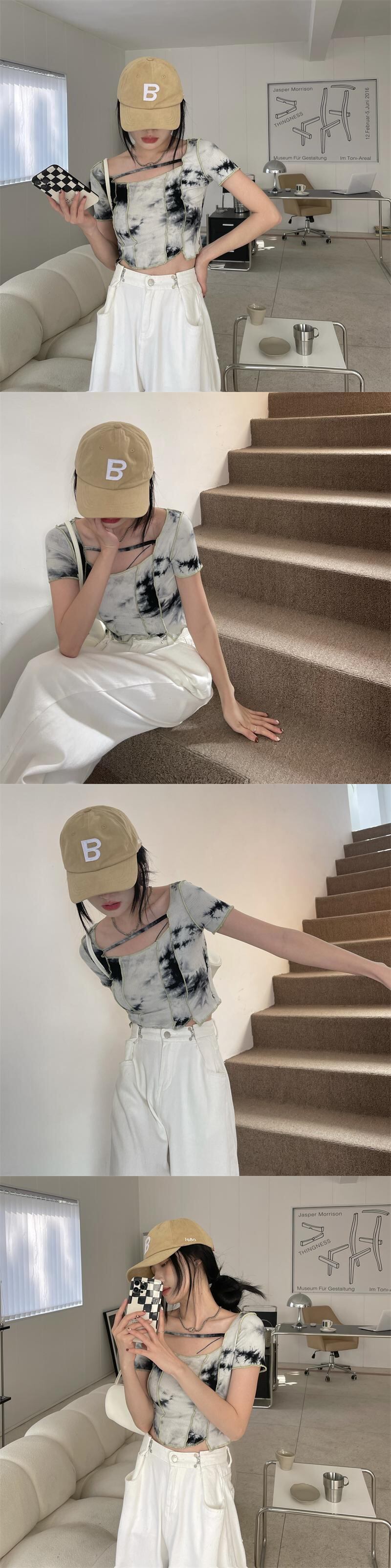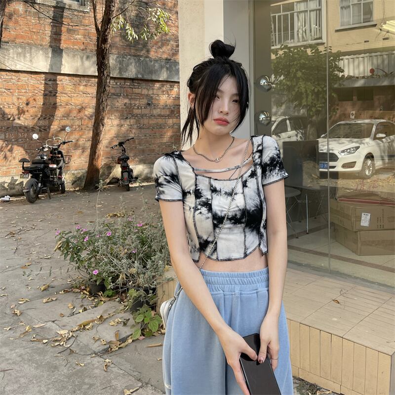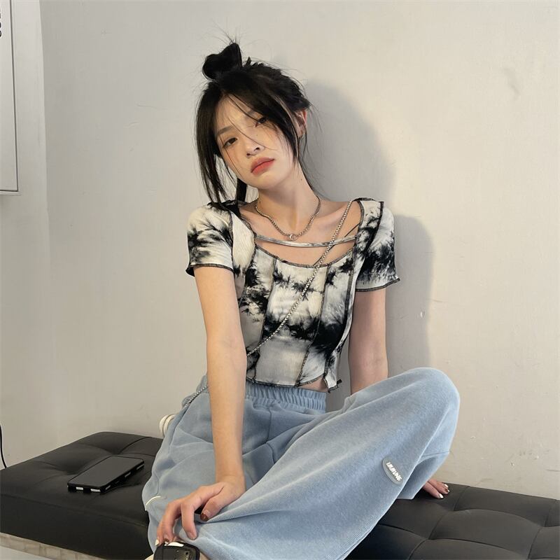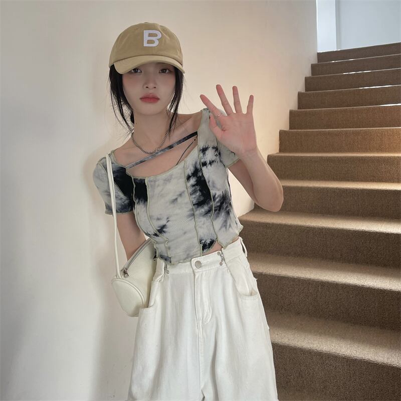 bm甘くてスパイシーなトップ絞り染めスクエアカラーデザインセンスニッチ不規則なハイウエストへそショート半袖Tシャツ女性の夏 大人ガーリー スウィート キュート カジュアル サマー 夏物 スクウェア 7460090236001133 | framboise21