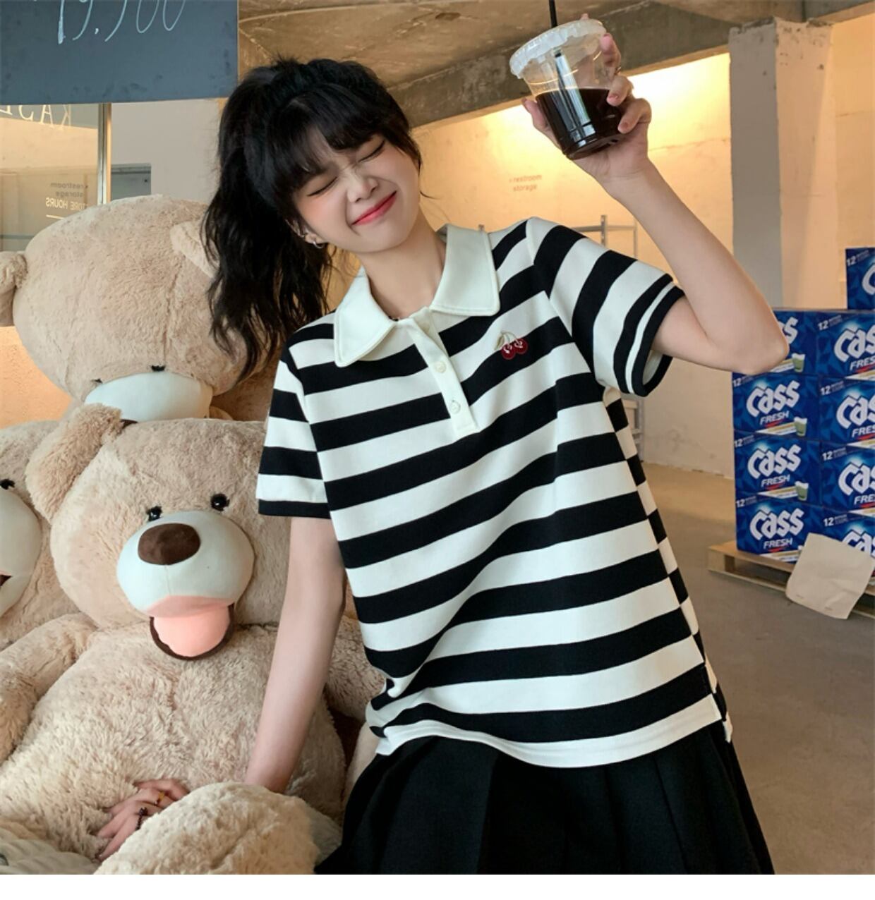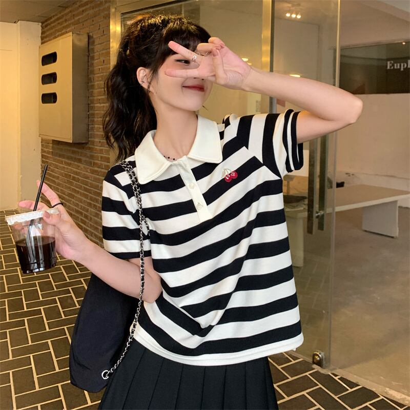 黒と白のストライプの半袖Tシャツ女性の2022年夏の新しいデザインの小さな大学スタイルのショートポロシャツトップ ホワイト ブラック サマー 夏物 7460042183324550 | framboise21
