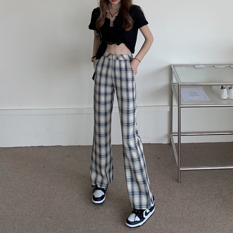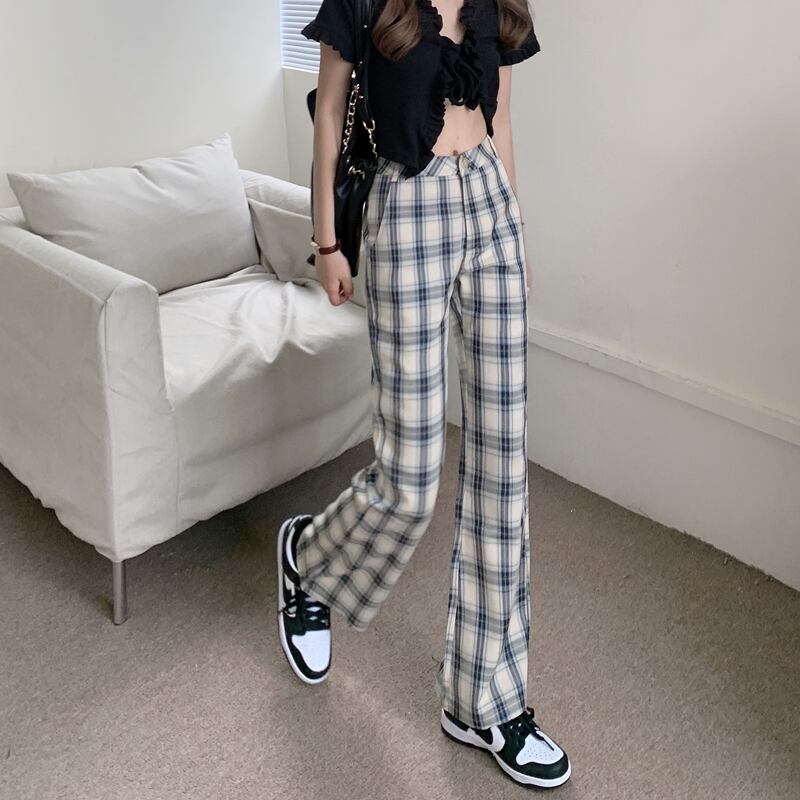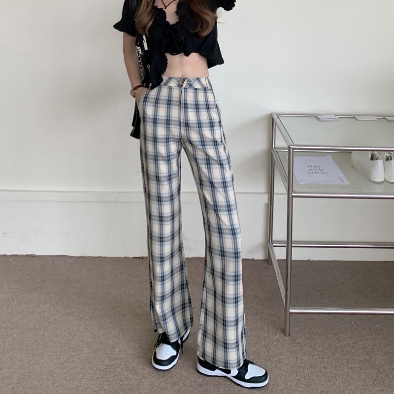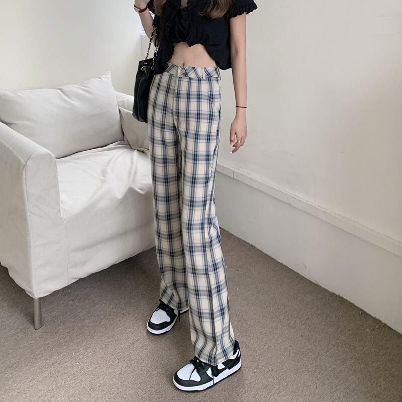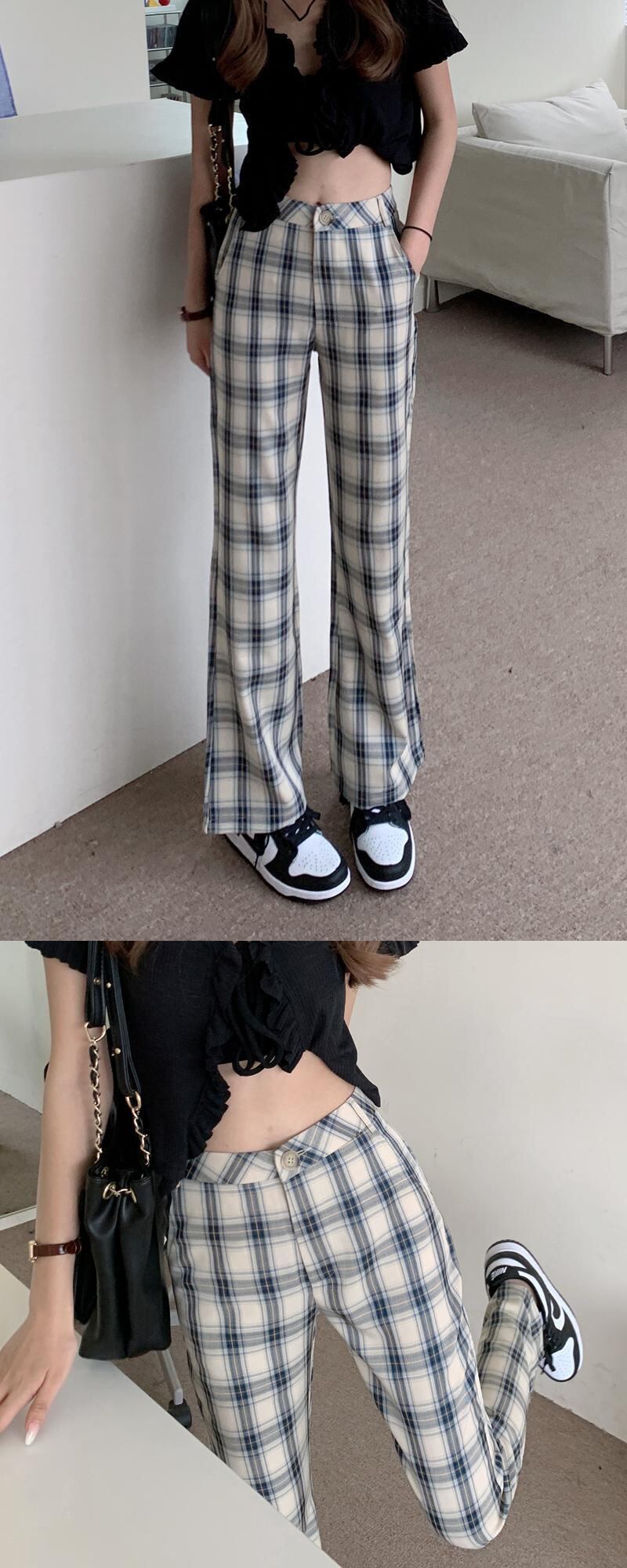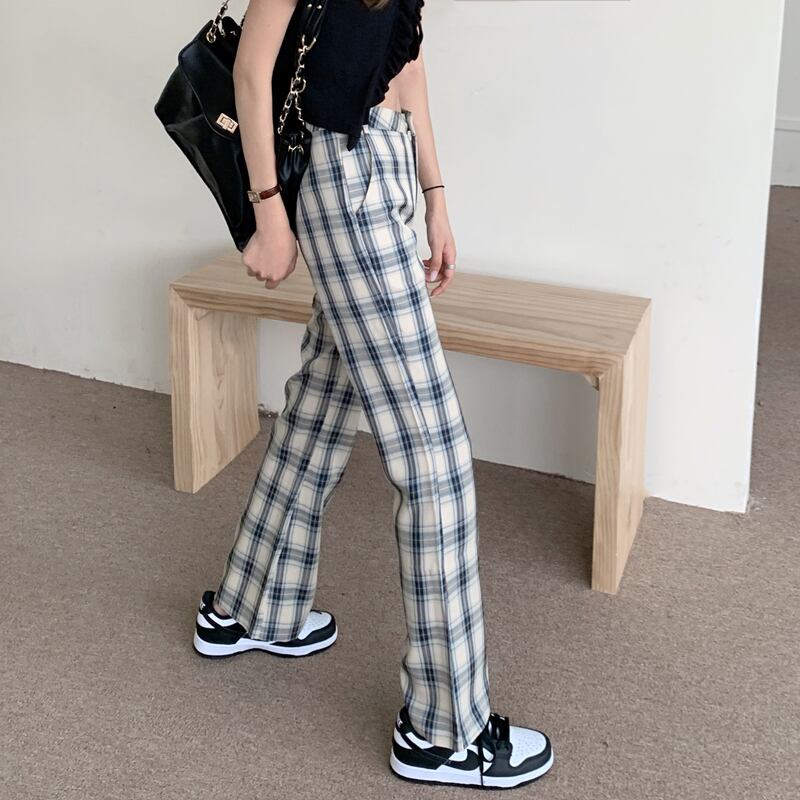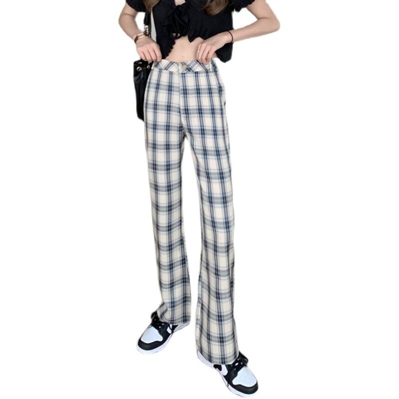 夏のチェック柄ルーズワイドレッグパンツレディース夏の薄手のパンツスーツパンツハイウエストドレープパンツスモールチェック柄パンツ ハイウェスト サマー 夏物 7460012611551239 | framboise21