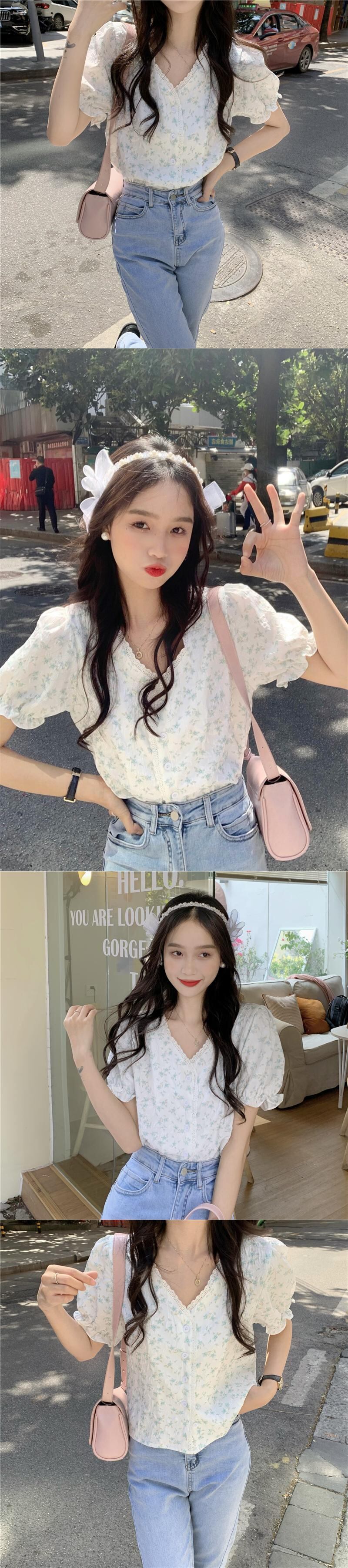 ブルーVネックフローラルパフスリーブ半袖シャツレディースサマーデザインスモールスモールフレッシュスウィートトップシャツ 大人ガーリー キュート カジュアル 夏物 花柄 746002976135836 | framboise21