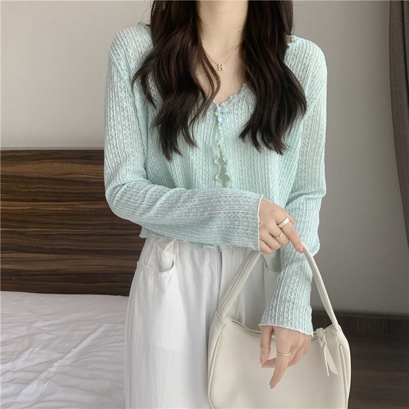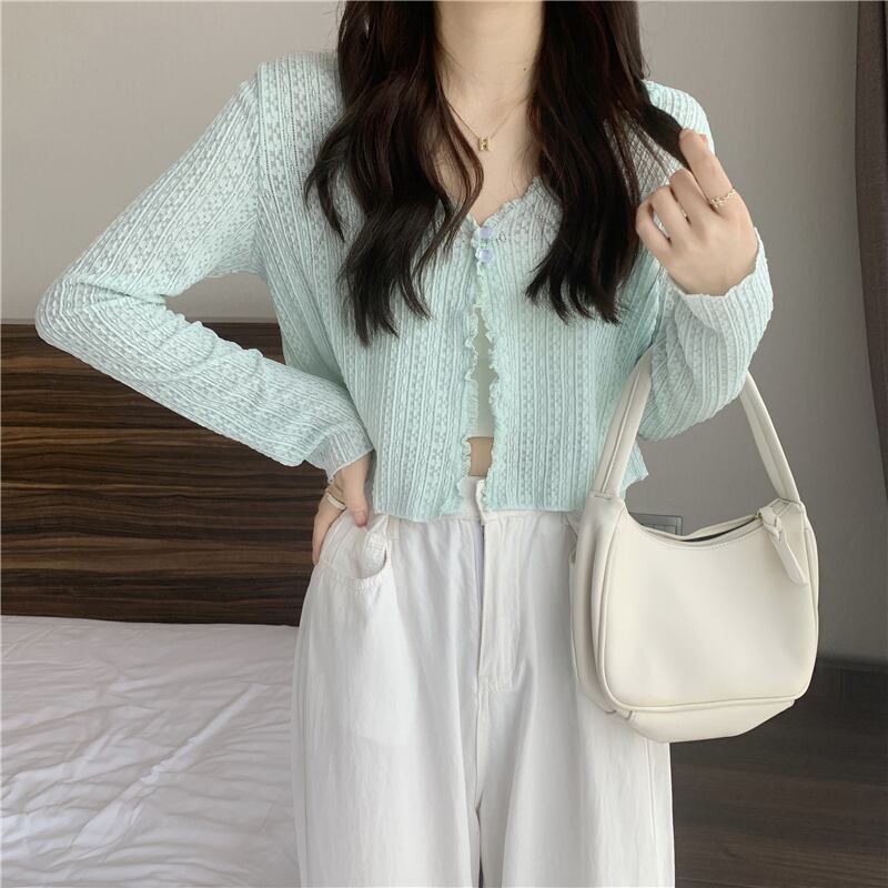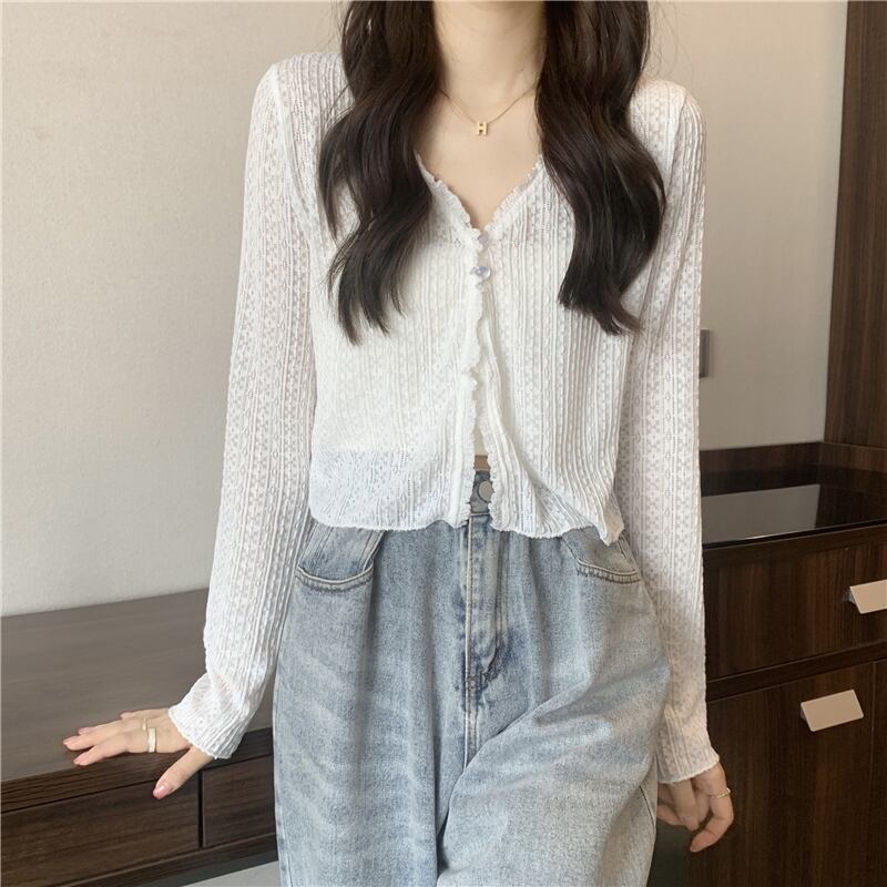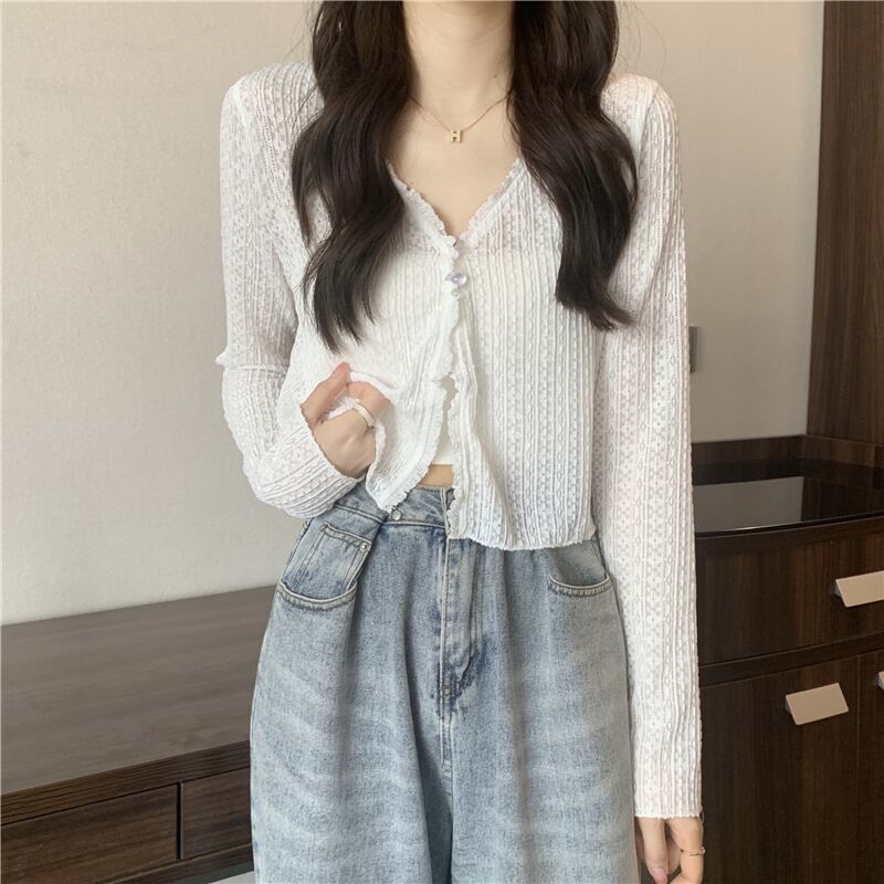 ホワイトニットカーディガンレディースサマー薄手ショートサンスクリーンシャツVネックアイスシルクブラウスやや透明レースエアコンシャツトップ 夏物 7460036917803438 | framboise21