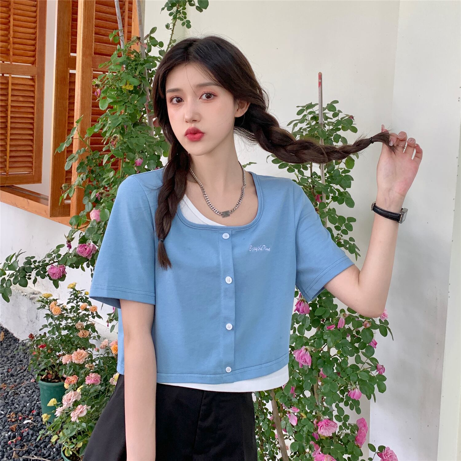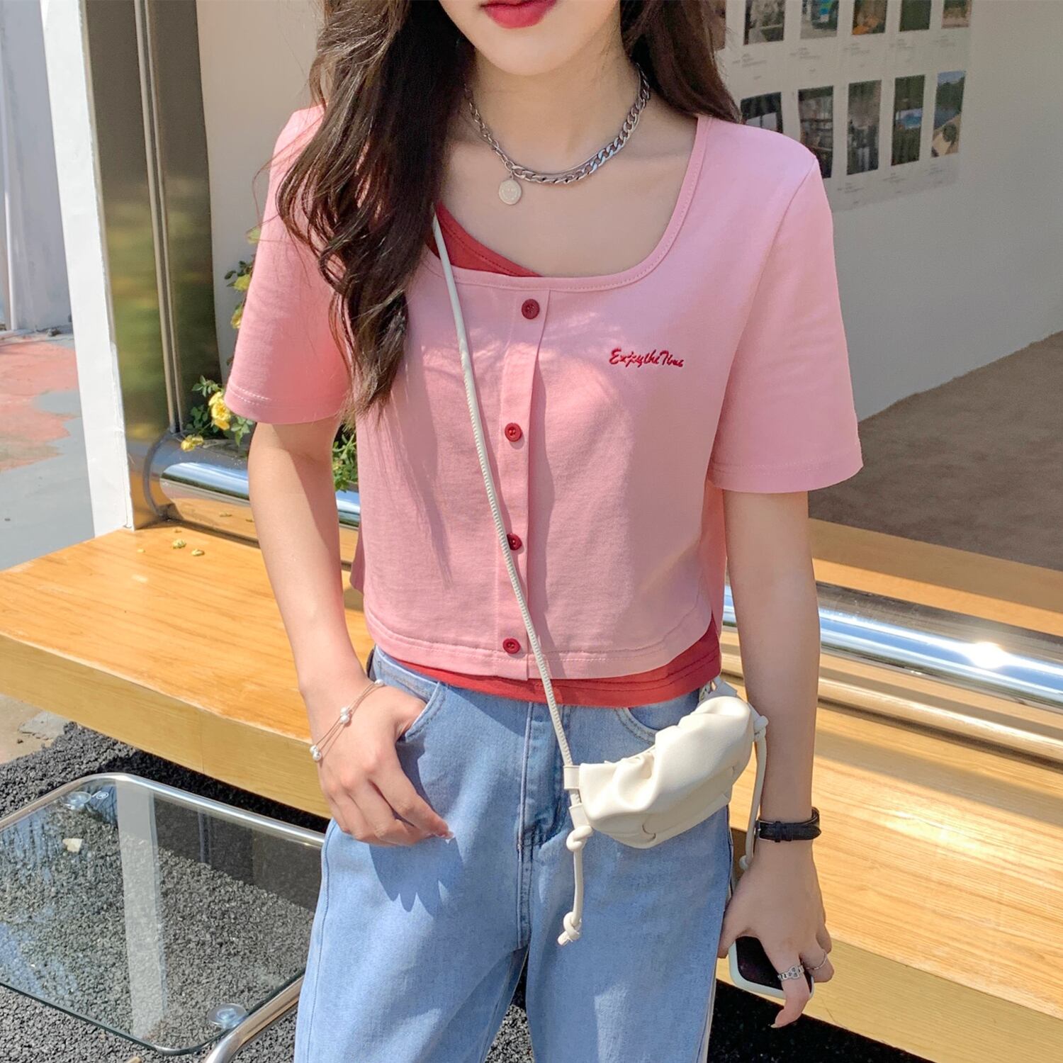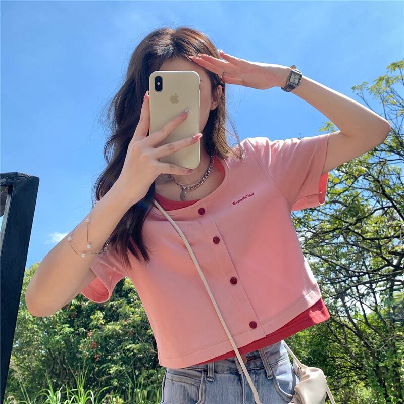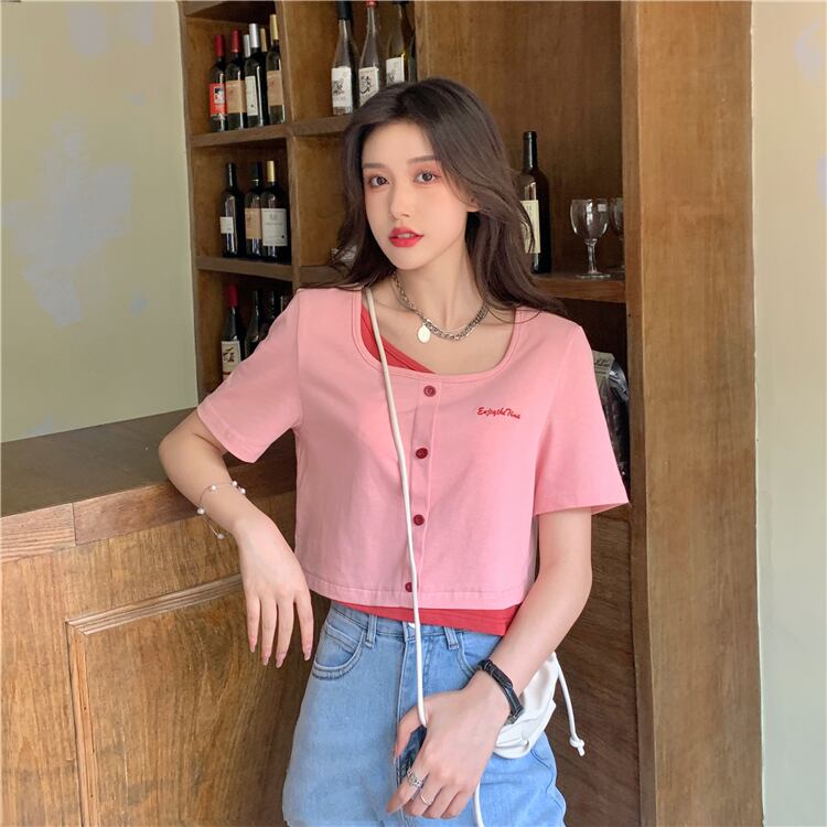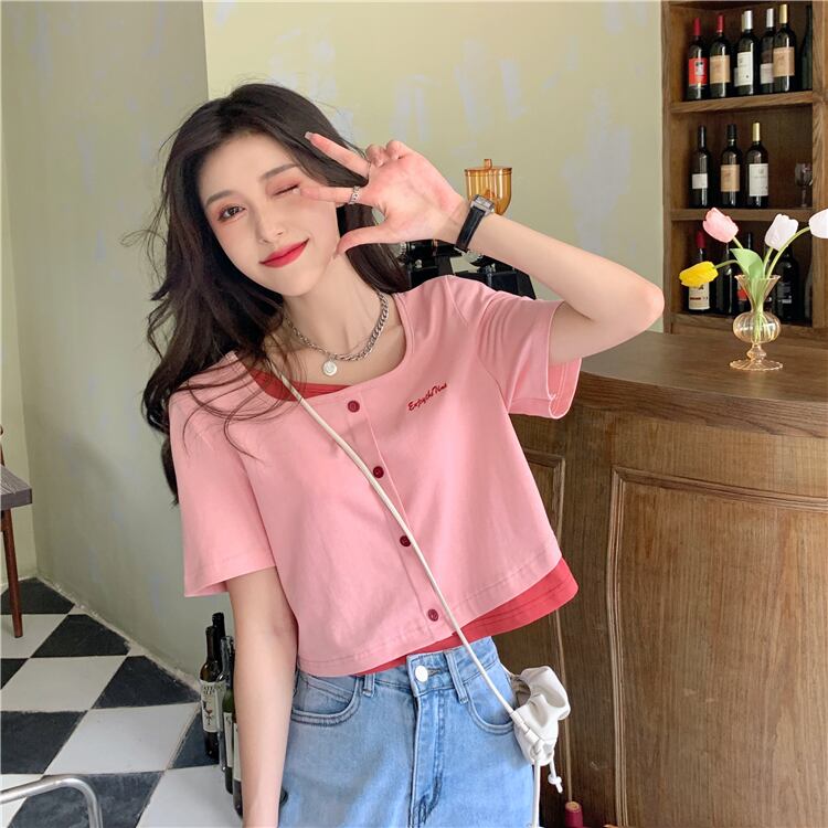 フェイクツーピーススクエアネック半袖Tシャツ2022年夏新しいスウィートショートセクションスモールインスウィートクールトップ女性サマー 大人ガーリー キュート カジュアル 夏物 スクウェア 7460090226017455 | framboise21