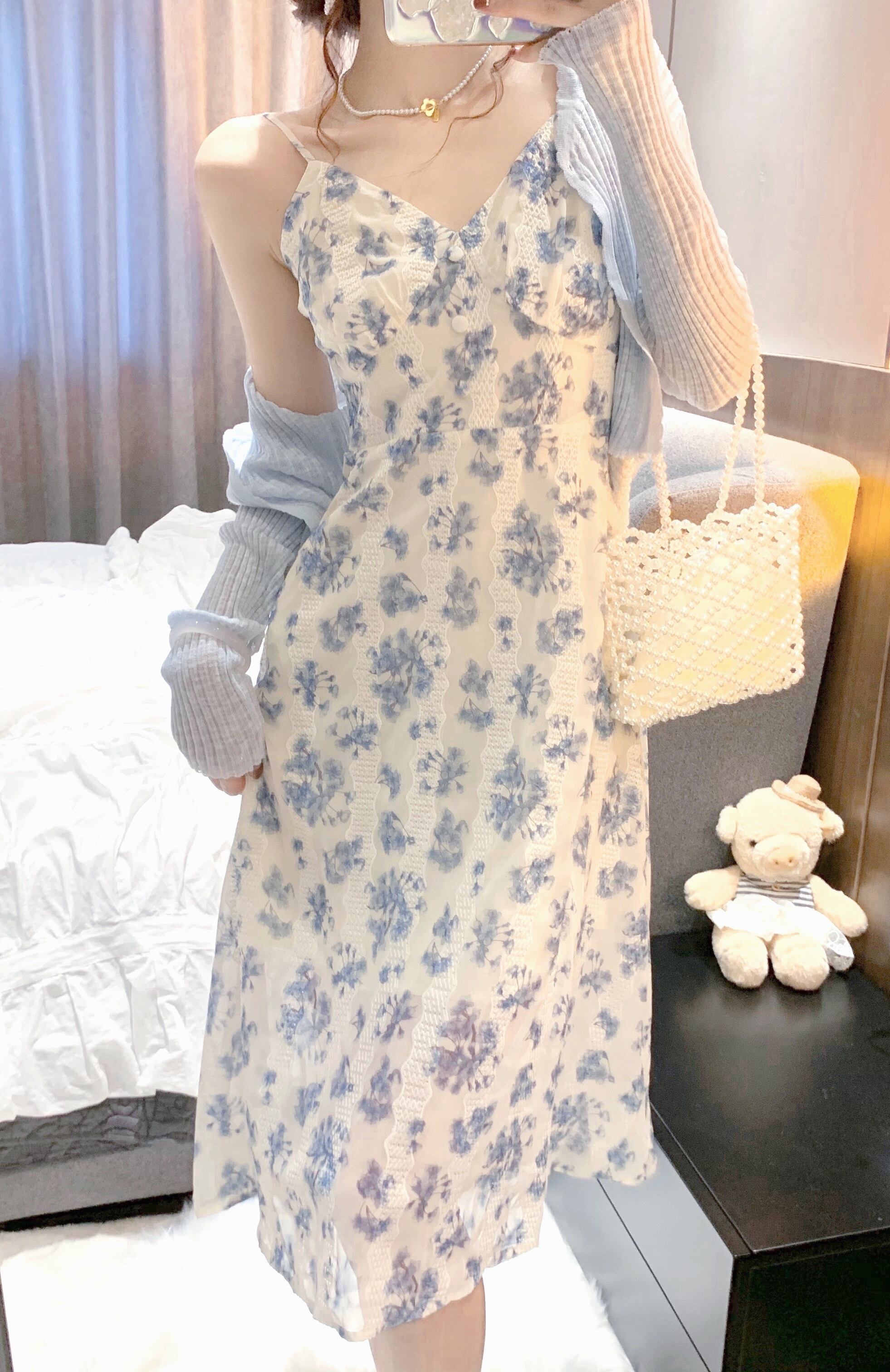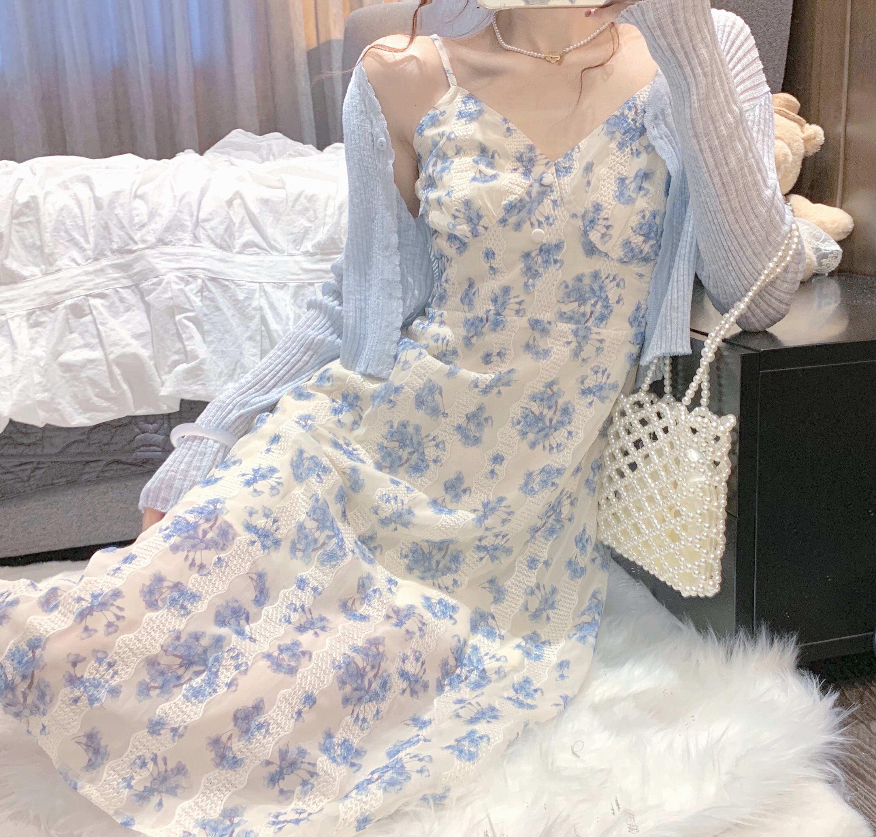 色:ブルーカーディガン,スカート
