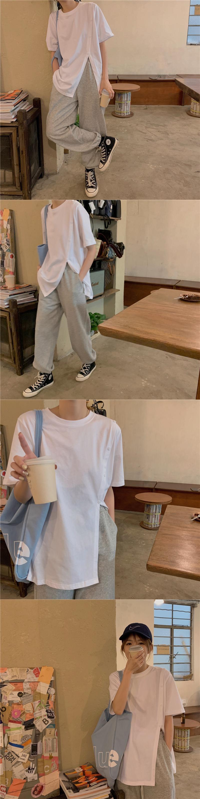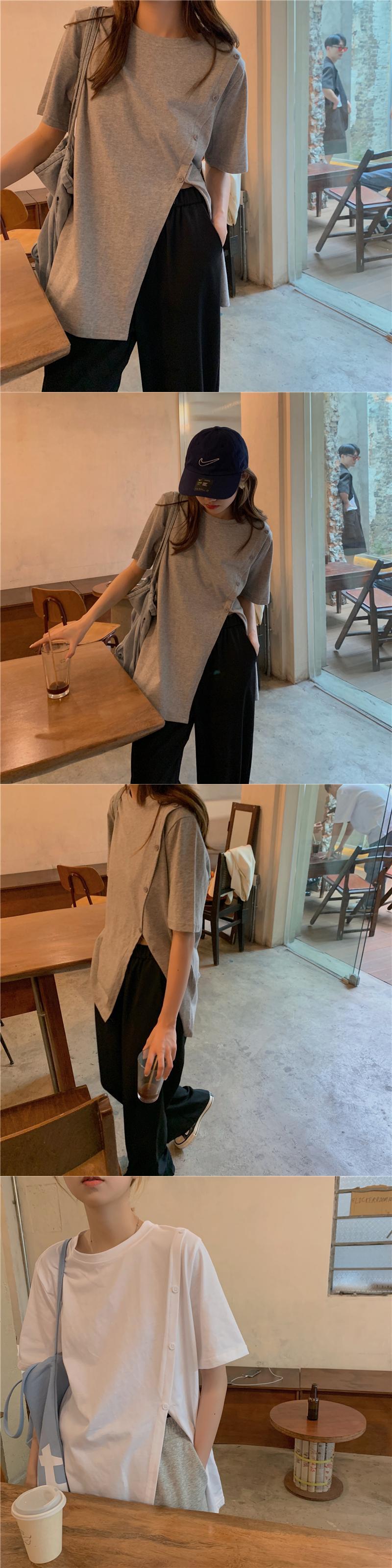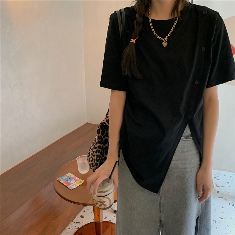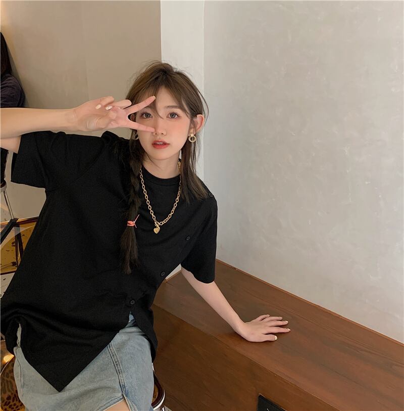 グレーの半袖Tシャツレディースサマーピュアコットンロングカバーお尻ルーズ無地ボタンスリットデザインセンストップインタイド 夏物 ソリッドカラー 7460030808282279 | framboise21