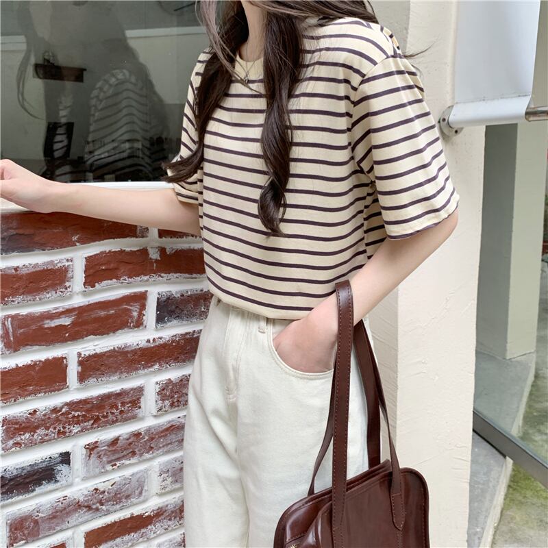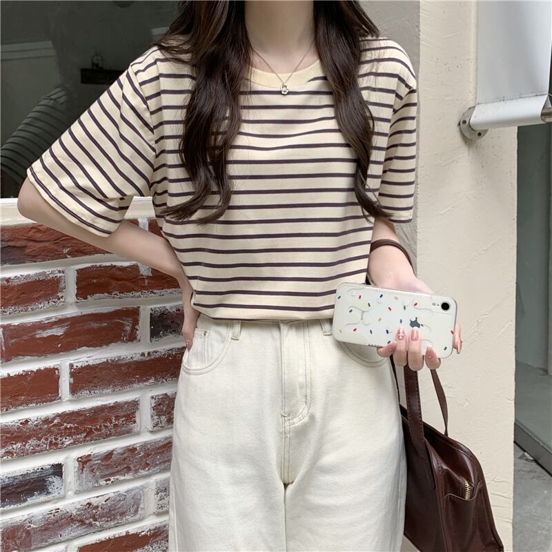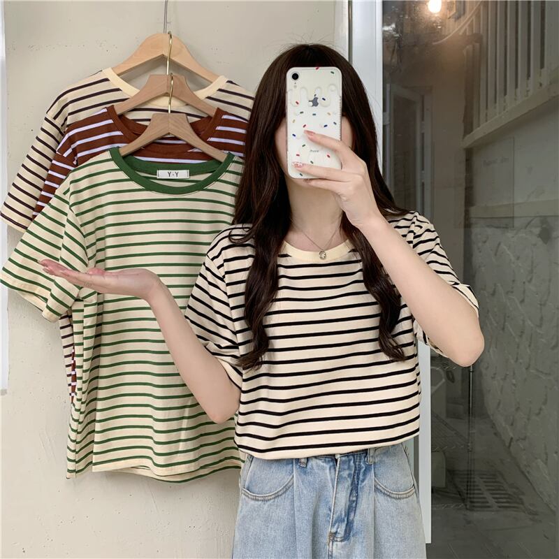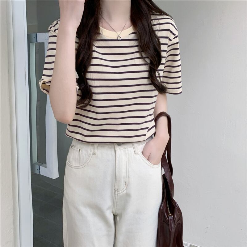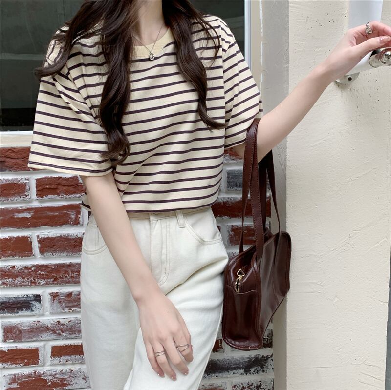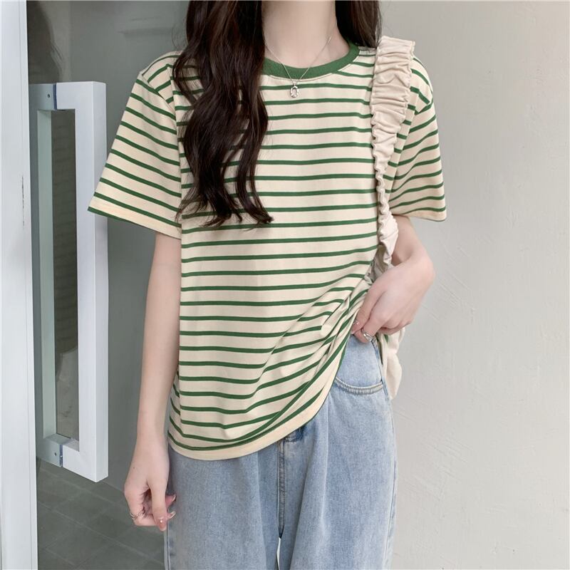 夏の女性のストライプのフロントショルダー半袖Tシャツのデザインは、ニッチでルーズで薄いカジュアルなトップスにジーンズを合わせたものです サマー 夏物 7460084476305587 | framboise21
