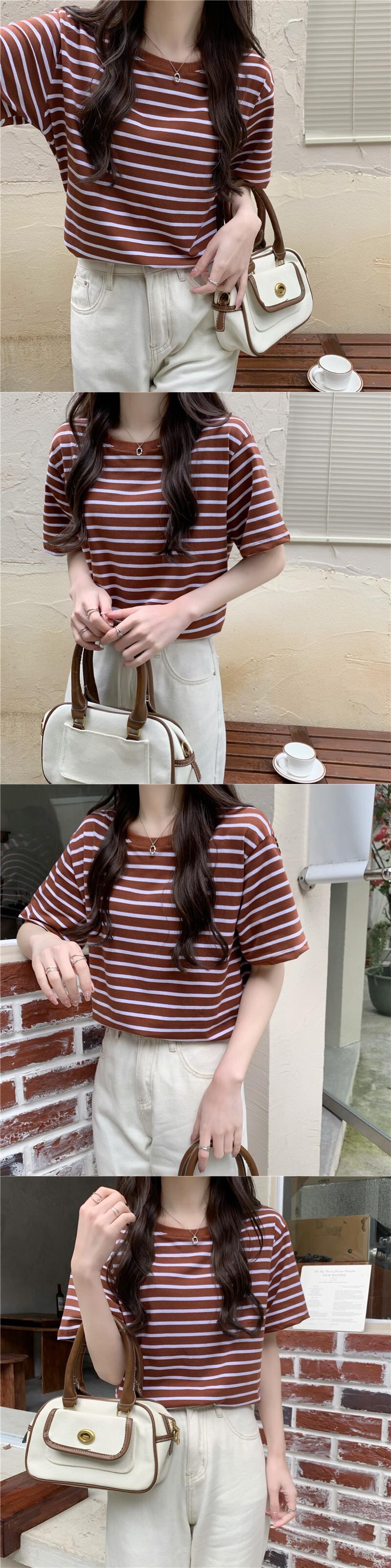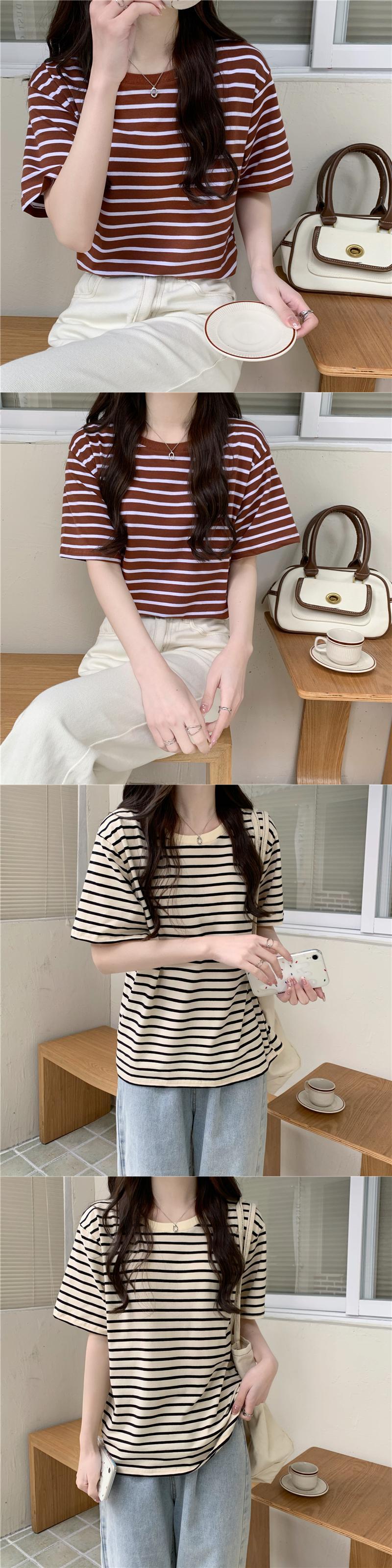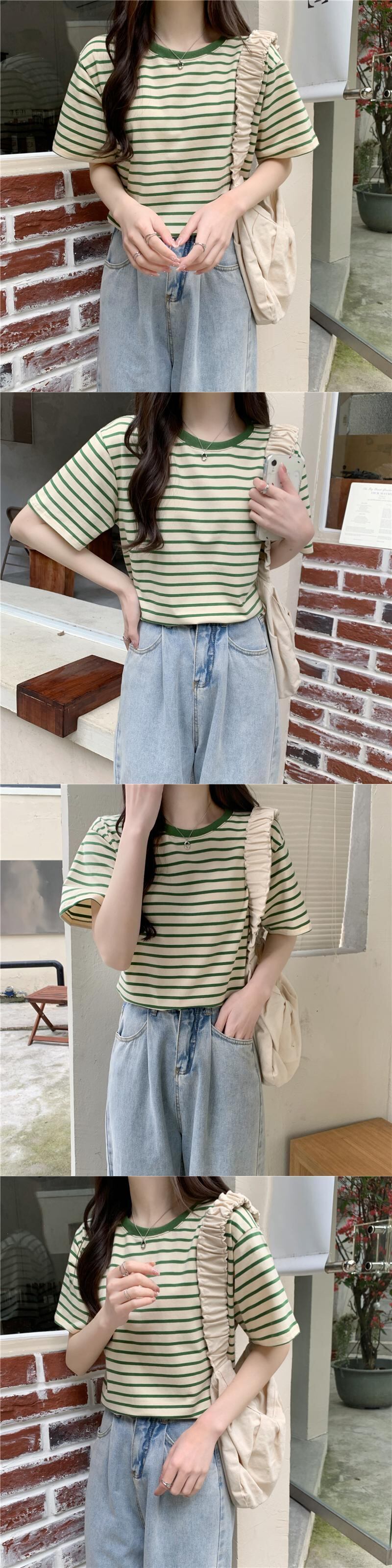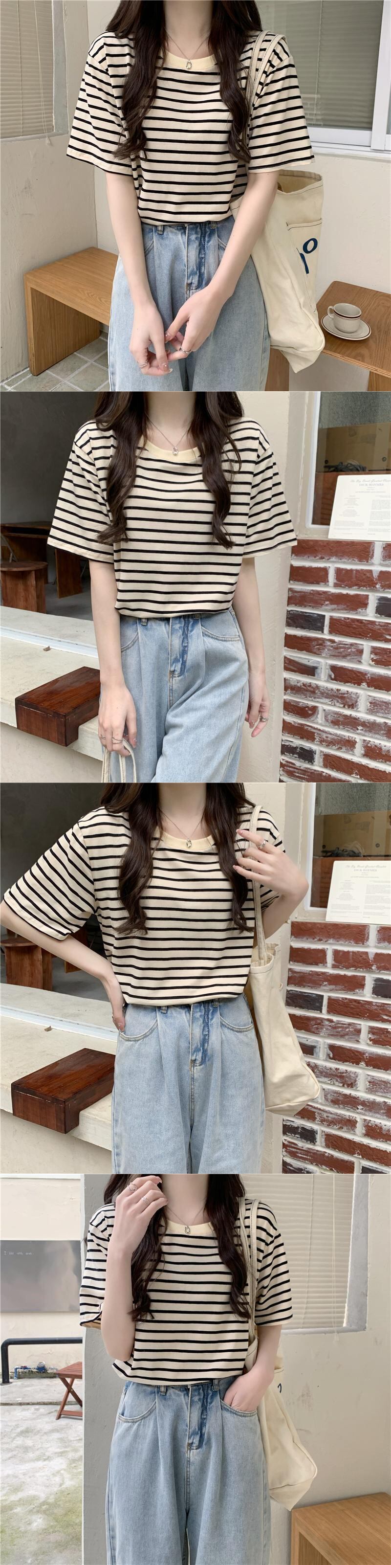 夏の女性のストライプのフロントショルダー半袖Tシャツのデザインは、ニッチでルーズで薄いカジュアルなトップスにジーンズを合わせたものです サマー 夏物 7460084476305587 | framboise21