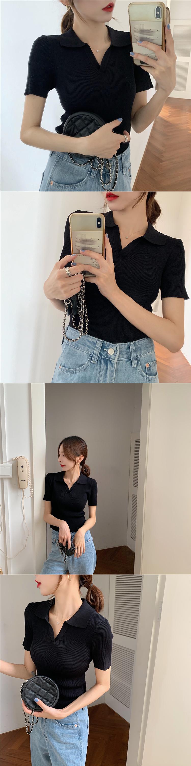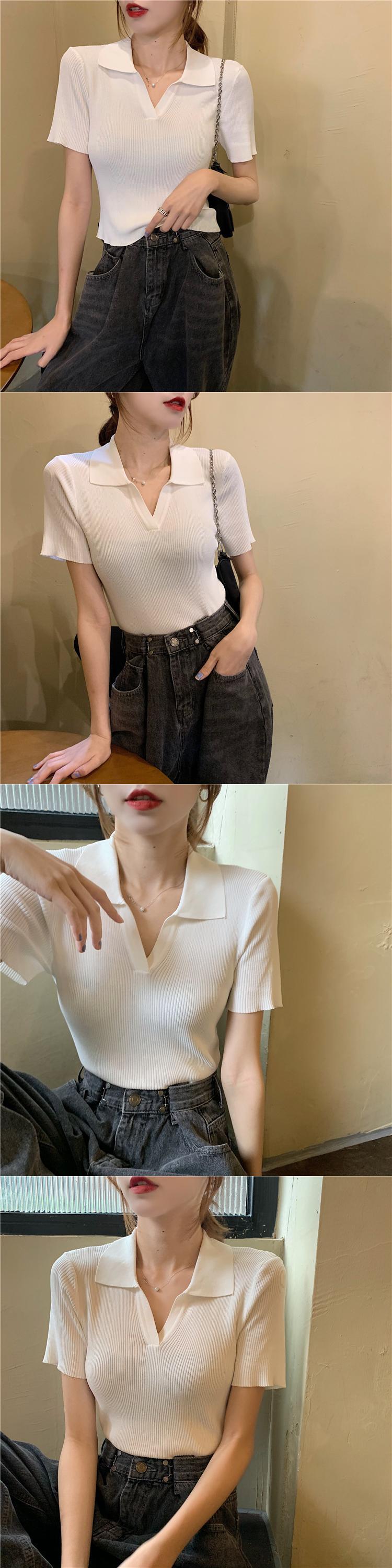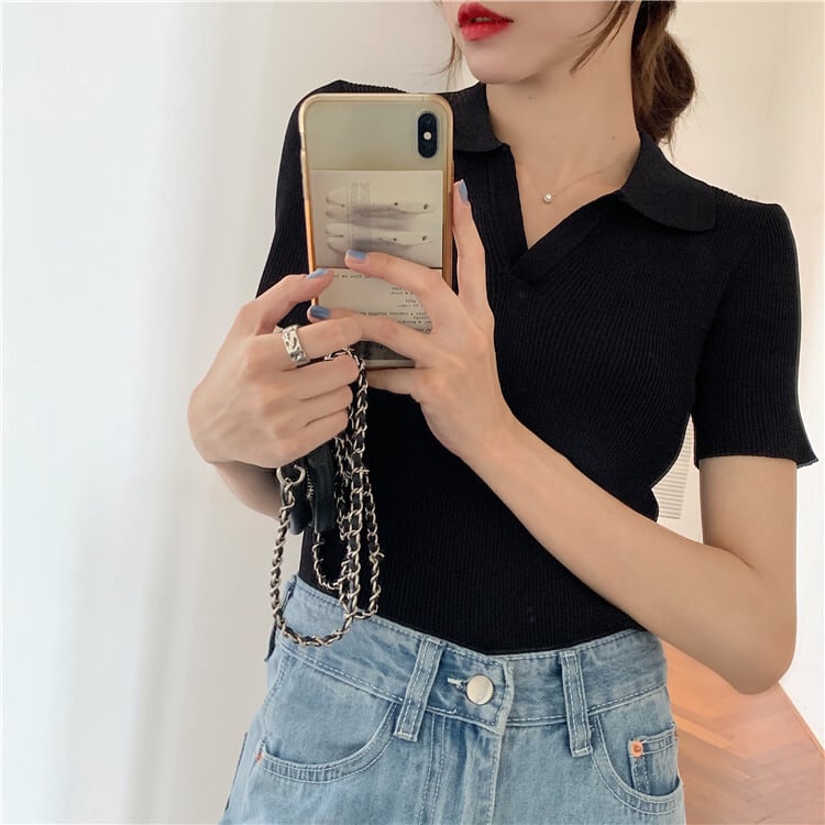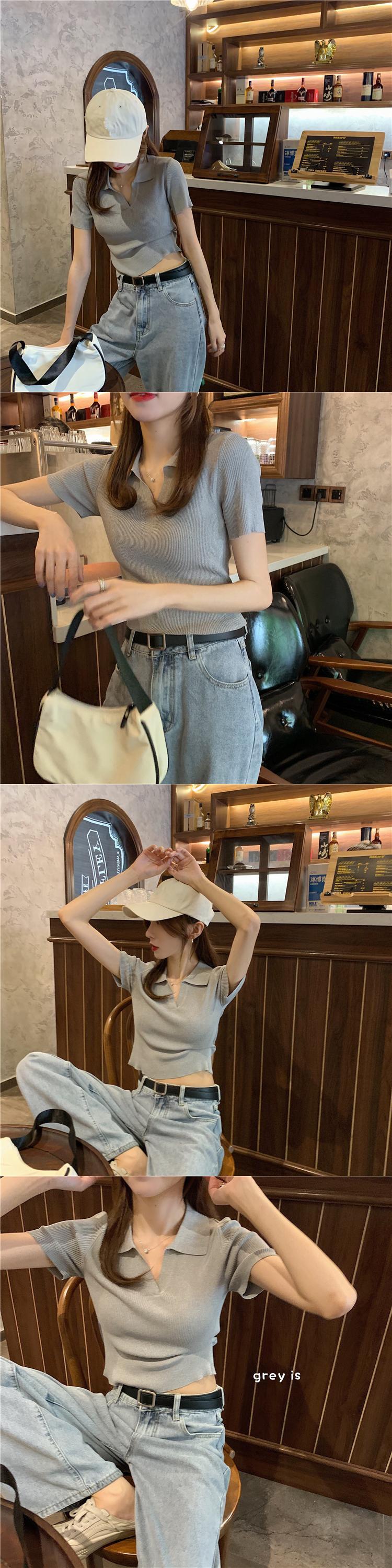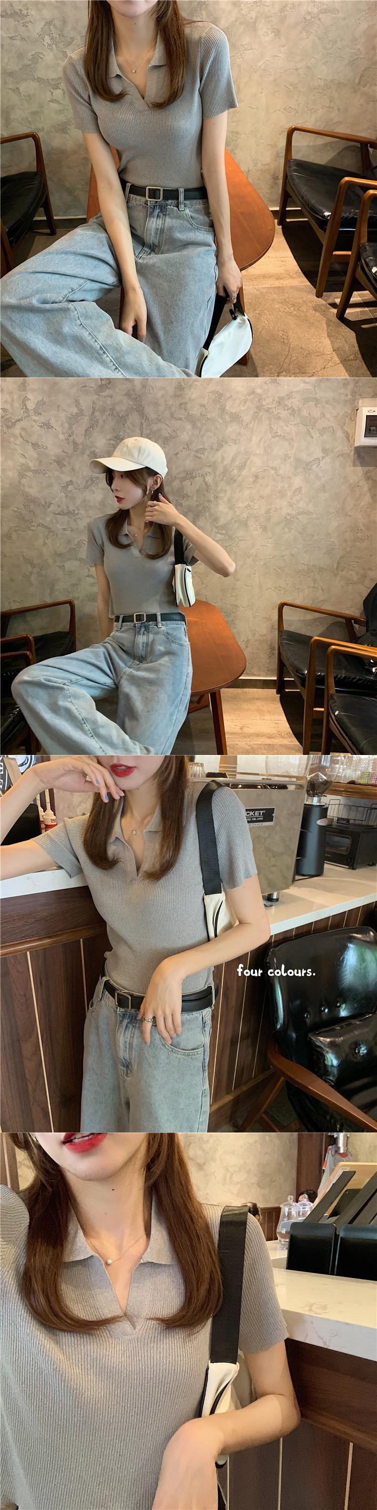 2022年春秋新作POLOカラーショートトップスレディースアイスシルクデザインニッチ半袖セーター薄夏 スプリング 春物 サマー 夏物 オータム 秋物 7460055524045229 | framboise21