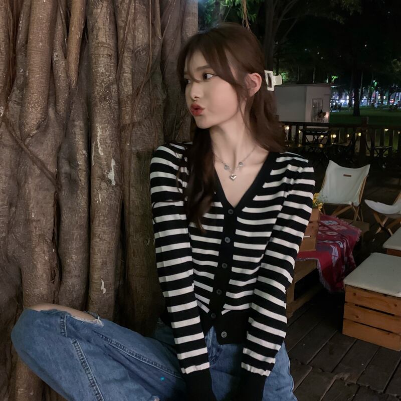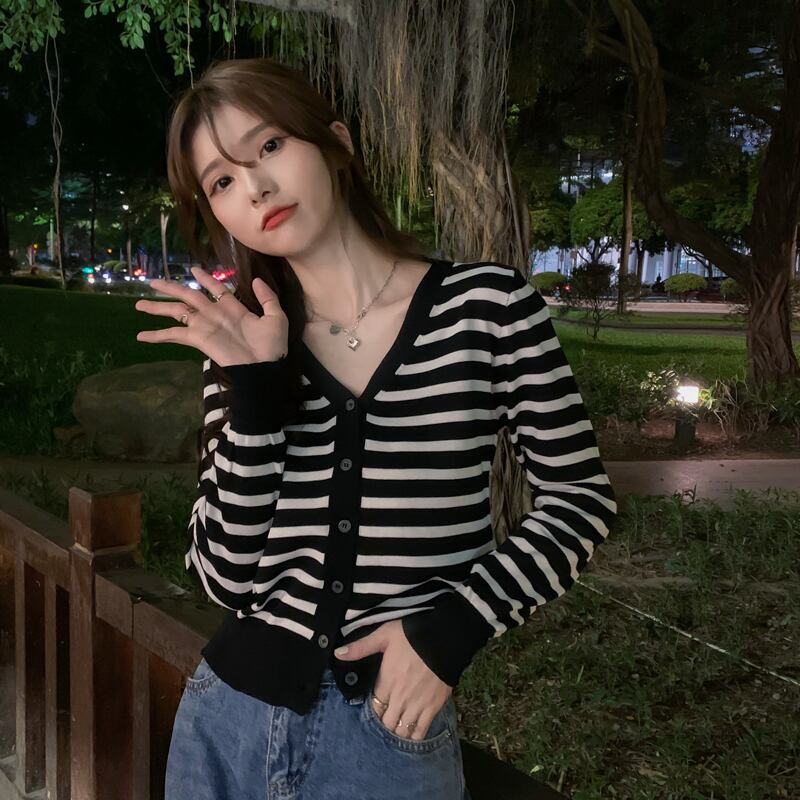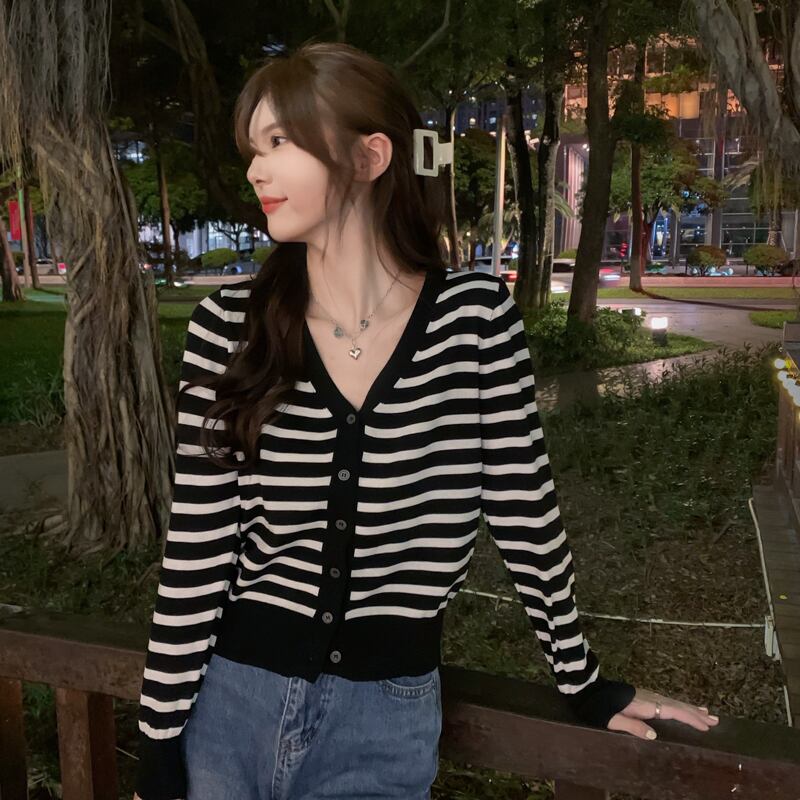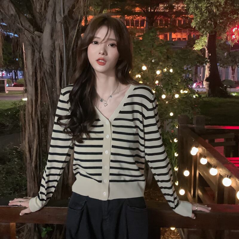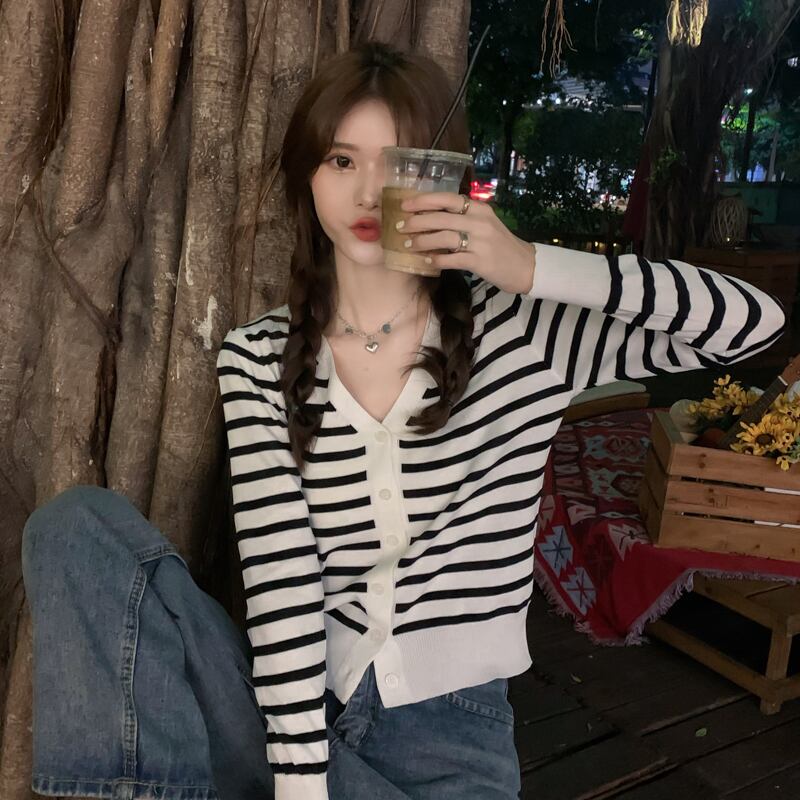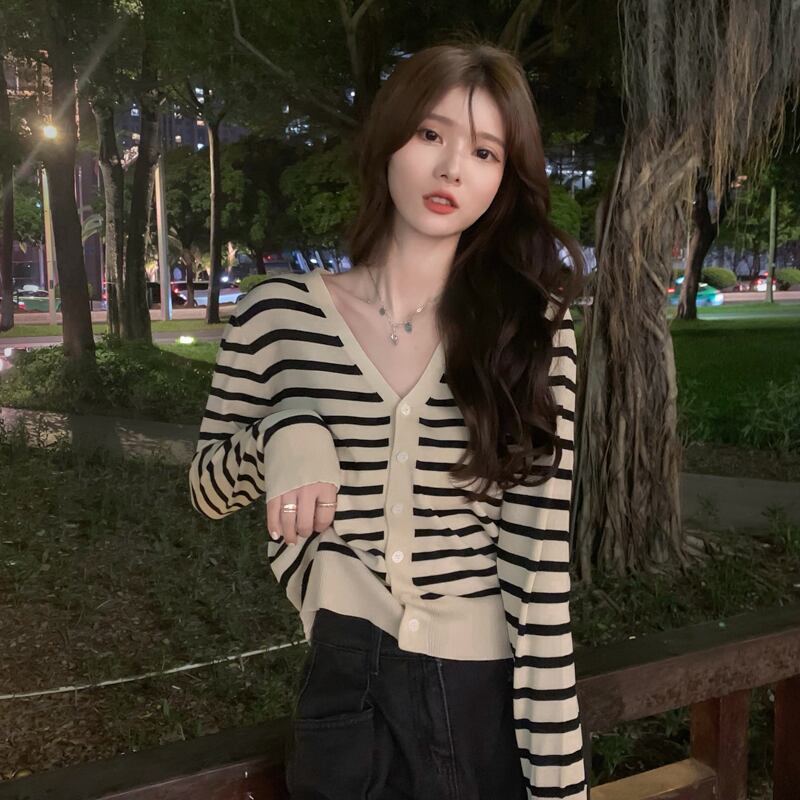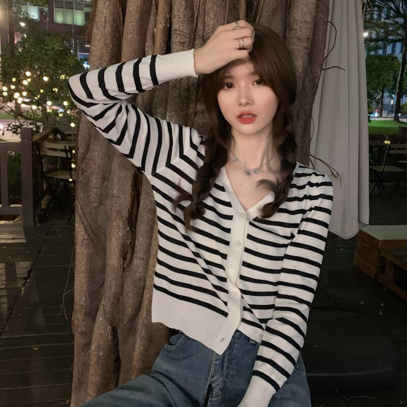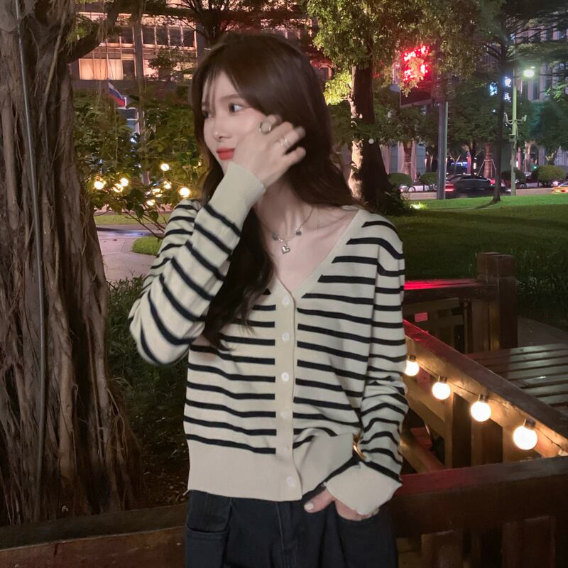 Vネックストライプニットカーディガンレディース長袖薄手デザイントップ2022春秋新作ニッチセーターコート ロング スプリング 春物 オータム 秋物 7460028192248703 | framboise21