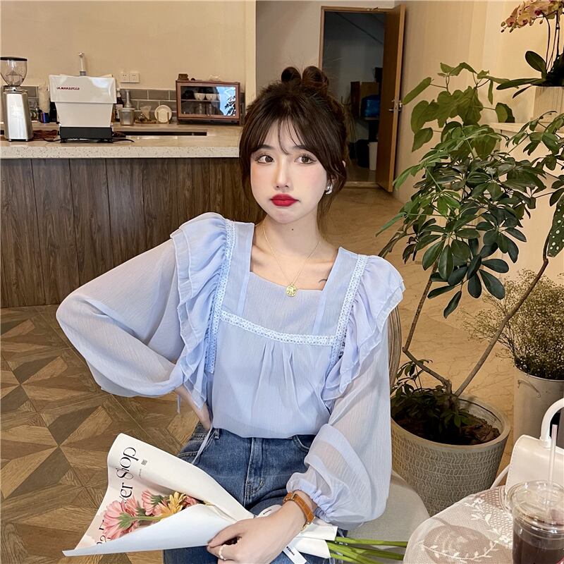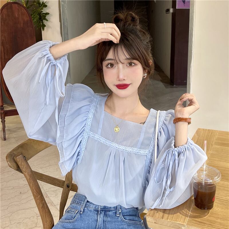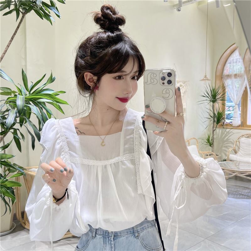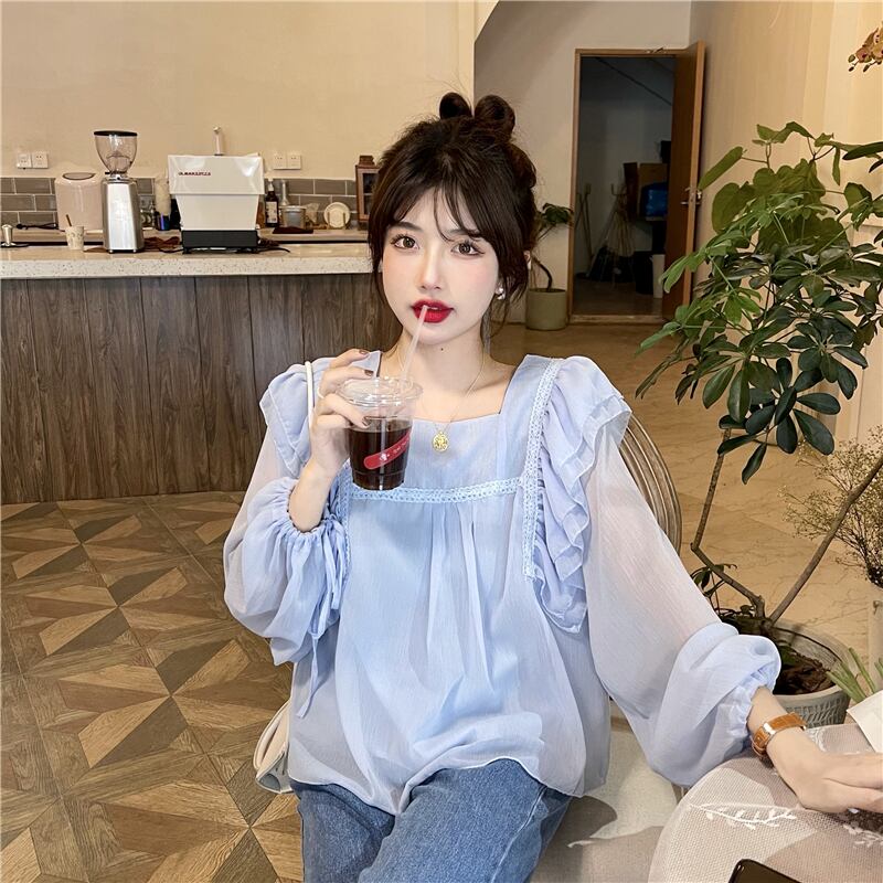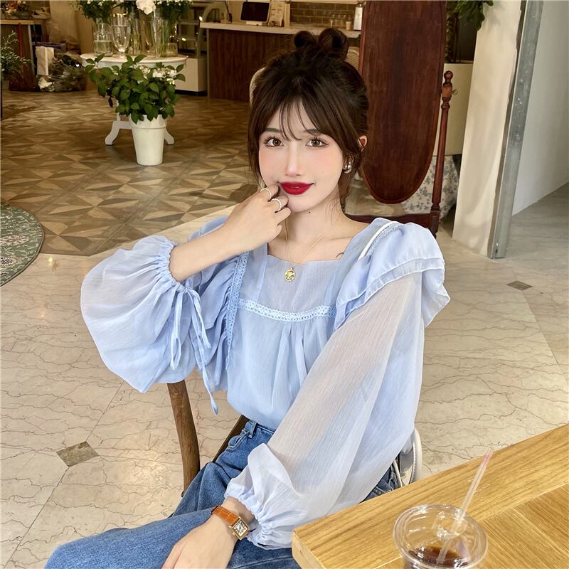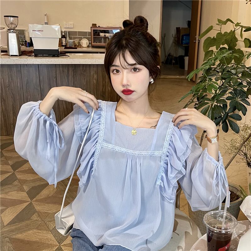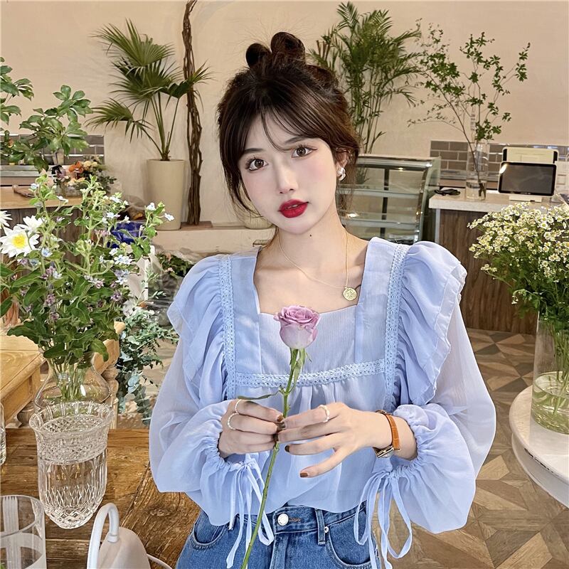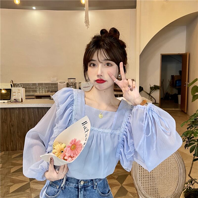 フレンチスウィートシャツレディースデザインセンスのニッチシックスーパーフェアリー優しい蓮の葉スクエアカラーパフスリーブシフォントップ 大人ガーリー キュート カジュアル スクウェア 7460043746393529 | framboise21