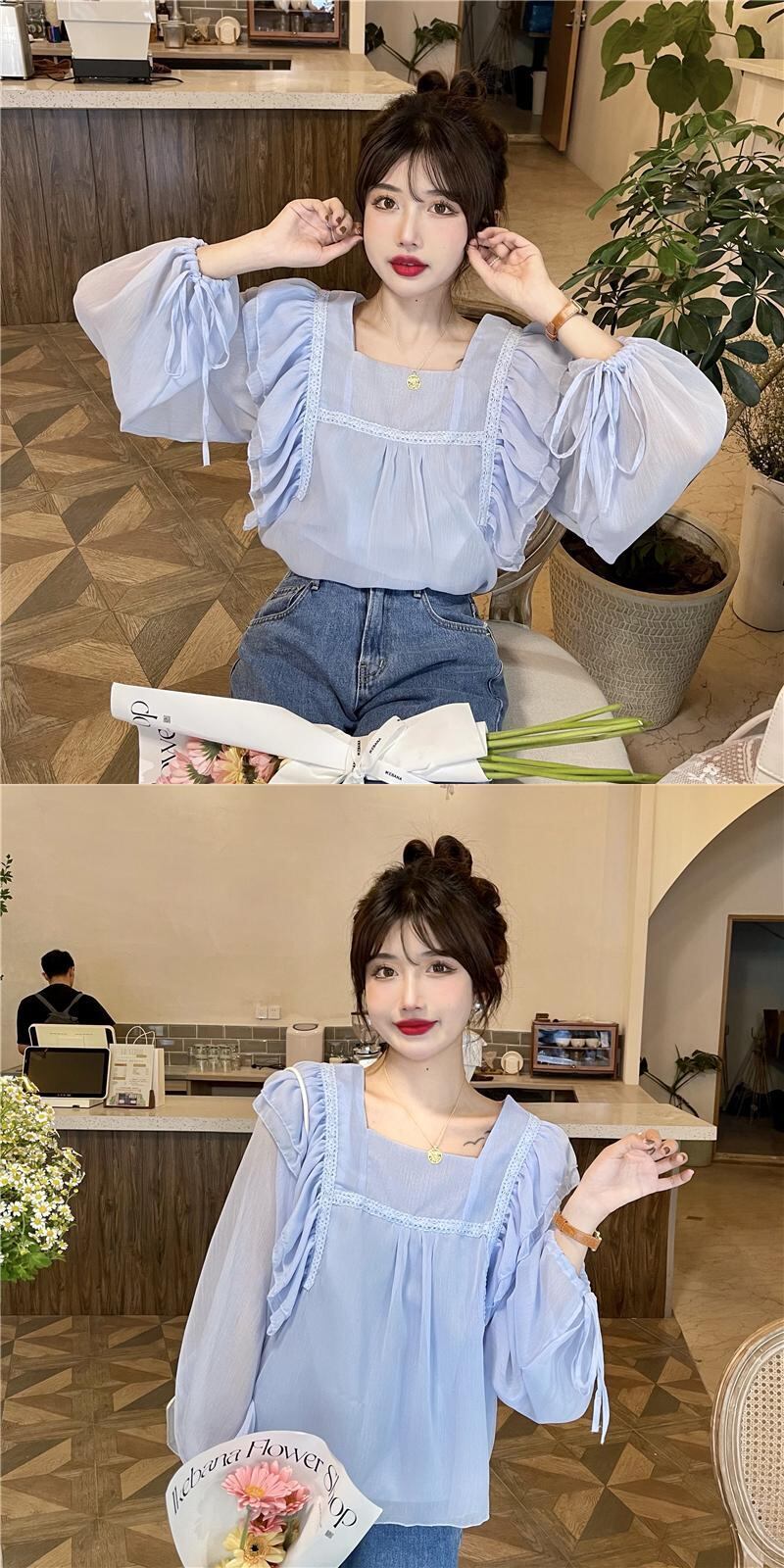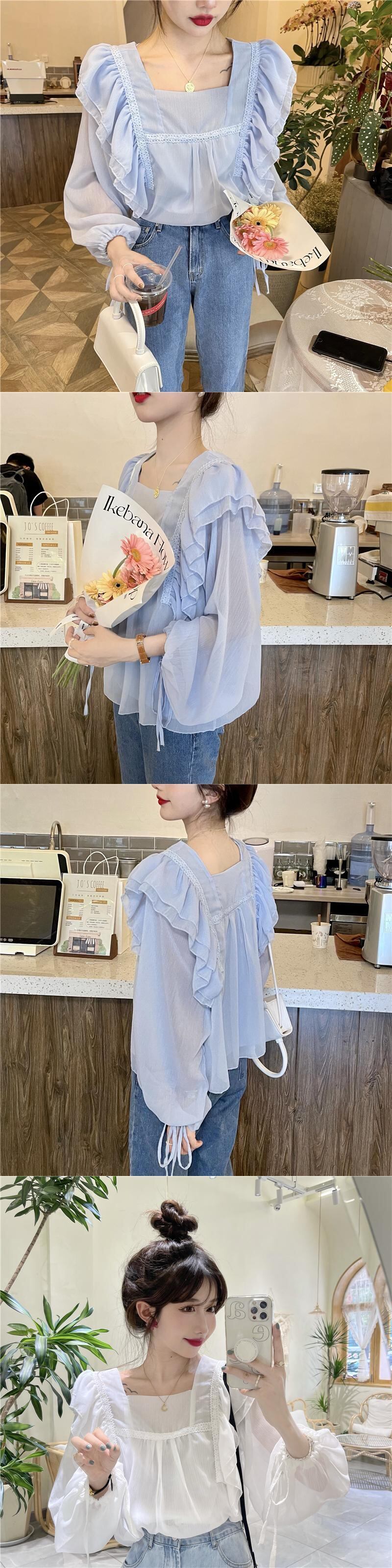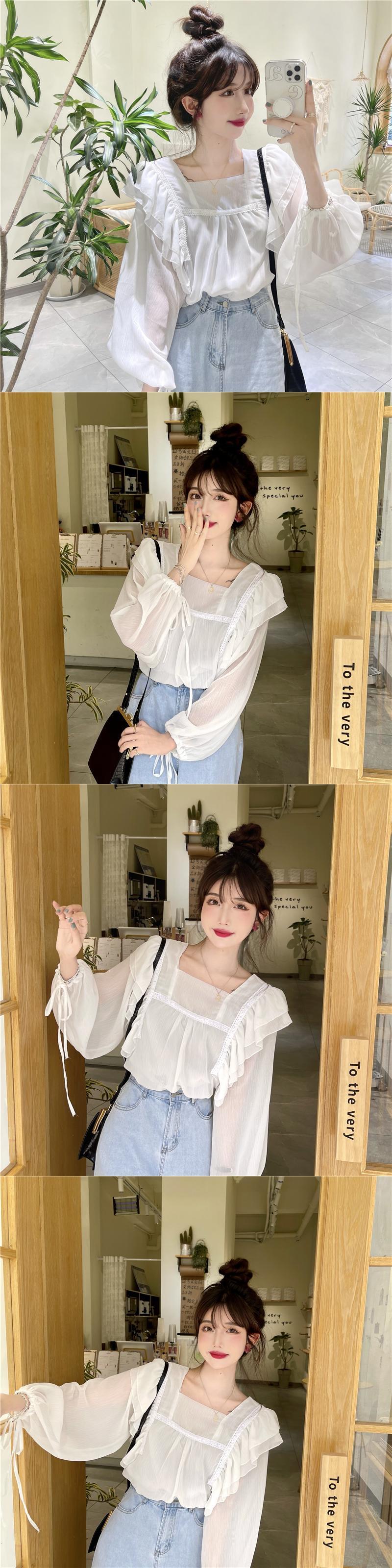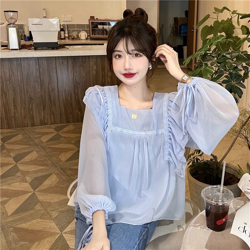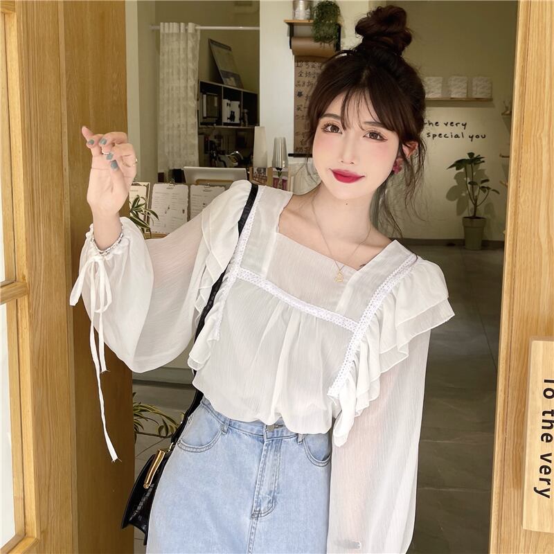 フレンチスウィートシャツレディースデザインセンスのニッチシックスーパーフェアリー優しい蓮の葉スクエアカラーパフスリーブシフォントップ 大人ガーリー キュート カジュアル スクウェア 7460043746393529 | framboise21