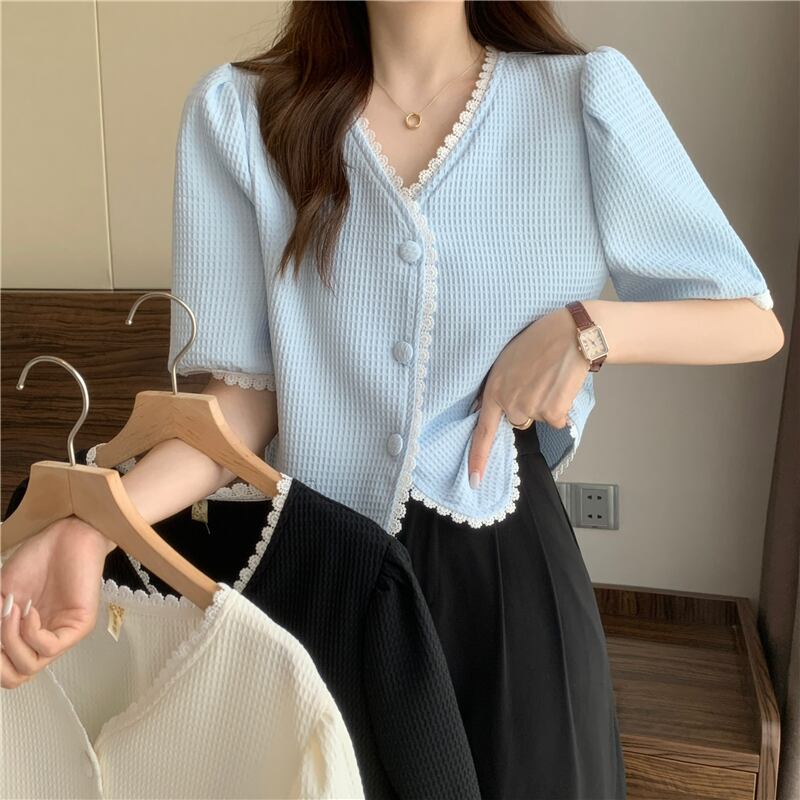 ブルーVネック半袖シャツレディース夏2022年新作ヨーロピアングッズシャツデザインセンスニッチスモールフレグランスウィンドジャケットトップ サマー 夏物 746004183580206 | framboise21