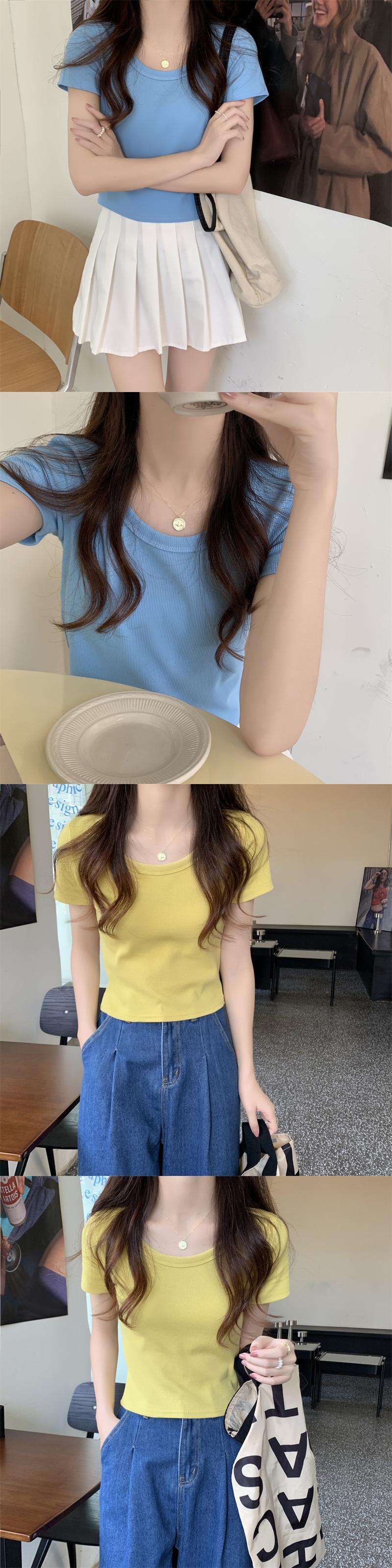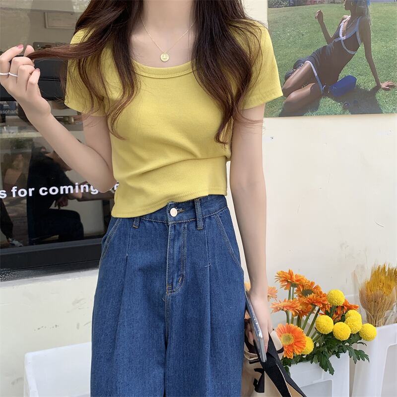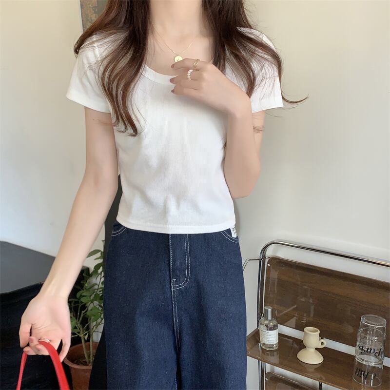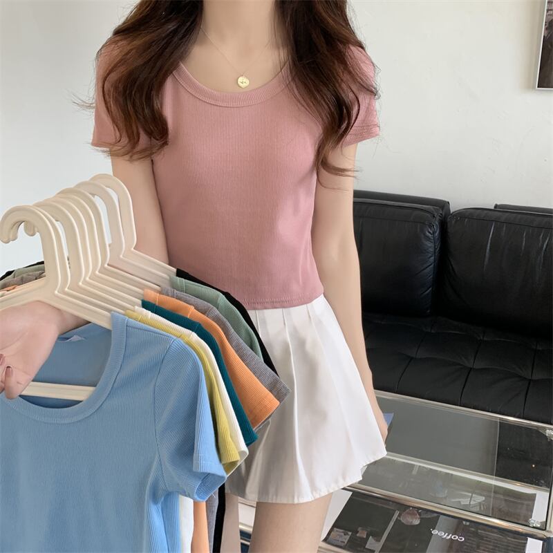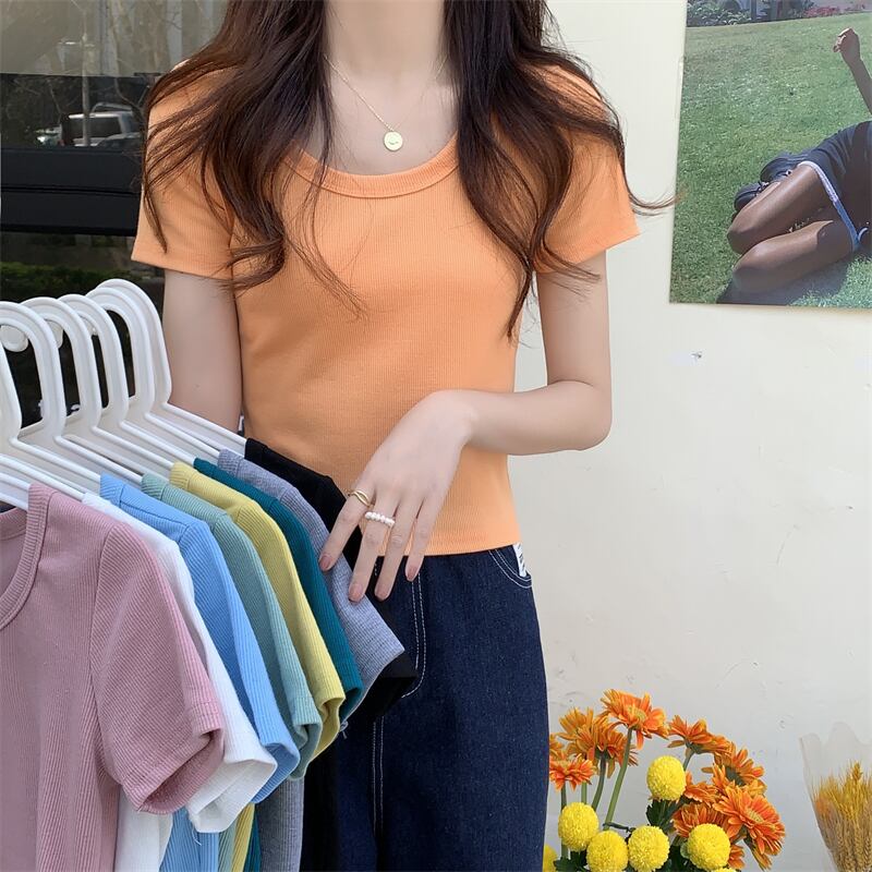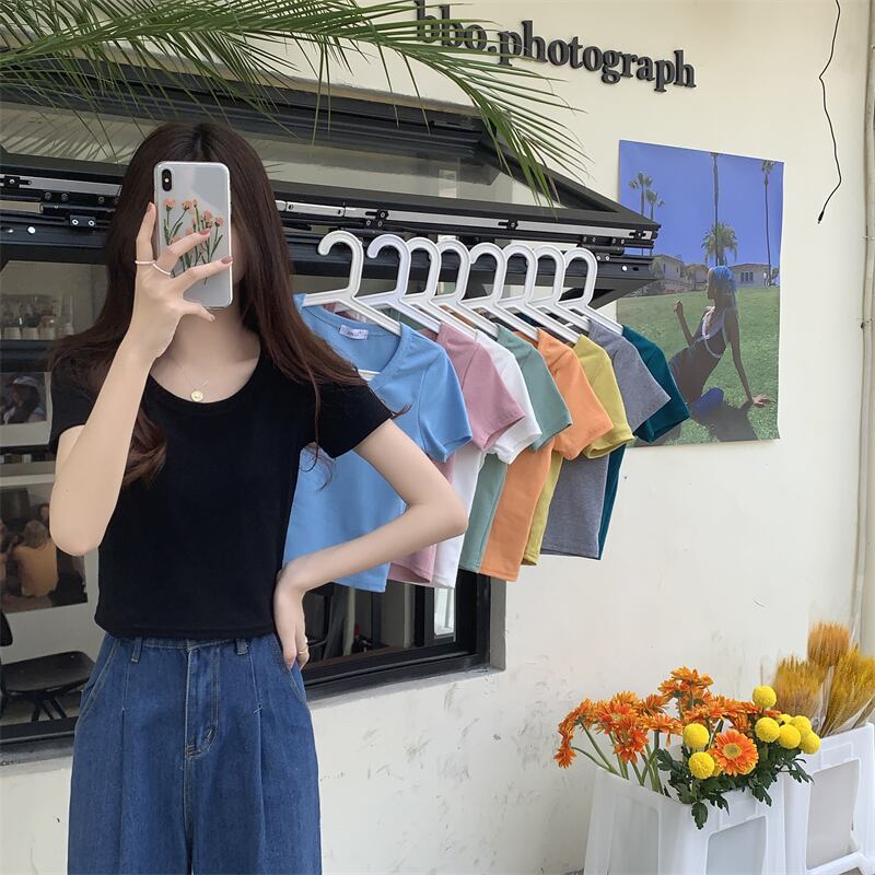 ラウンドネック半袖Tシャツレディース2022夏の新しいスリムフィットと薄いオールマッチショートハイウエストトップイントレンディ サマー 夏物 Oネック 7460079408130567 | framboise21
