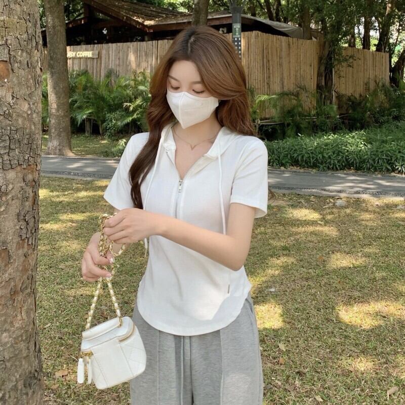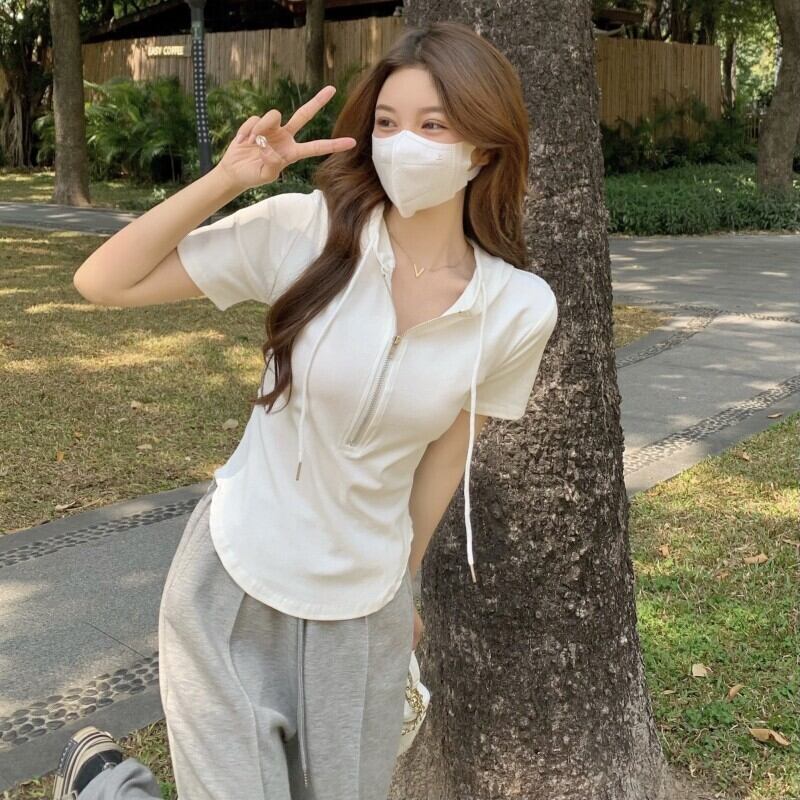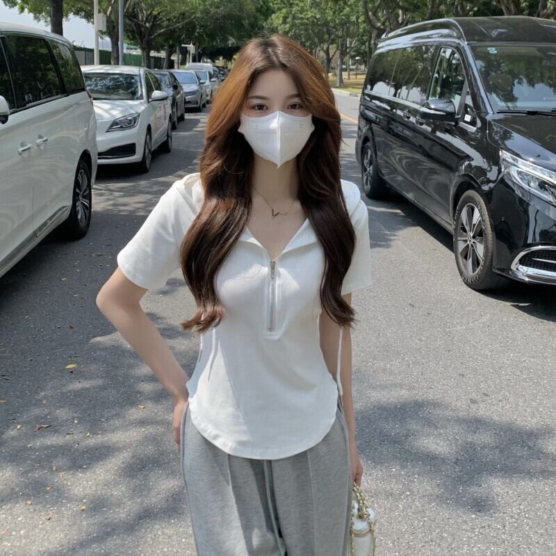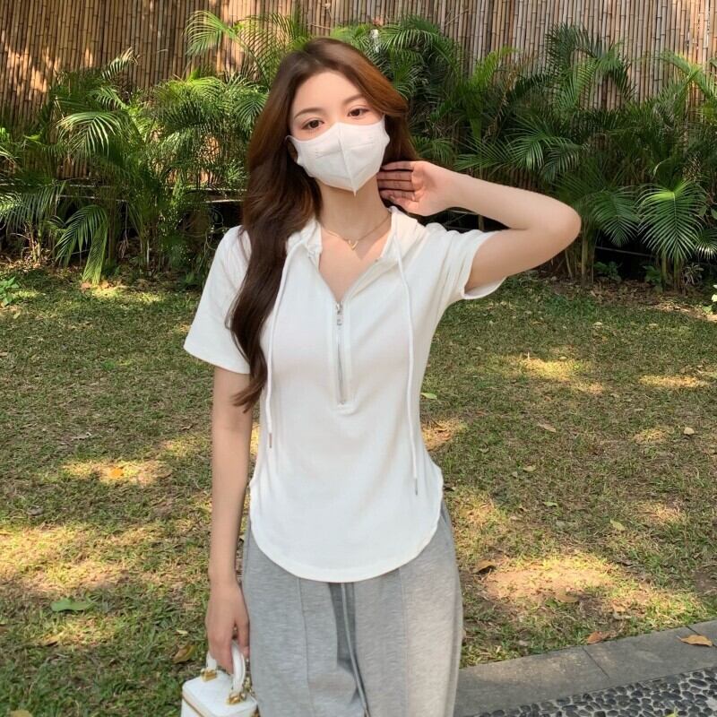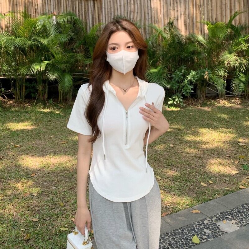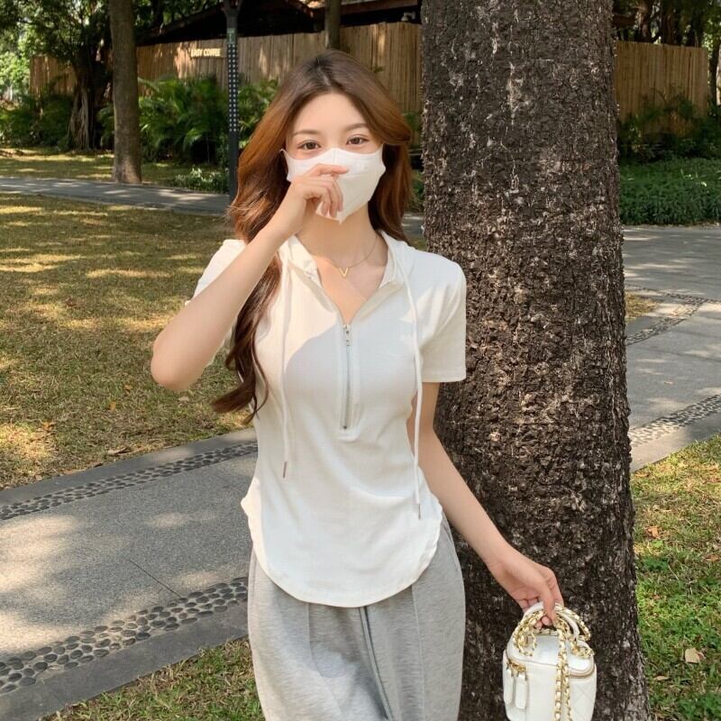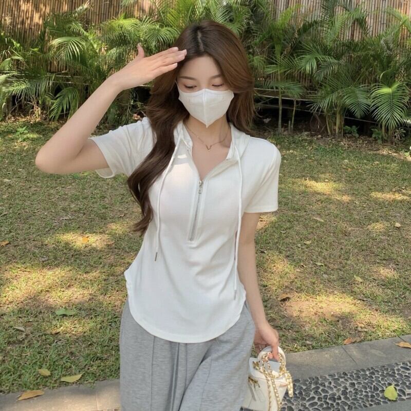 白い不規則な半袖フード付きTシャツ女性の2022年の新しい純粋な欲望Tシャツフロントショルダースリムスポーツトップ夏 ホワイト サマー 夏物 ピュア 7460054684890524 | framboise21