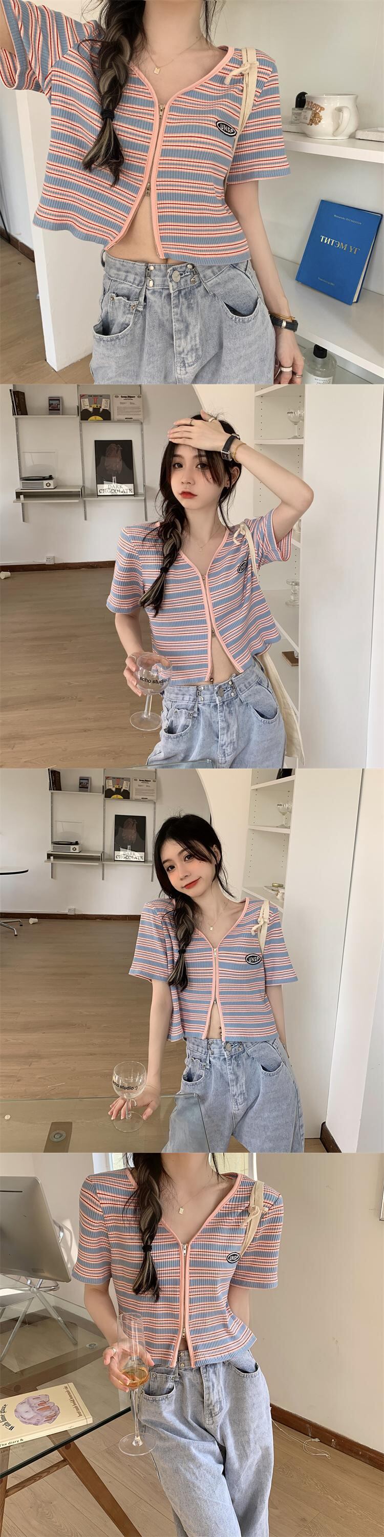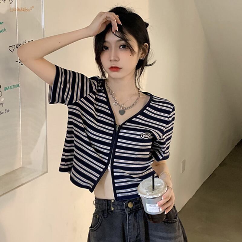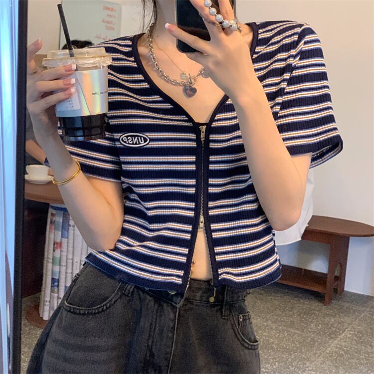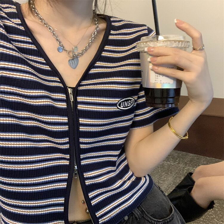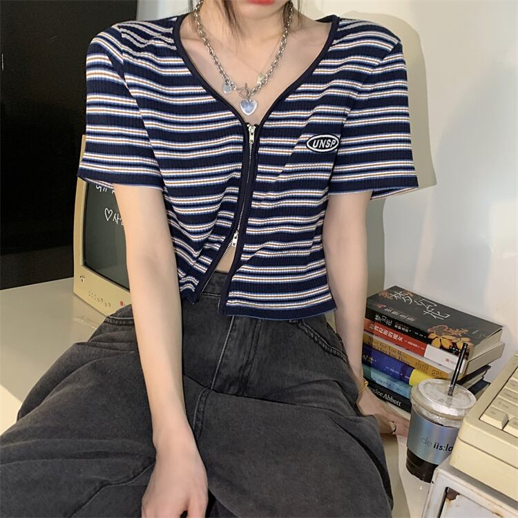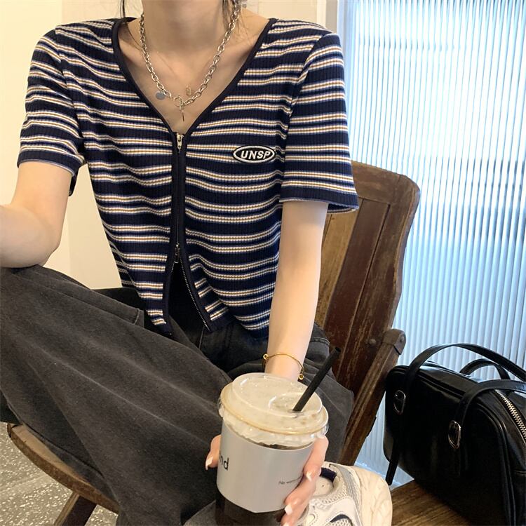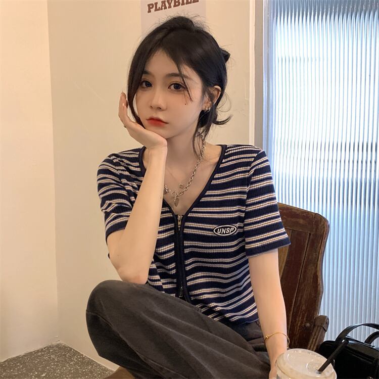 ストライプ半袖TシャツレディースサマーデザインセンスニッチVネックシックスモールスウィートショートトップインタイド 大人ガーリー キュート カジュアル 夏物 7460051880527549 | framboise21