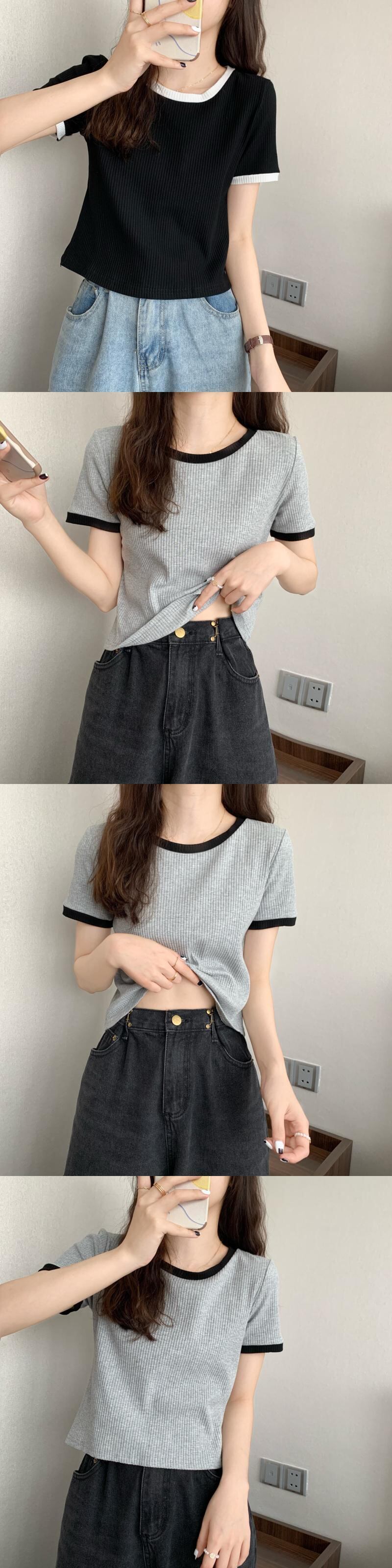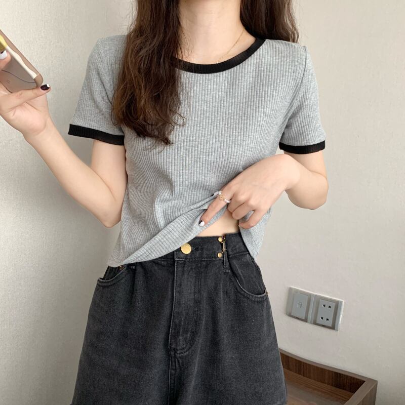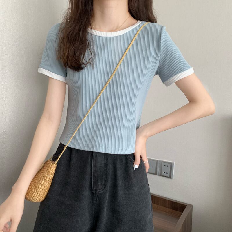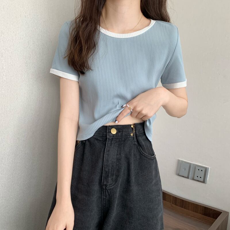 コントラストカラーの半袖Tシャツレディースショートハイウエストサマースリムフィットと薄手のデザインシックなアイスシルクニットトップインタイド ハイウェスト 夏物 7460074133229852 | framboise21