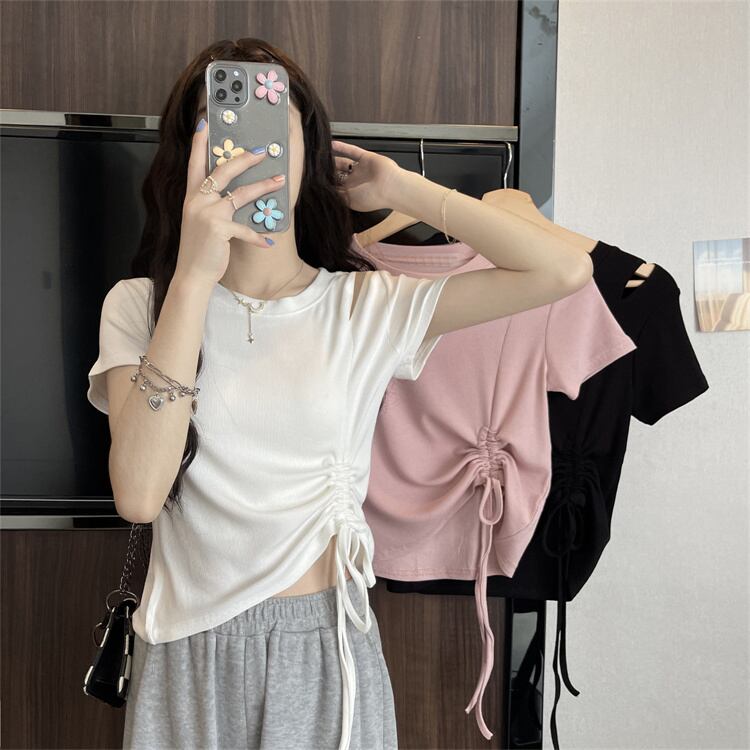 不規則なデザインセンスドローストリングオフショルダー半袖Tシャツレディースサマーニューホワイトタイトフィットショートハイウエストコットントップ 夏物 7460082613568315 | framboise21