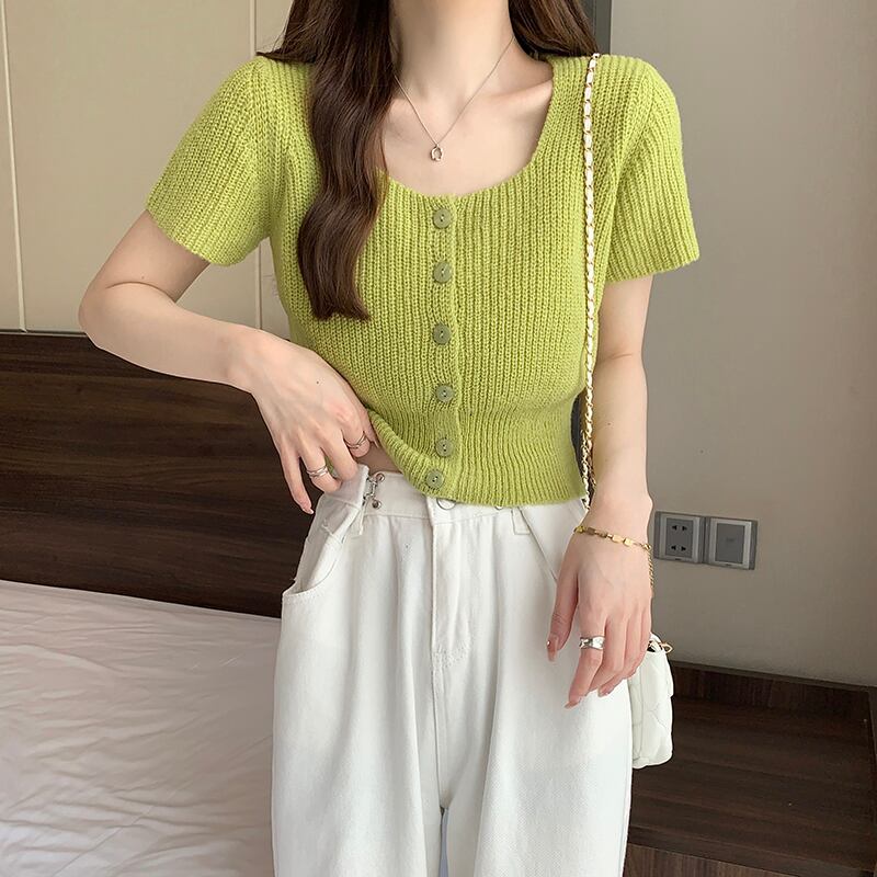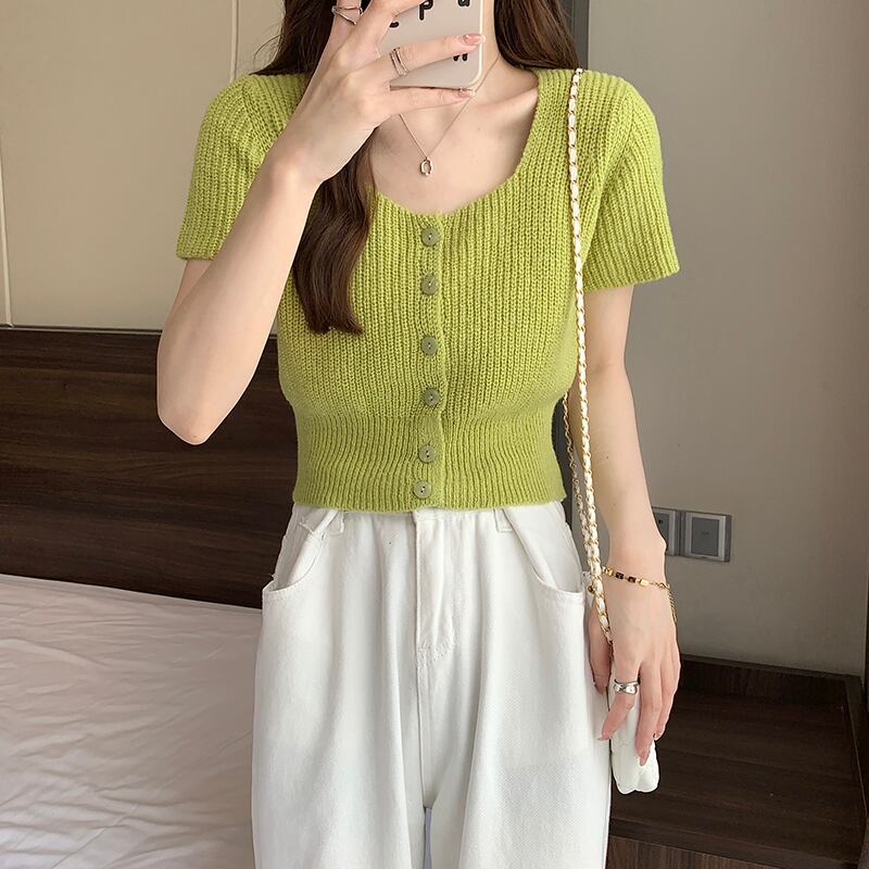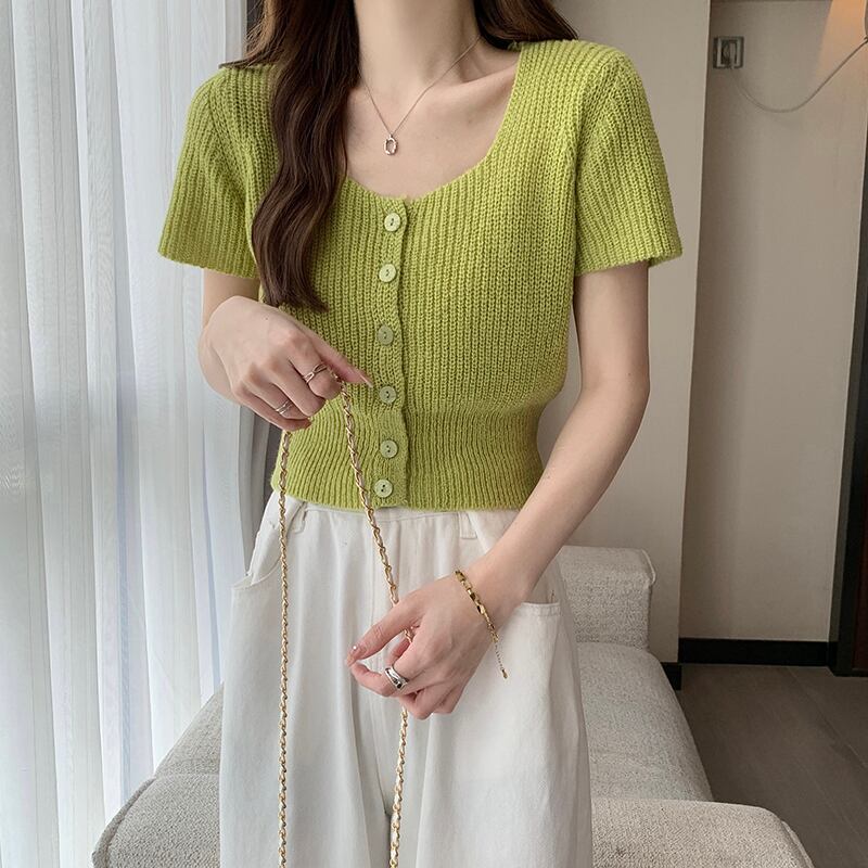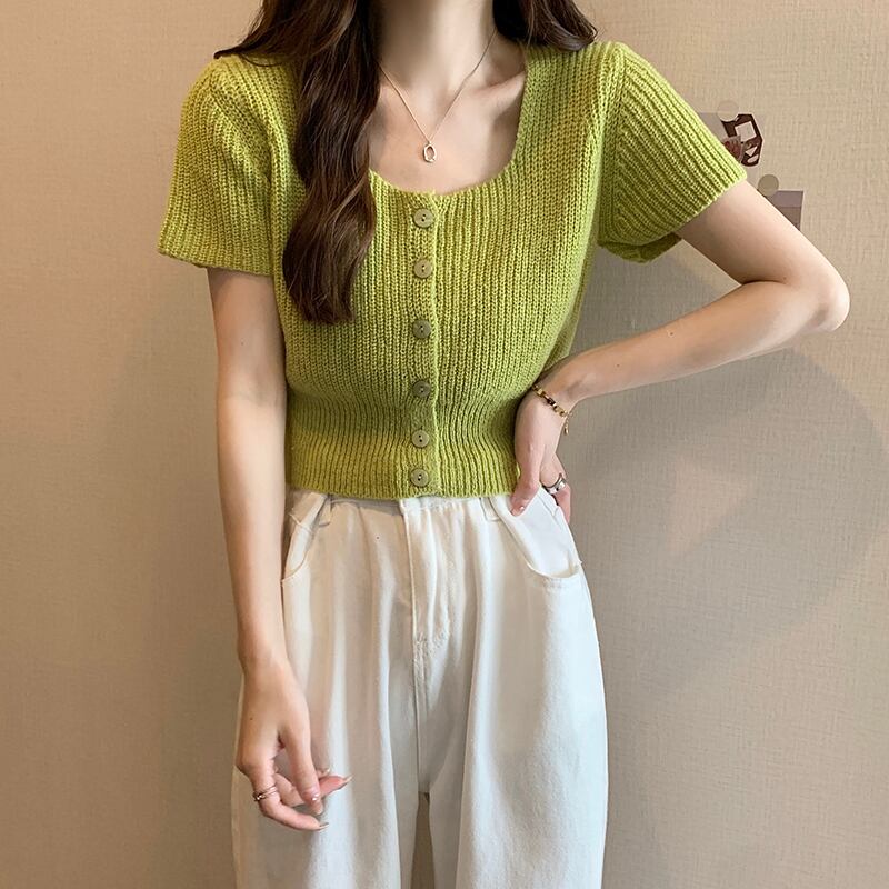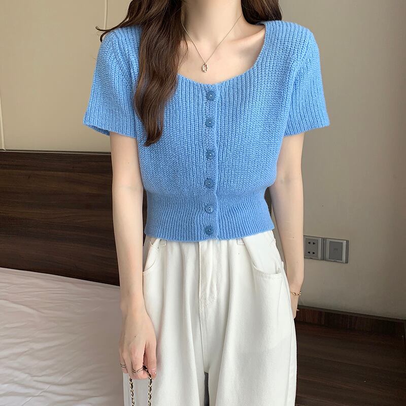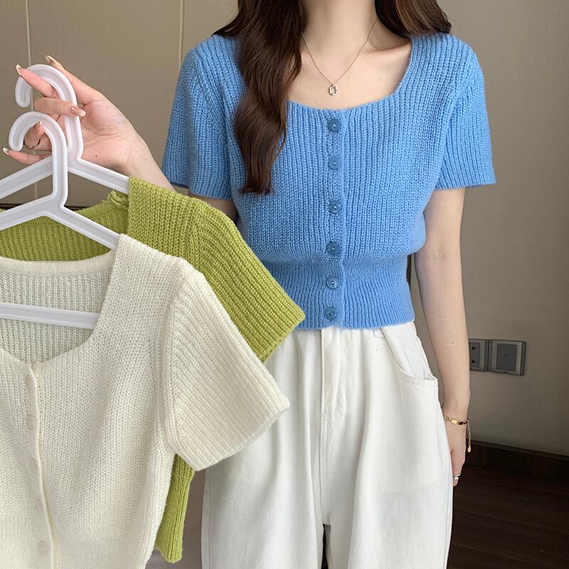ホワイトスクエアネックニット半袖Tシャツレディース2022年夏新作デザインスモール香港フレーバーシックショートトップ サマー 夏物 スクウェア 746008453874762 | framboise21