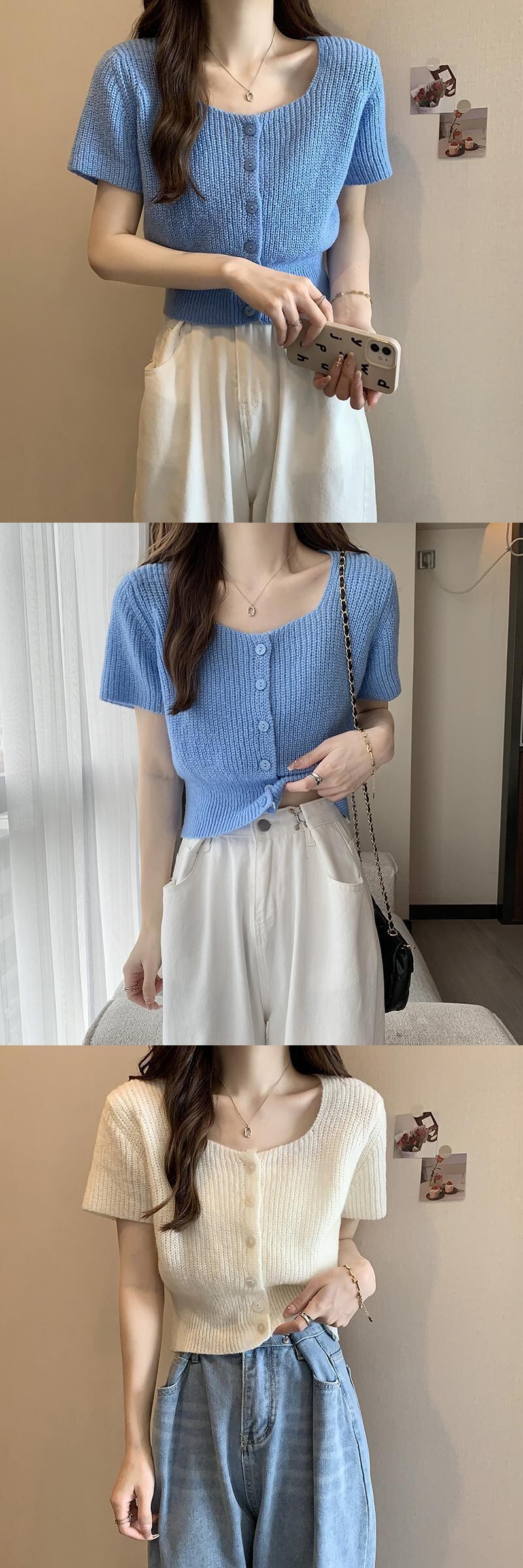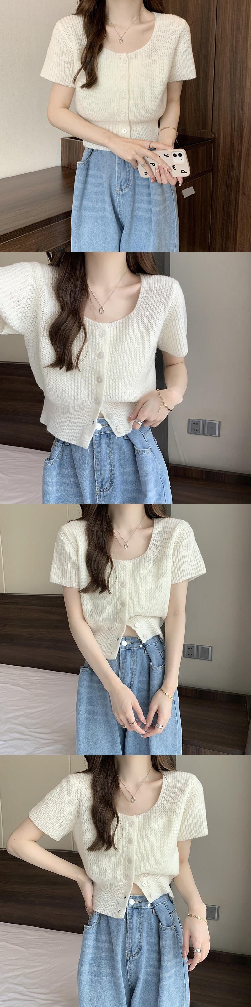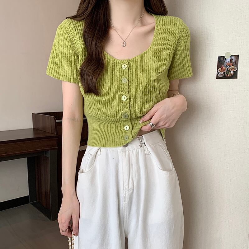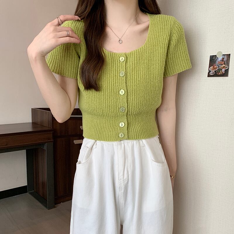 ホワイトスクエアネックニット半袖Tシャツレディース2022年夏新作デザインスモール香港フレーバーシックショートトップ サマー 夏物 スクウェア 746008453874762 | framboise21