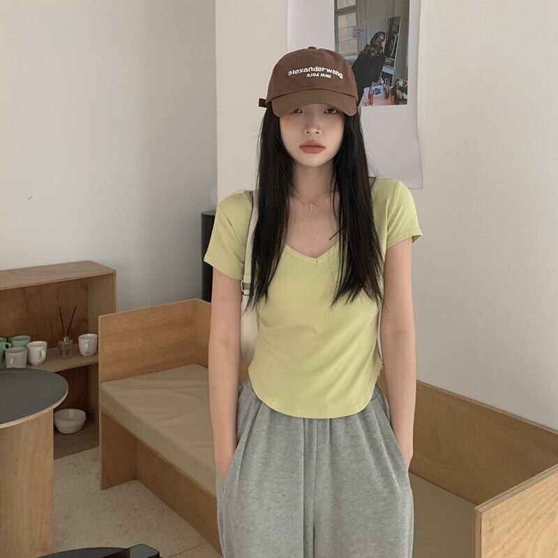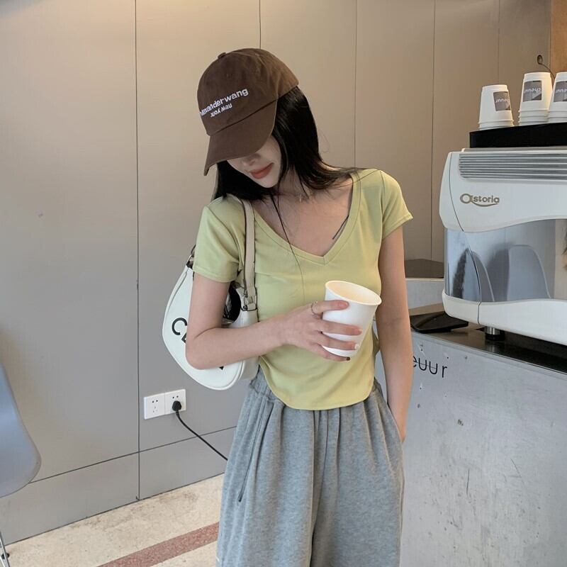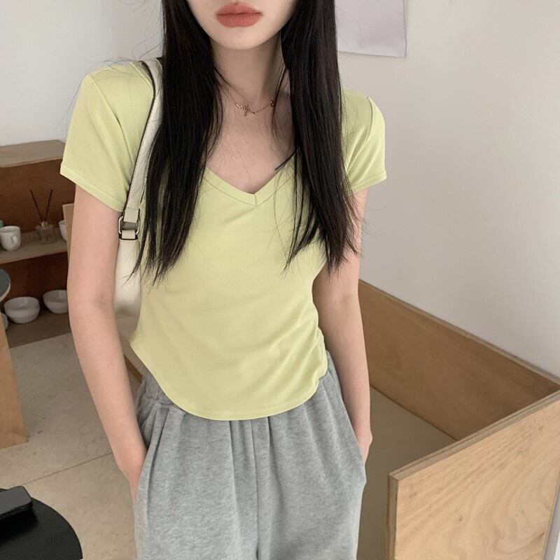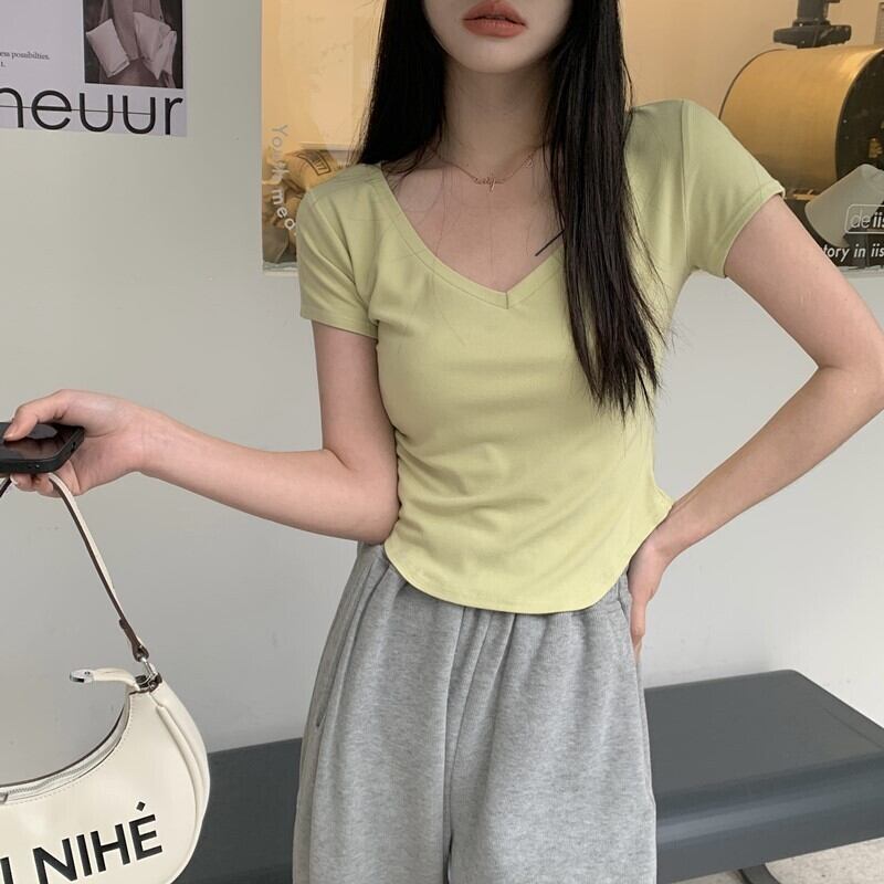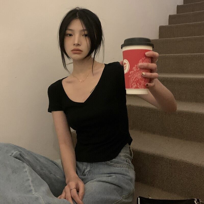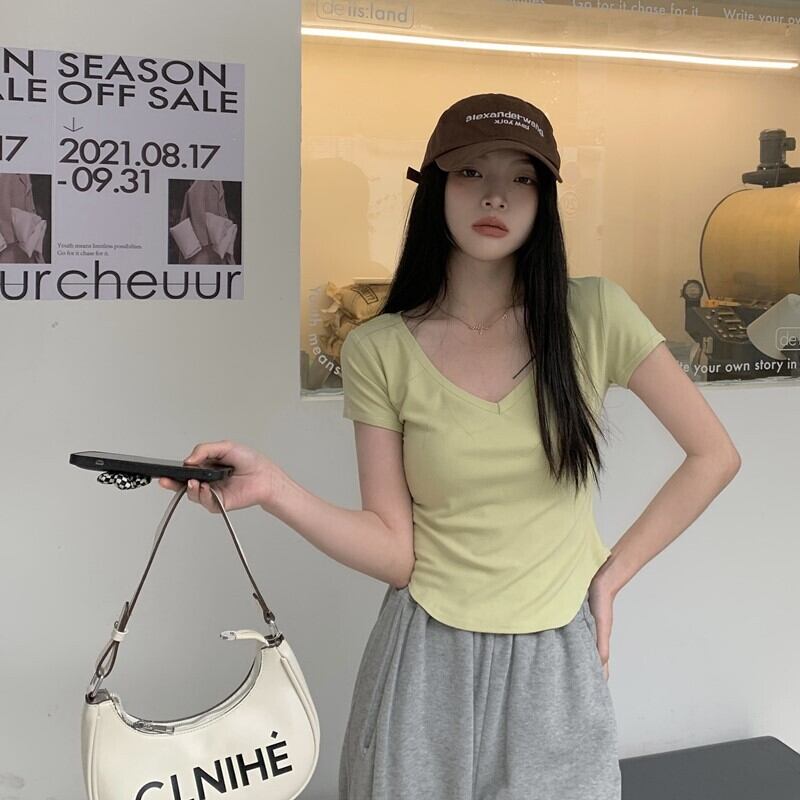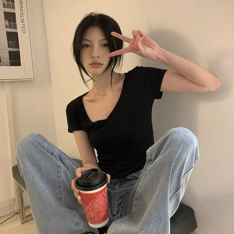 ピュアデザイアイレギュラーVネック半袖Tシャツレディースサマーデザインニッチハイウエストショートスリムフィットフロントショルダートップ 夏物 7460099715075371 | framboise21