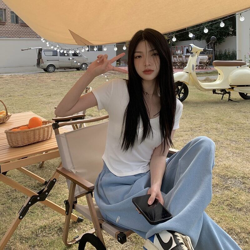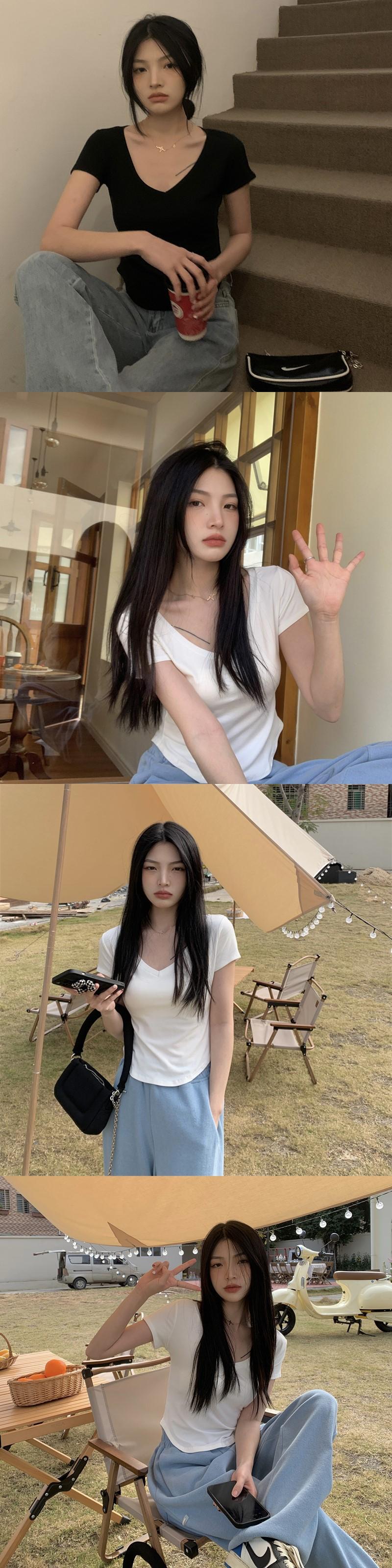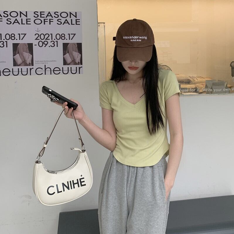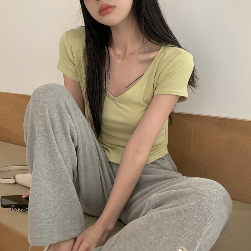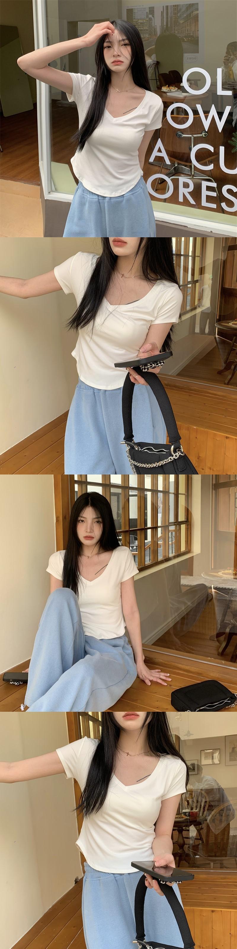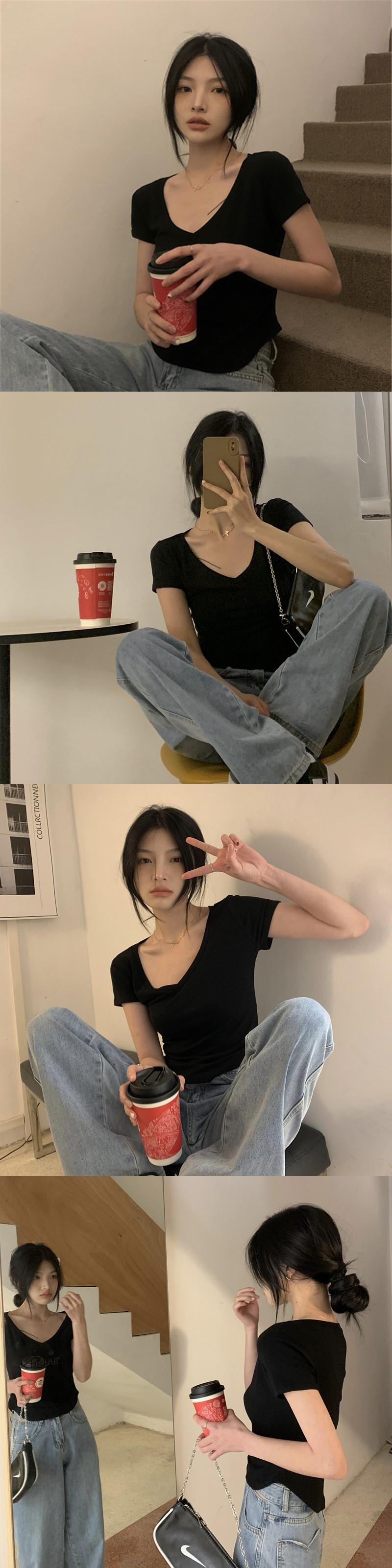 ピュアデザイアイレギュラーVネック半袖Tシャツレディースサマーデザインニッチハイウエストショートスリムフィットフロントショルダートップ 夏物 7460099715075371 | framboise21
