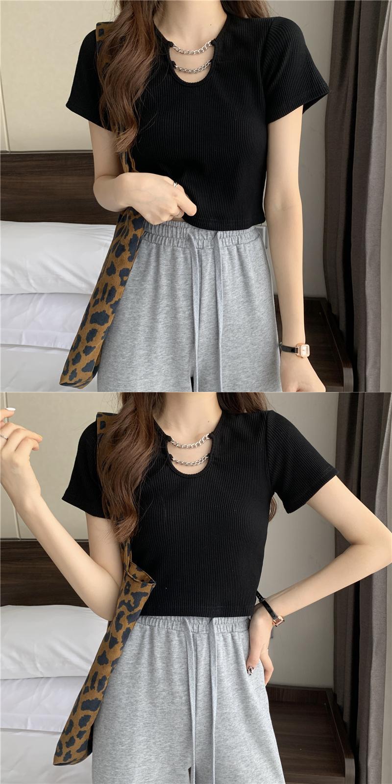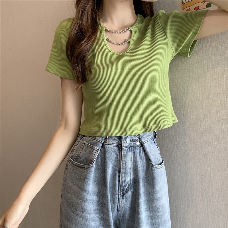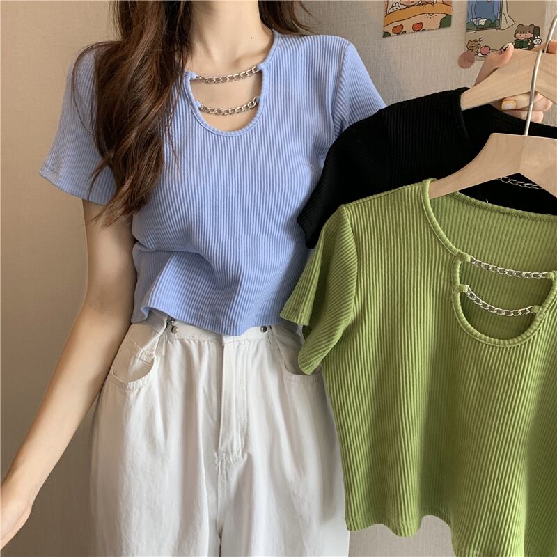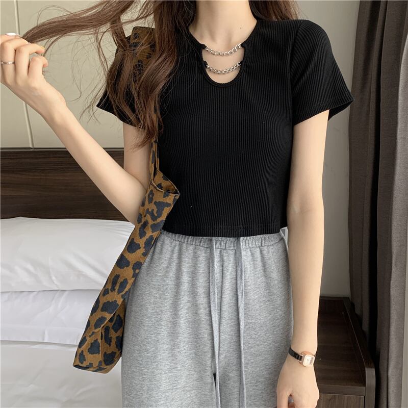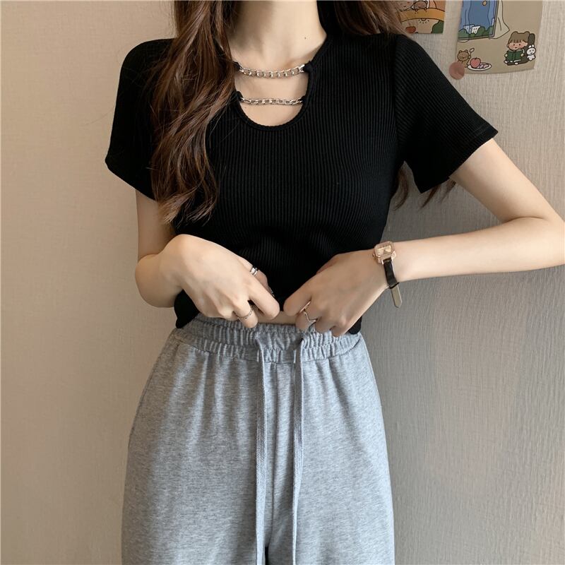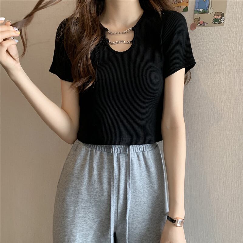 黒のTシャツレディース半袖スリムデザインセンスニッチハイウエストサマーアイスシルクニットセーターチェーンショートトップトレンディ ブラック 夏物 7460012122752256 | framboise21