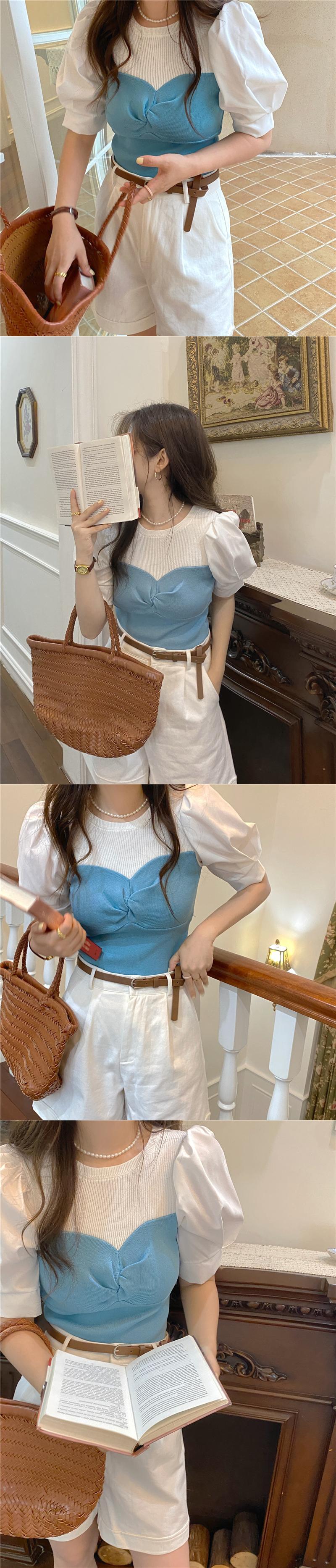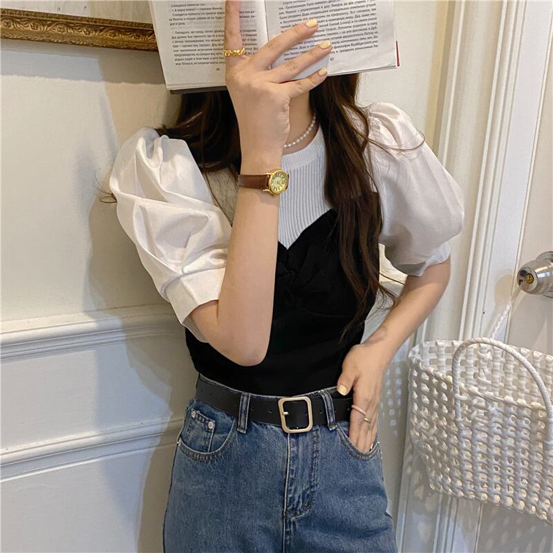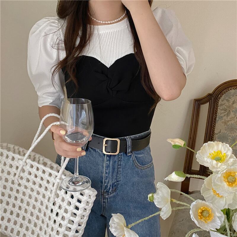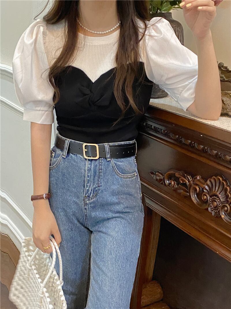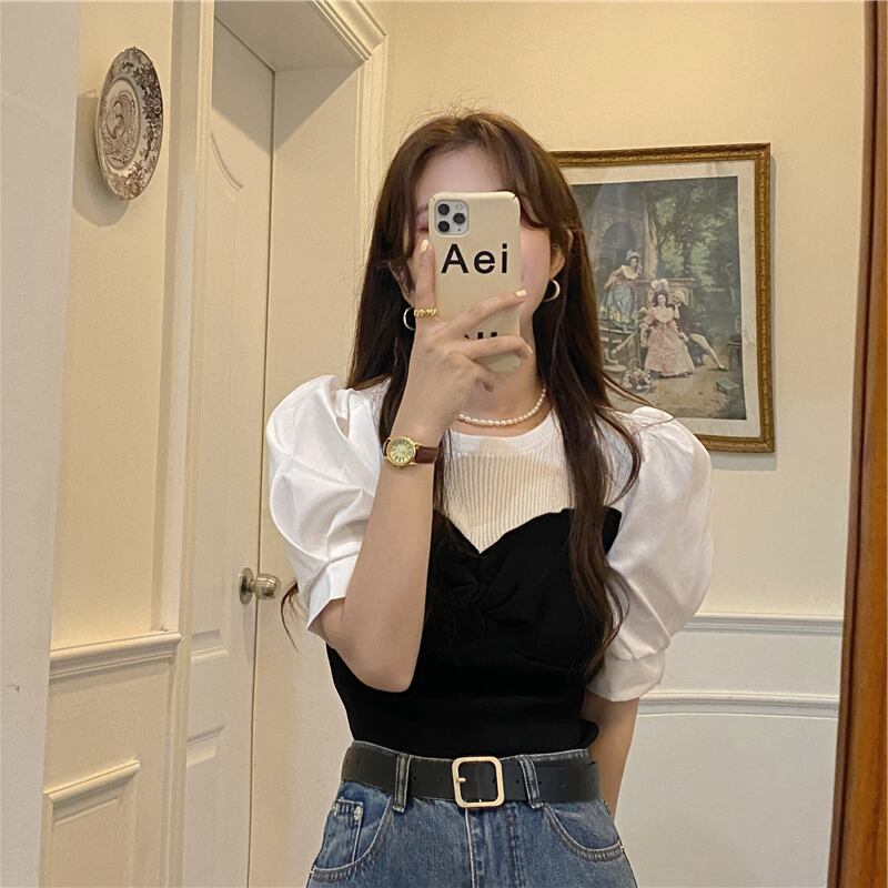 フランスのパフスリーブフェイクツーピース半袖Tシャツレディースイントレンディな夏のデザインニッチシックでユニークなショートトップ サマー 夏物 7460021290582818 | framboise21