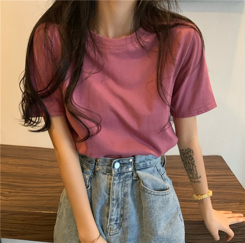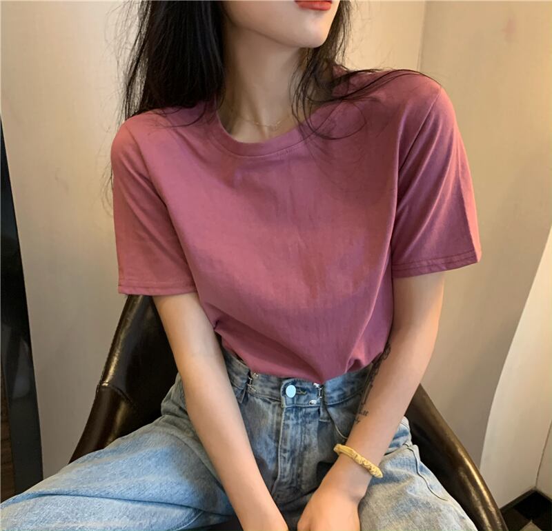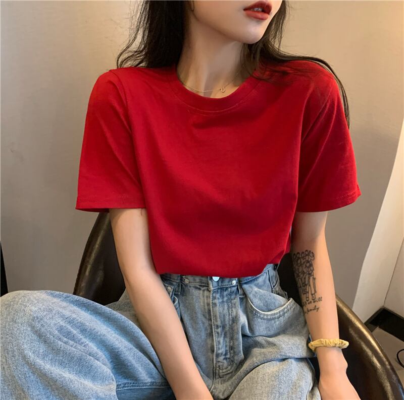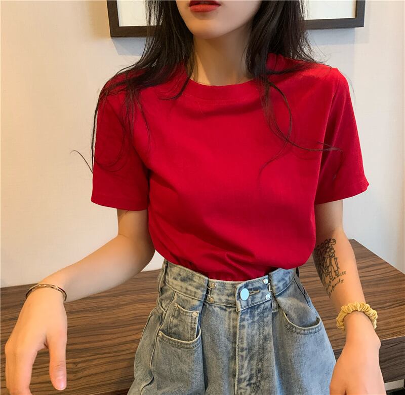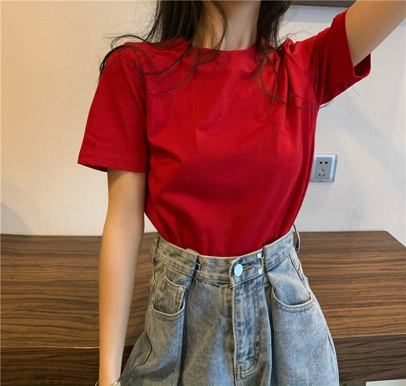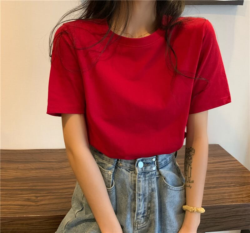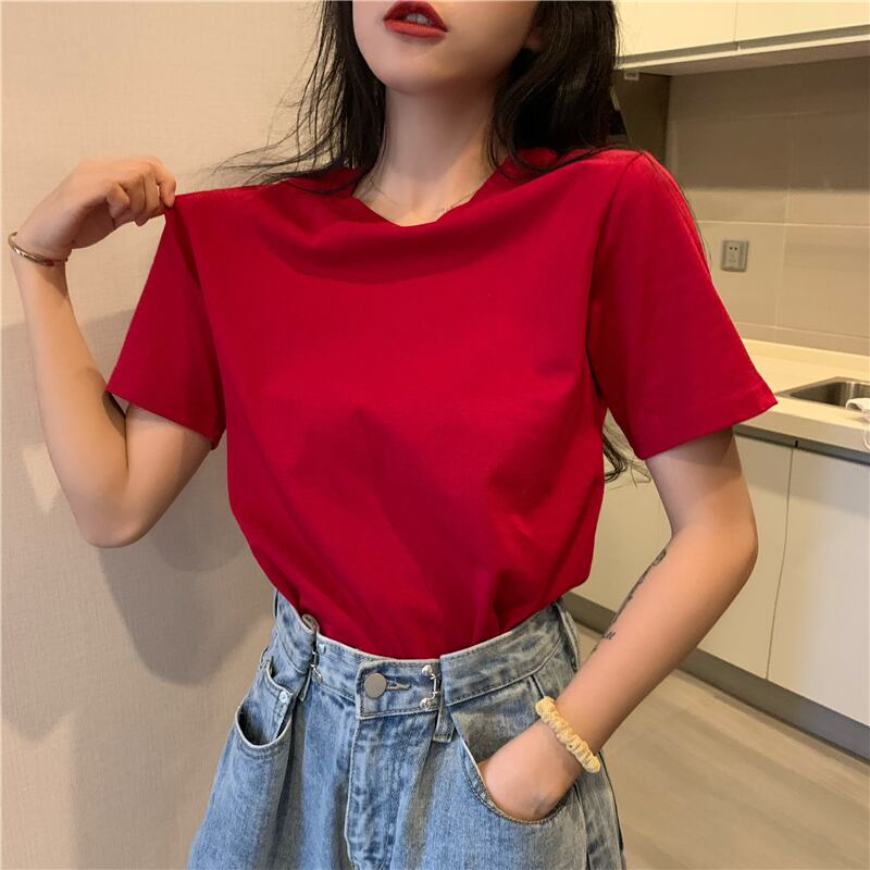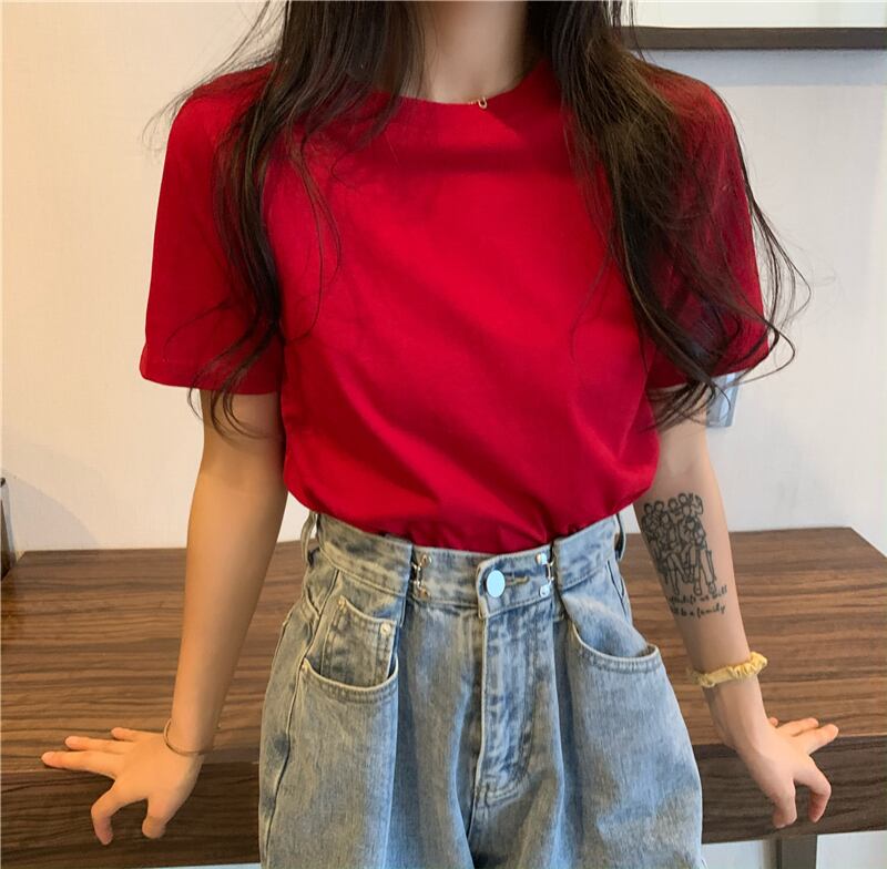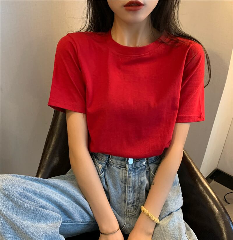 シンプルな赤い半袖Tシャツ女性の夏のルーズで薄いフロントショルダースーパートップラウンドネックハーフスリーブコットンTシャツインタイド レッド サマー 夏物 Oネック 7460033841519895 | framboise21
