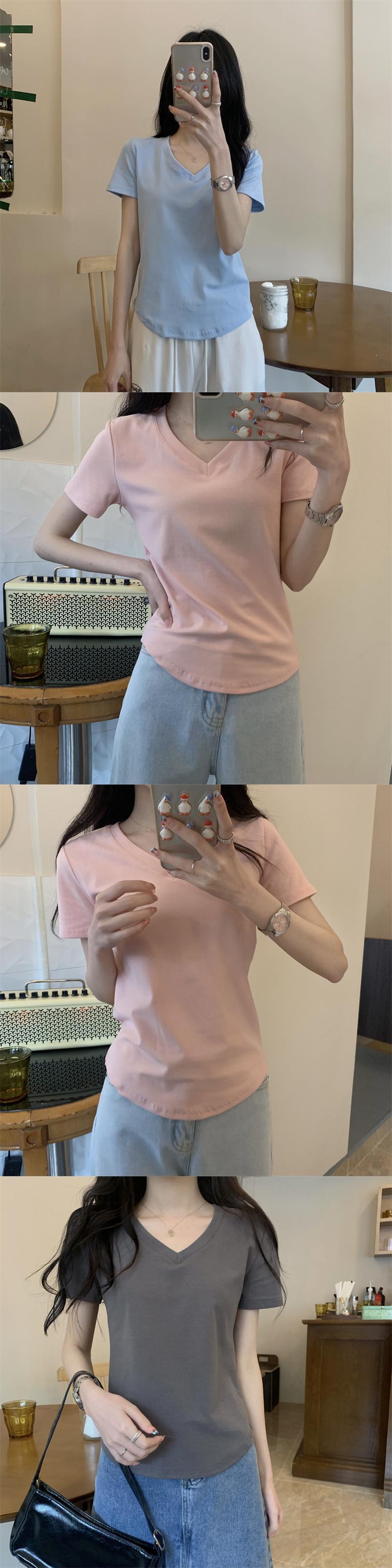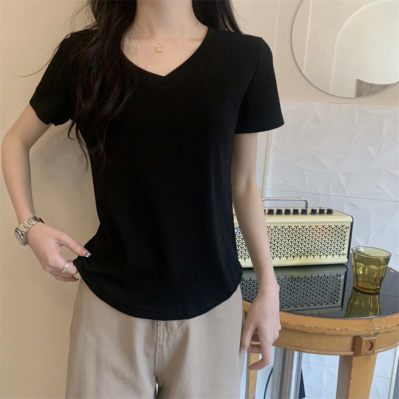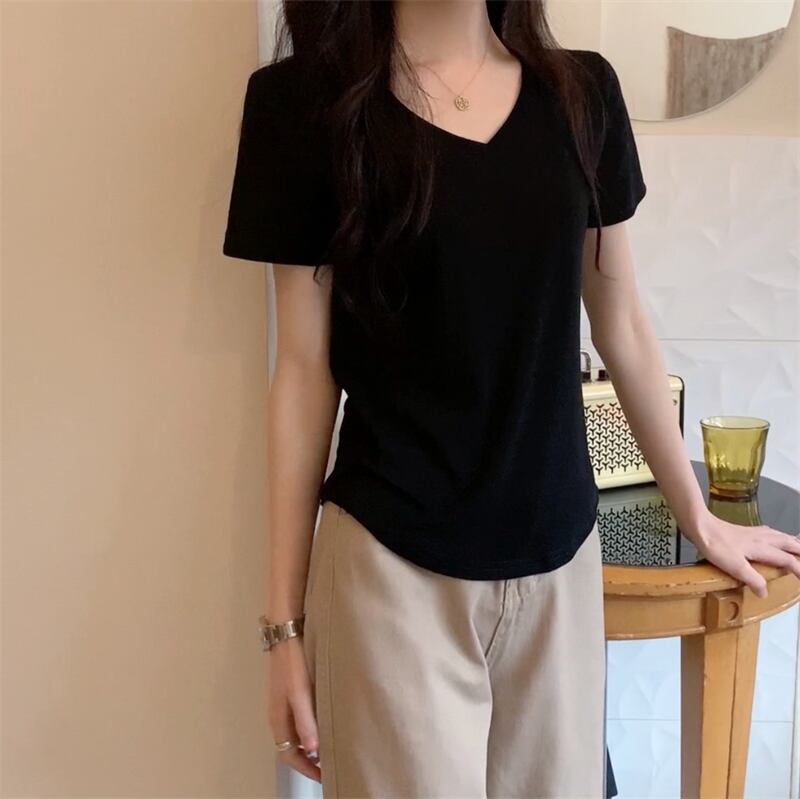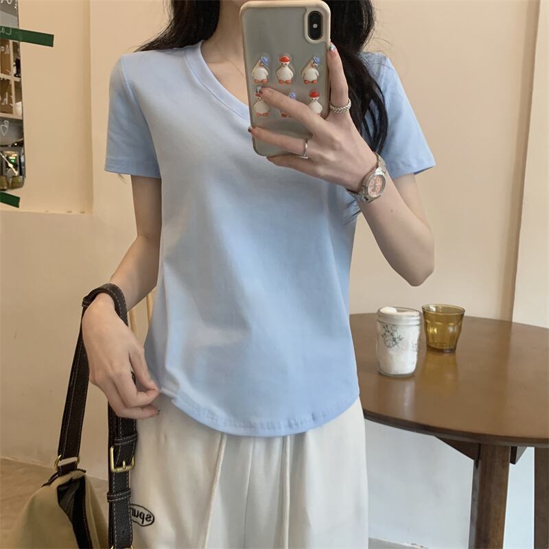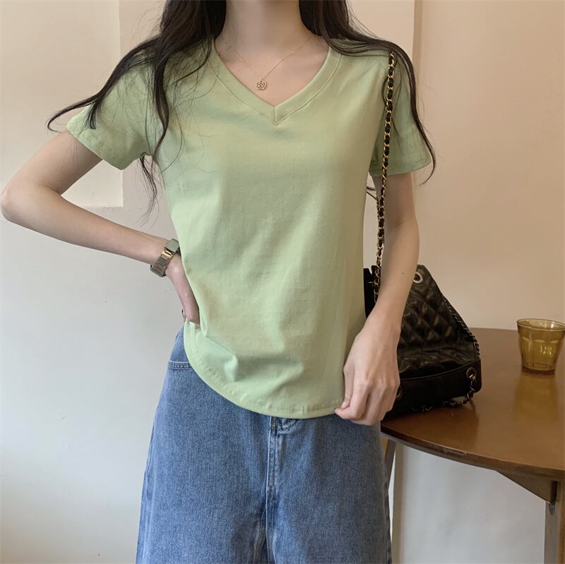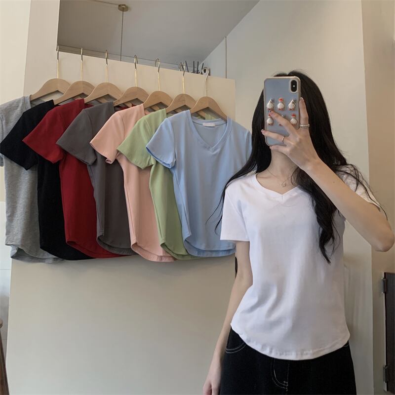 2022年夏の新作レディースデコレーションボディスリミングウエストショートトップキャンディーカラー多用途Vネック半袖Tシャツトレンド サマー 夏物 7460046883325437 | framboise21
