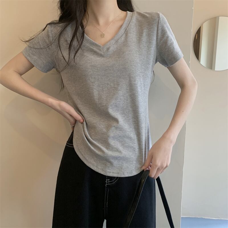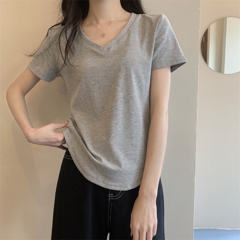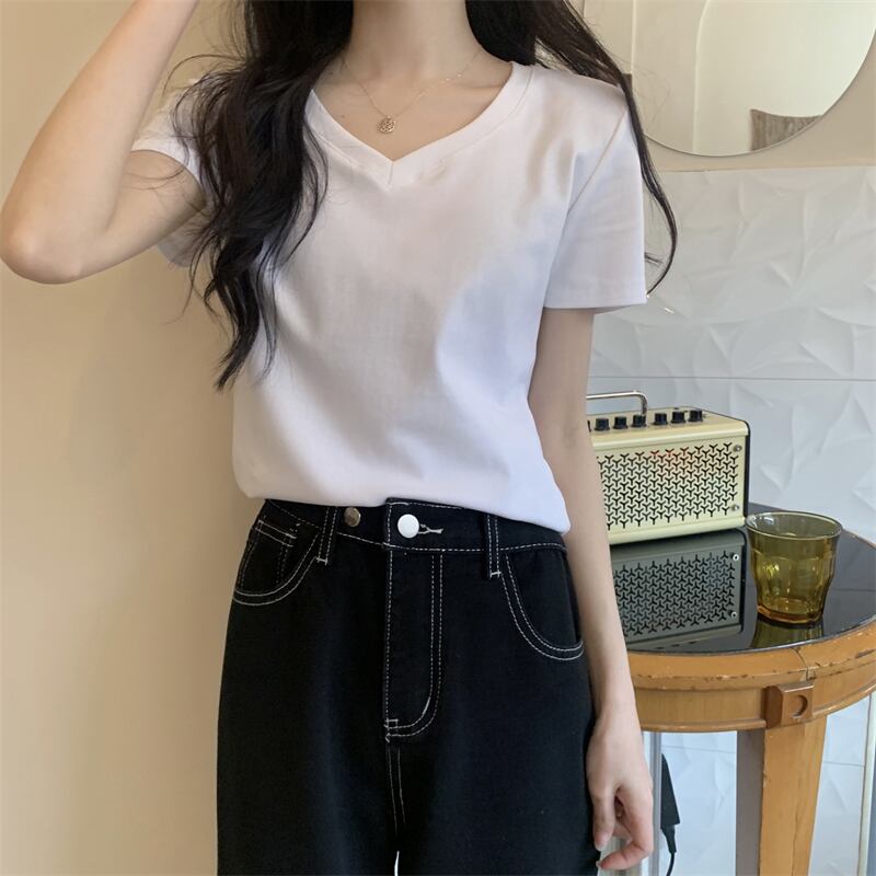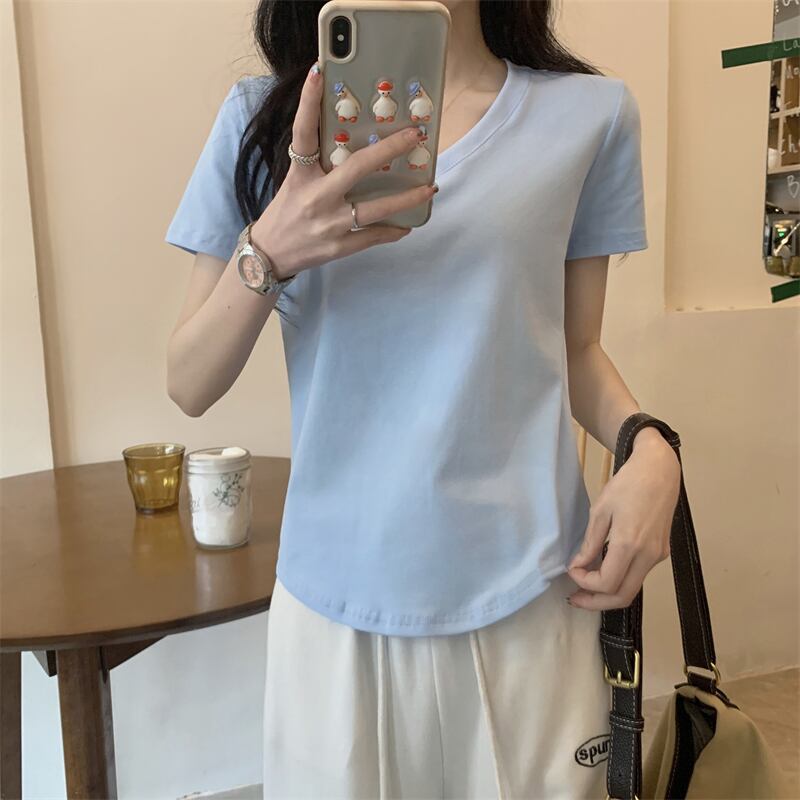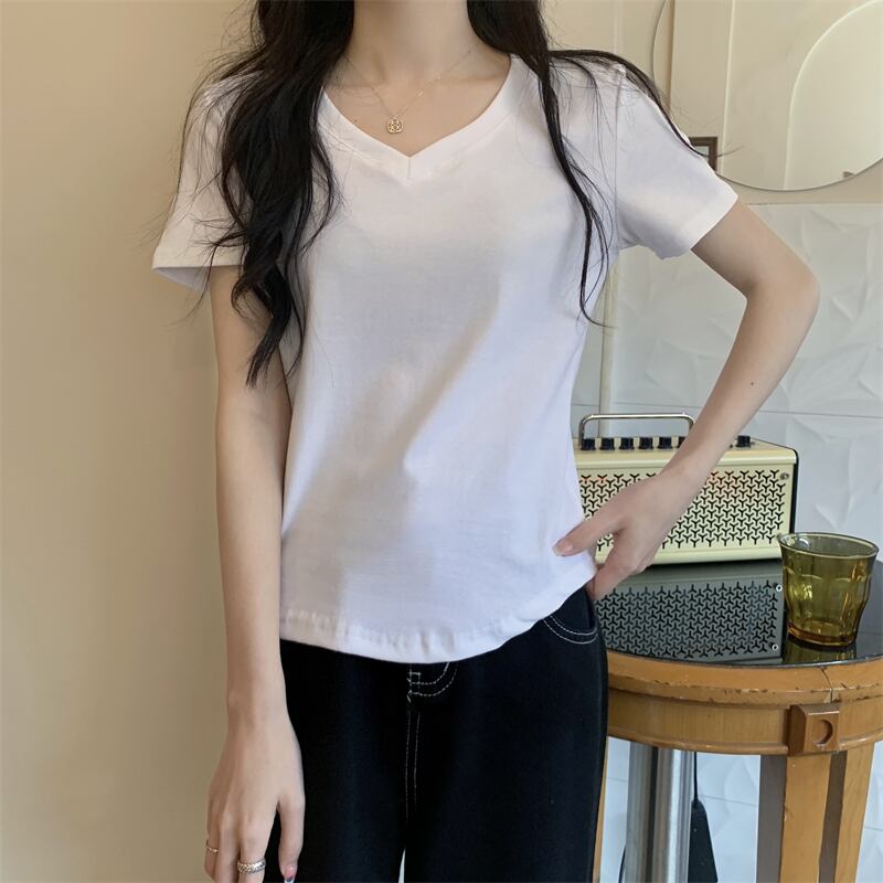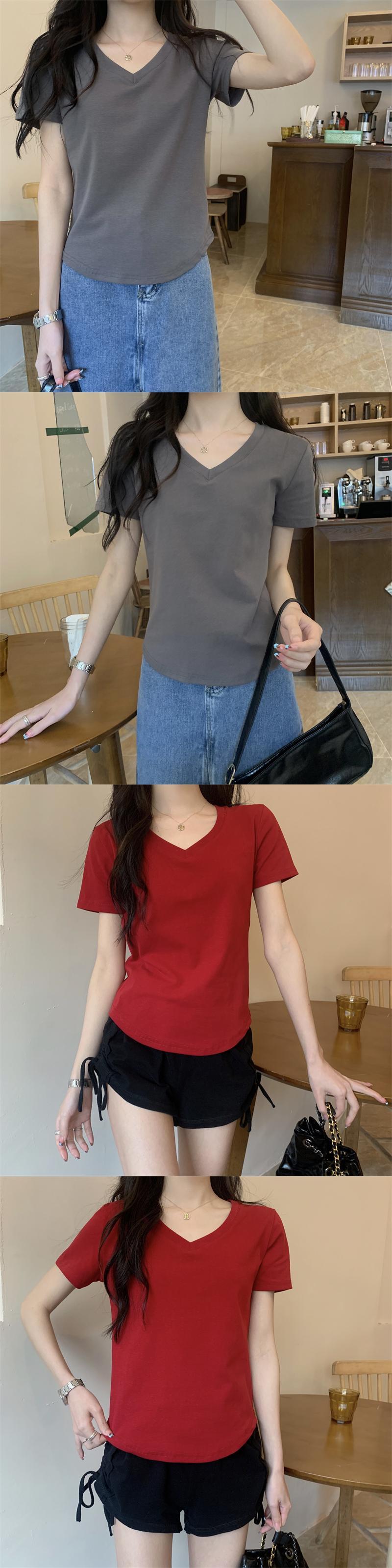 2022年夏の新作レディースデコレーションボディスリミングウエストショートトップキャンディーカラー多用途Vネック半袖Tシャツトレンド サマー 夏物 7460046883325437 | framboise21