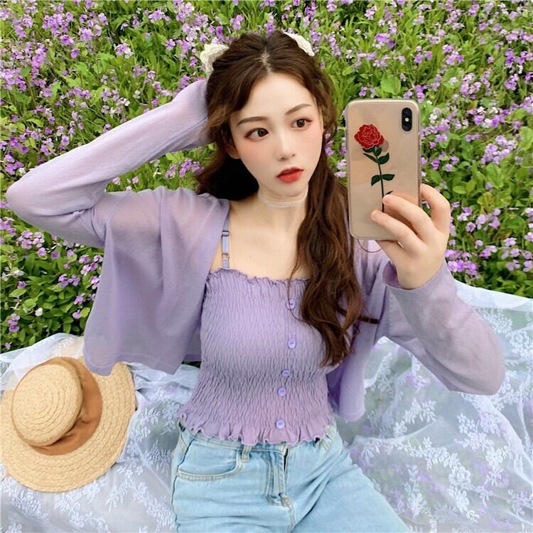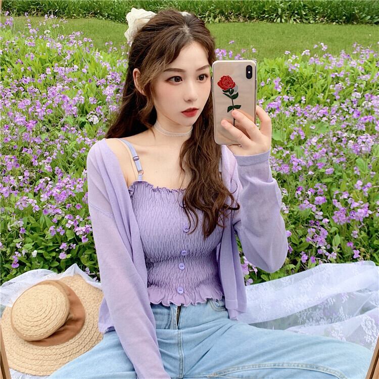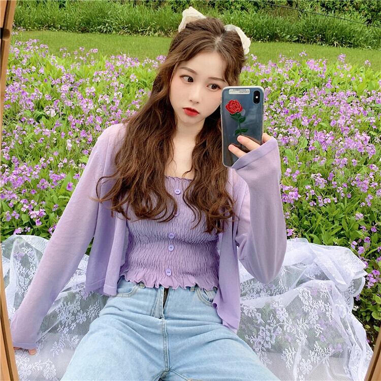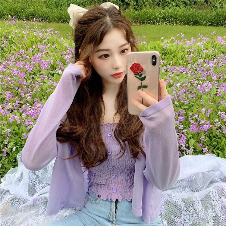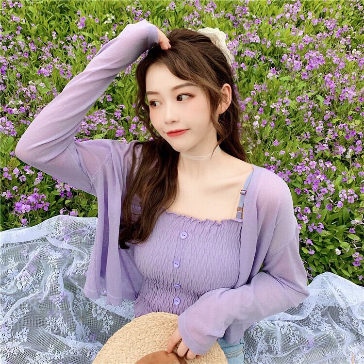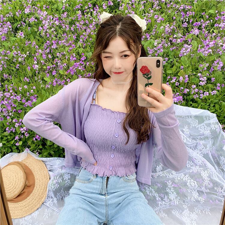 パープルカーディガンニットジャケットレディースシンウエスタンスタイルルーズレイジーアウターロングスリーブサンスクリーンシャツショートVネックトップ 長袖 7460066306916688 | framboise21