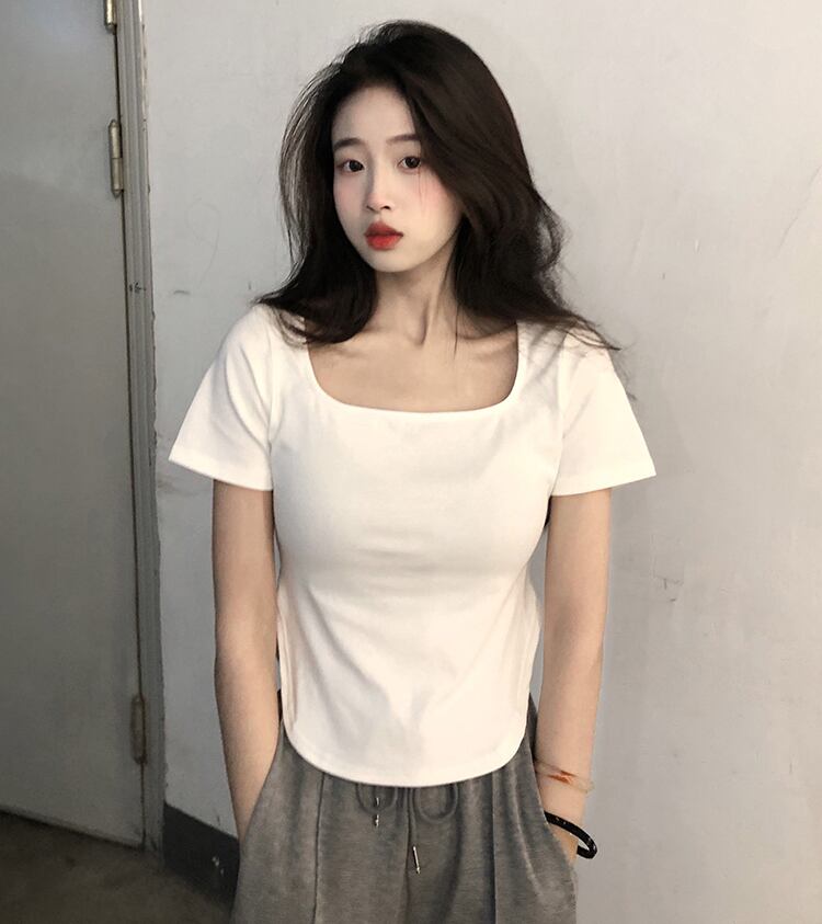 サマーブラックフロントショルダースクエアカラー半袖TシャツレディースショートスリムフィットボトミングTシャツピュアデザイトップ 夏物 スクウェア 7460059271968349 | framboise21