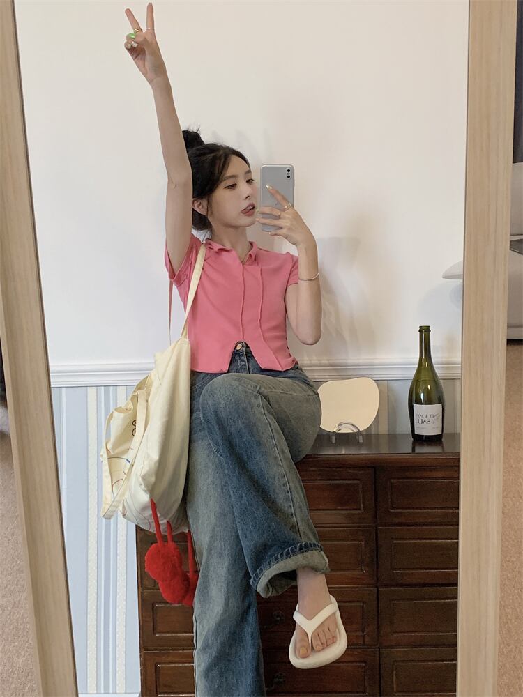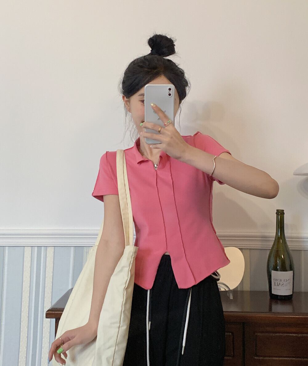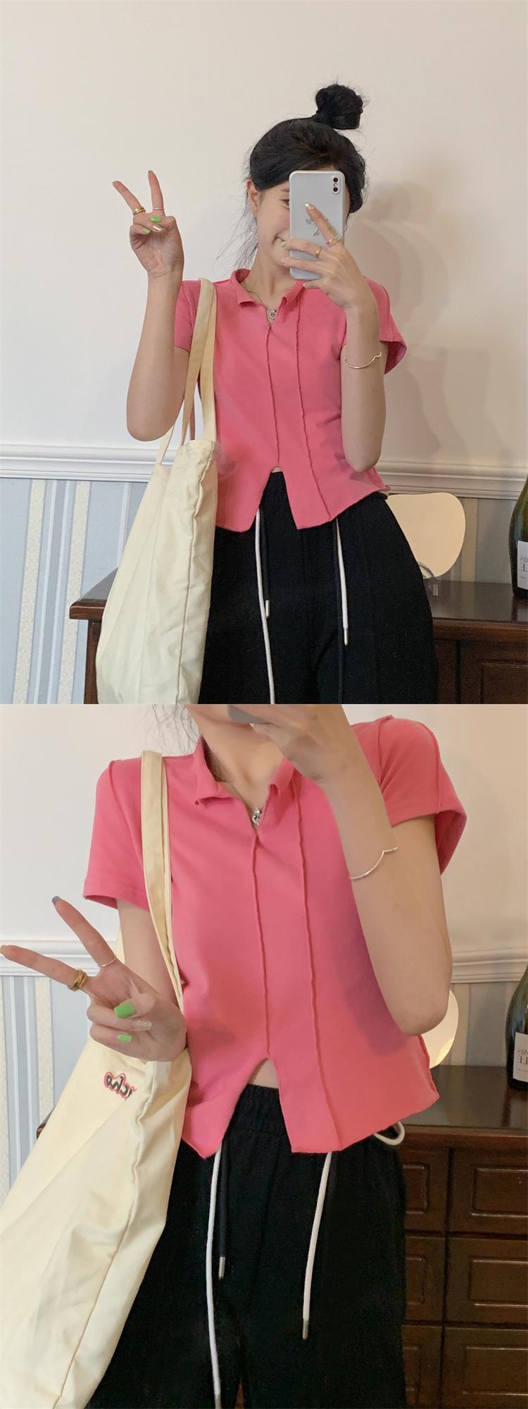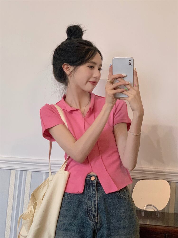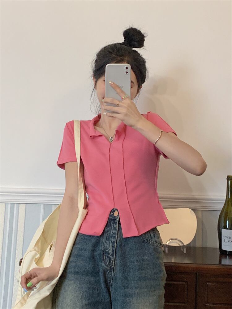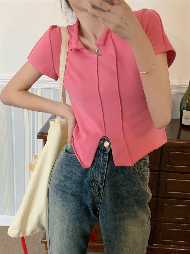 ピンクのフィッシュボーンウエスト半袖Tシャツレディースインサマースプリットデザイン自家栽培感とシックなVネックショートハイウエストトップス 夏物 7460036122322139 | framboise21