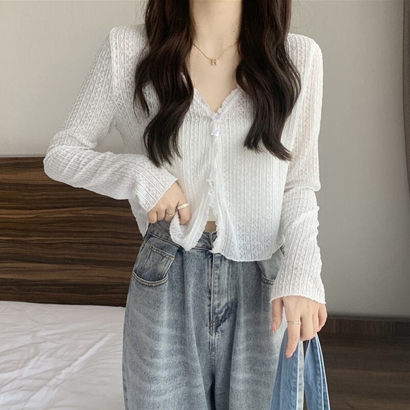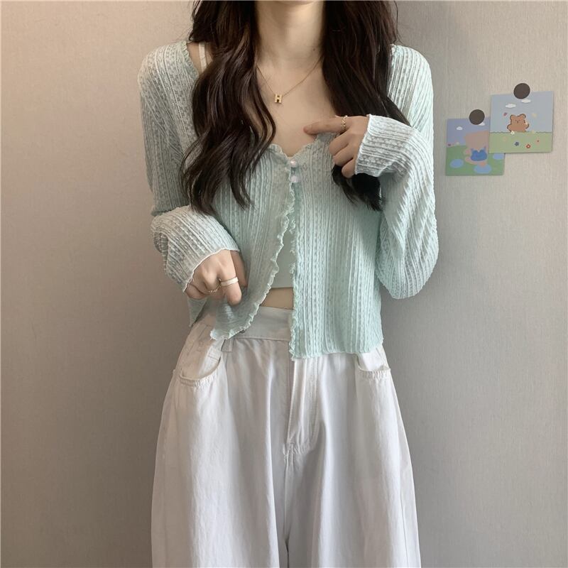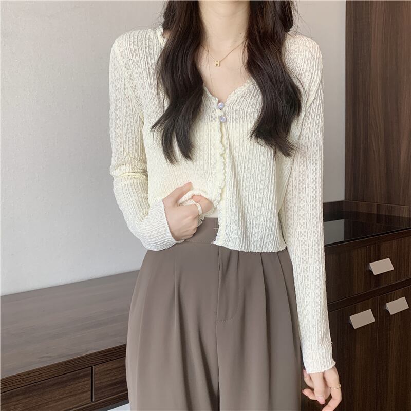 ニットの日焼け止めカーディガン薄片女性の夏の白いブラウススモールコートデザインセンスサスペンダー、短い長袖トップ ショート ロング ホワイト サマー 夏物 7460084792974488 | framboise21