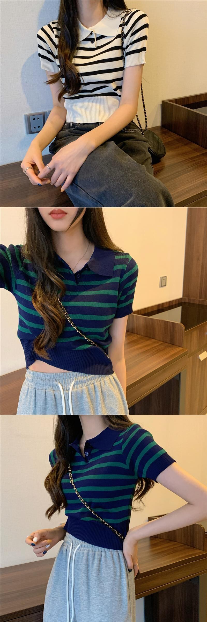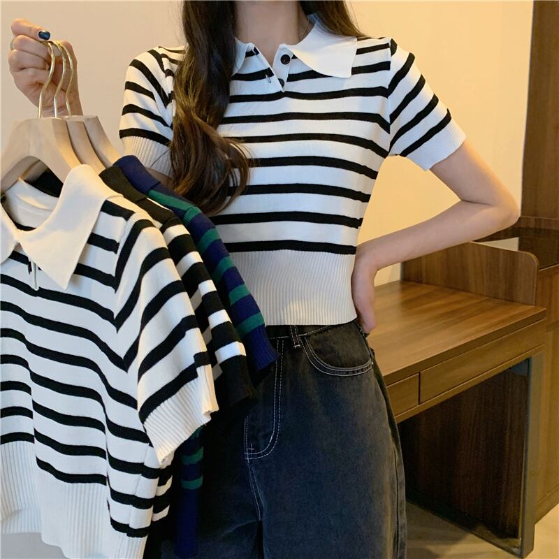 2022年春夏新作ポロカラーストライプ半袖Tシャツレディースデザインニッチシックショートニットセータートップ スプリング 春物 サマー 夏物 7460092936283680 | framboise21