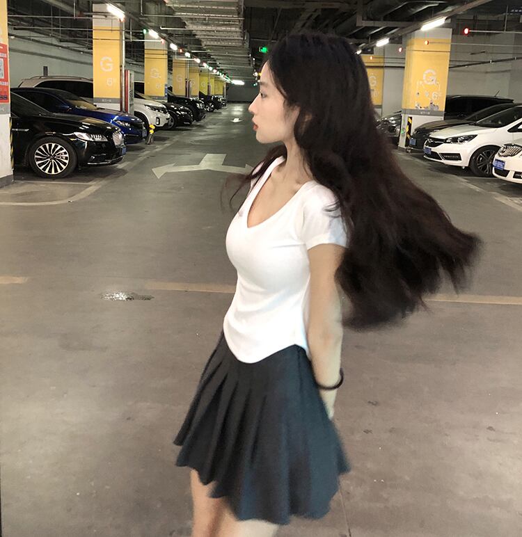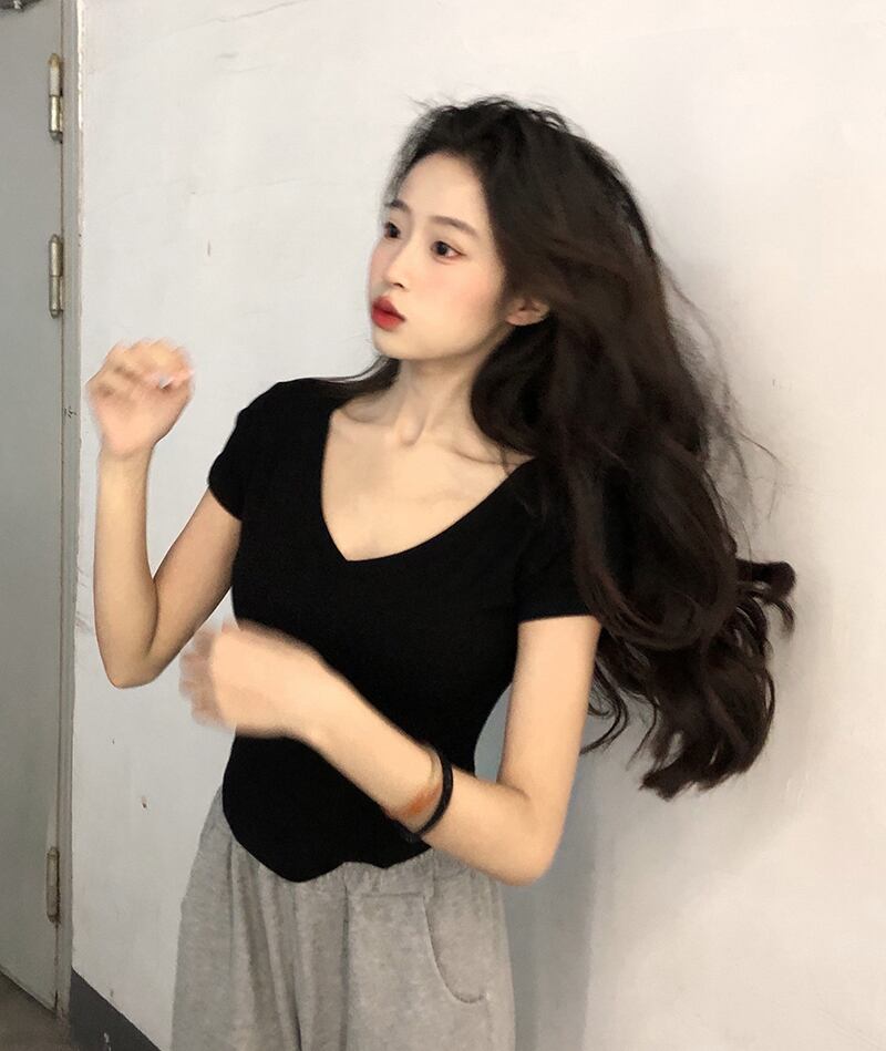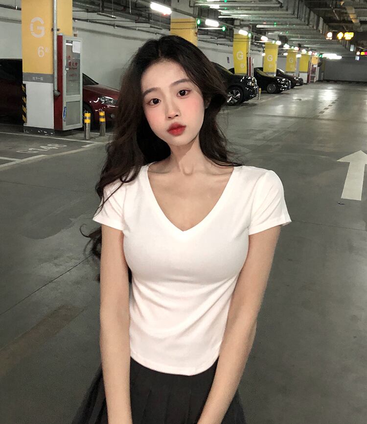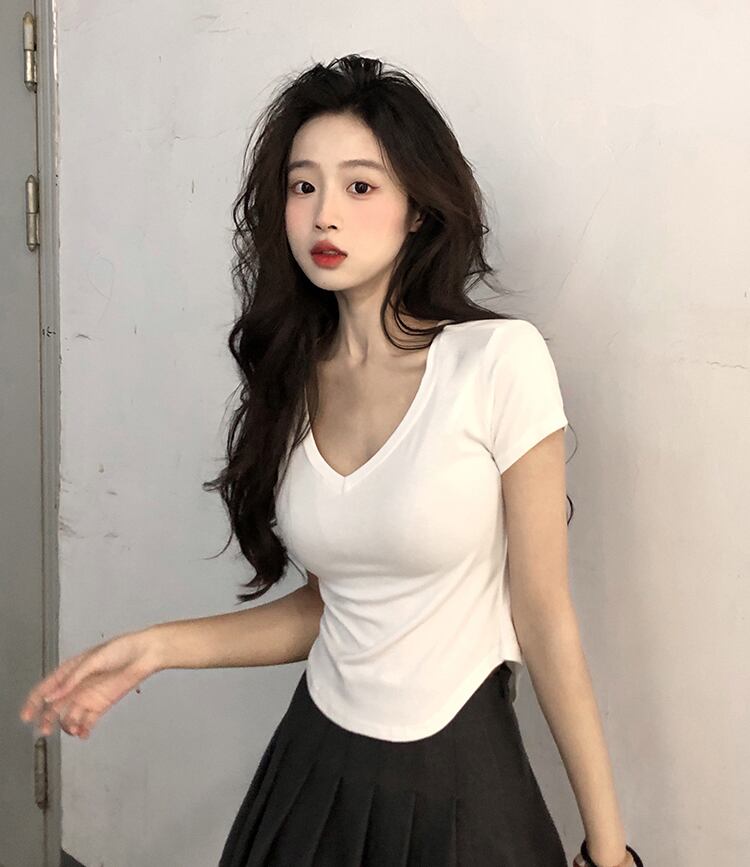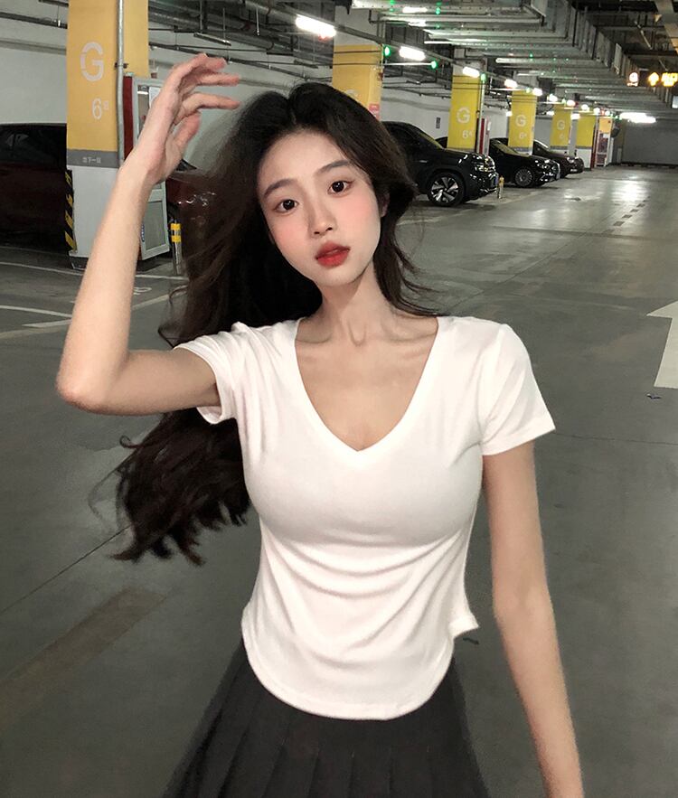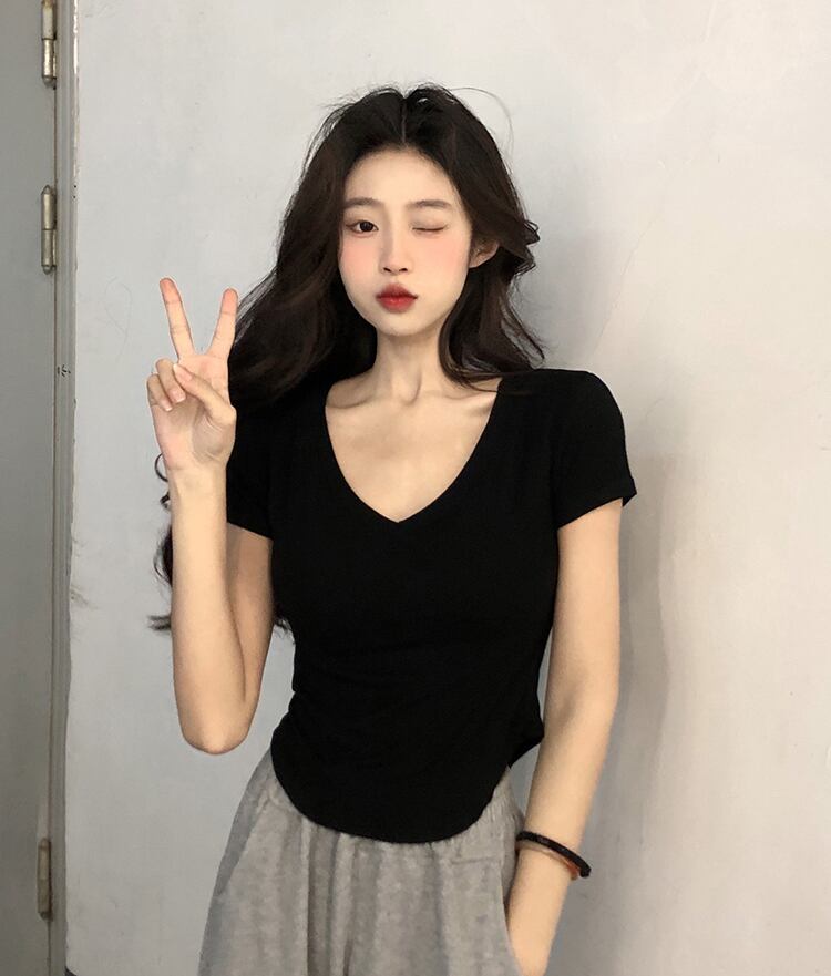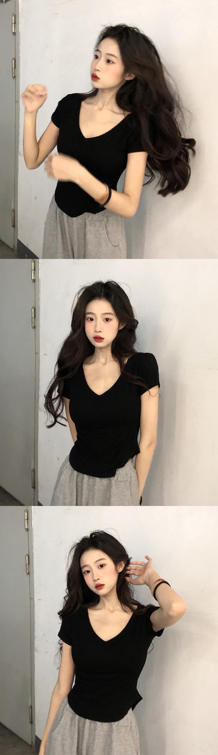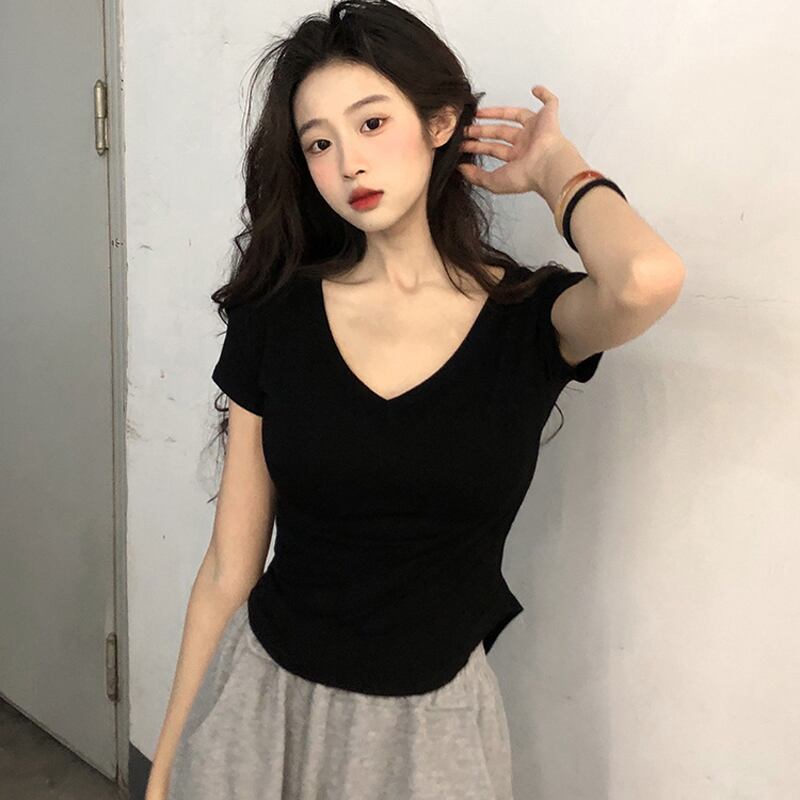 ブラックVネック半袖Tシャツレディース夏2022年春新作インナーTシャツデザインセンスニッチショートトップ スプリング 春物 サマー 夏物 7460065847305970 | framboise21
