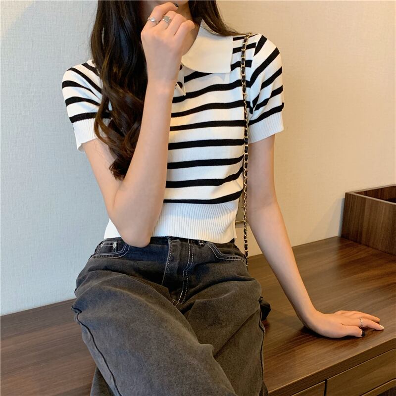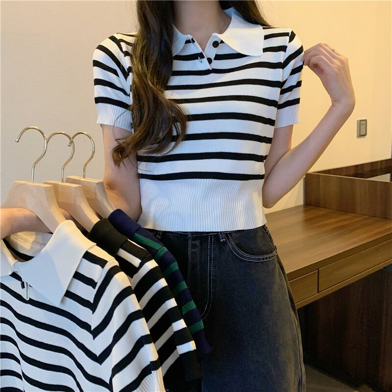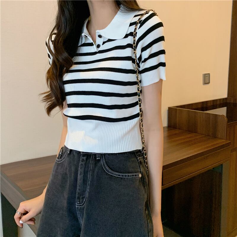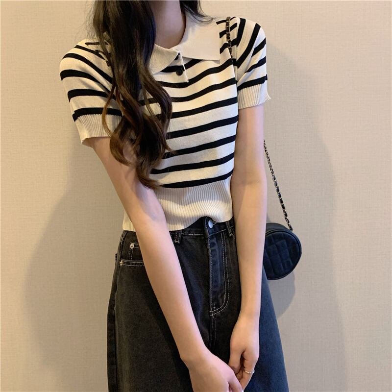 夏の薄手のストライプアイスシルクニットポロシャツショートトップレディーススタイルルーズハイウエストオールマッチ半袖Tシャツ ハイウェスト サマー 夏物 746004741058617 | framboise21