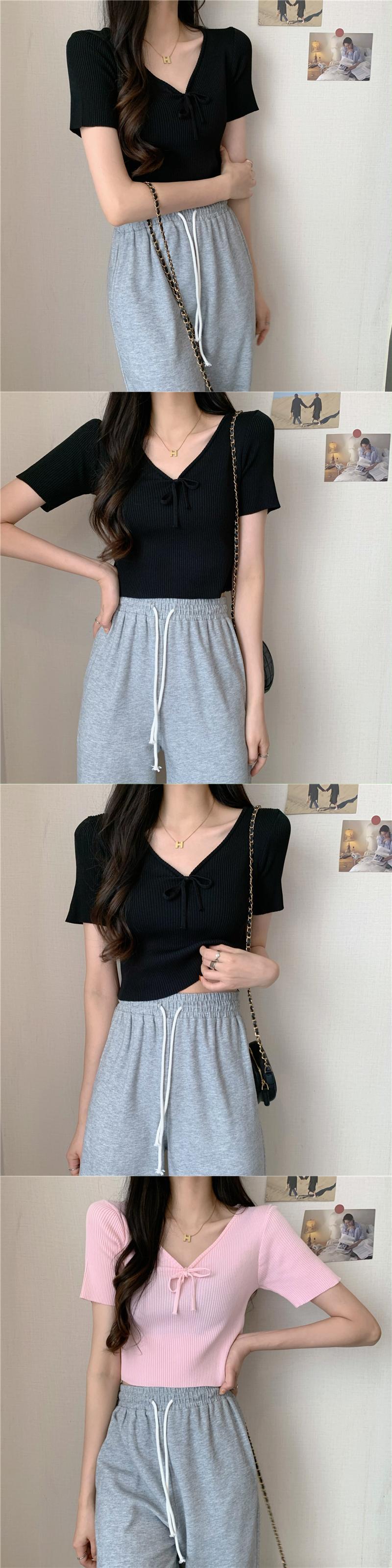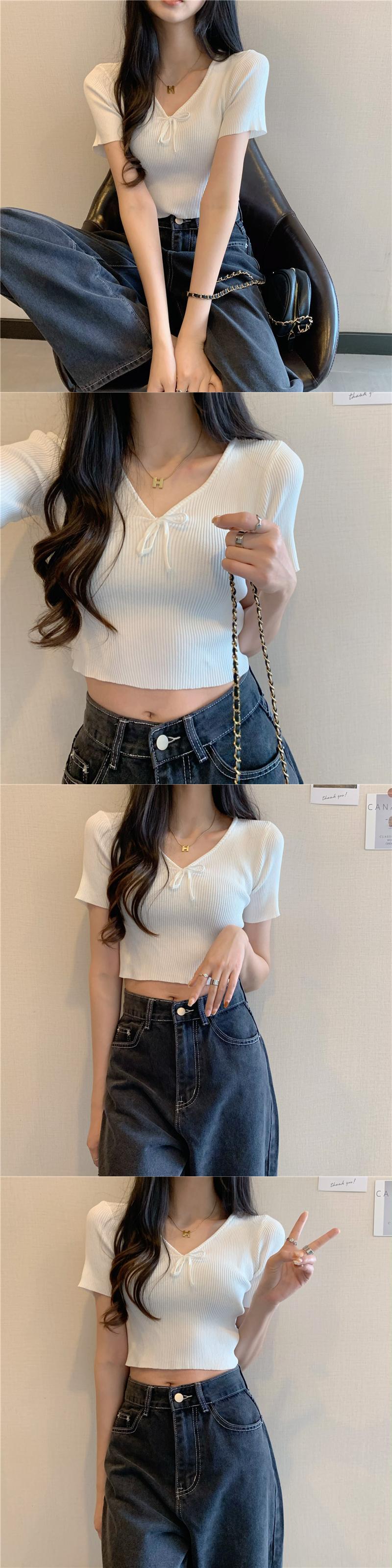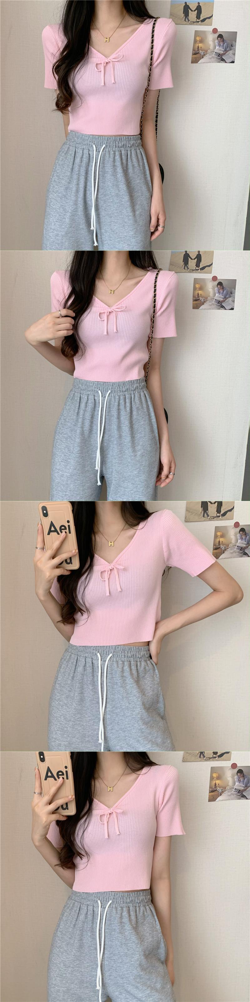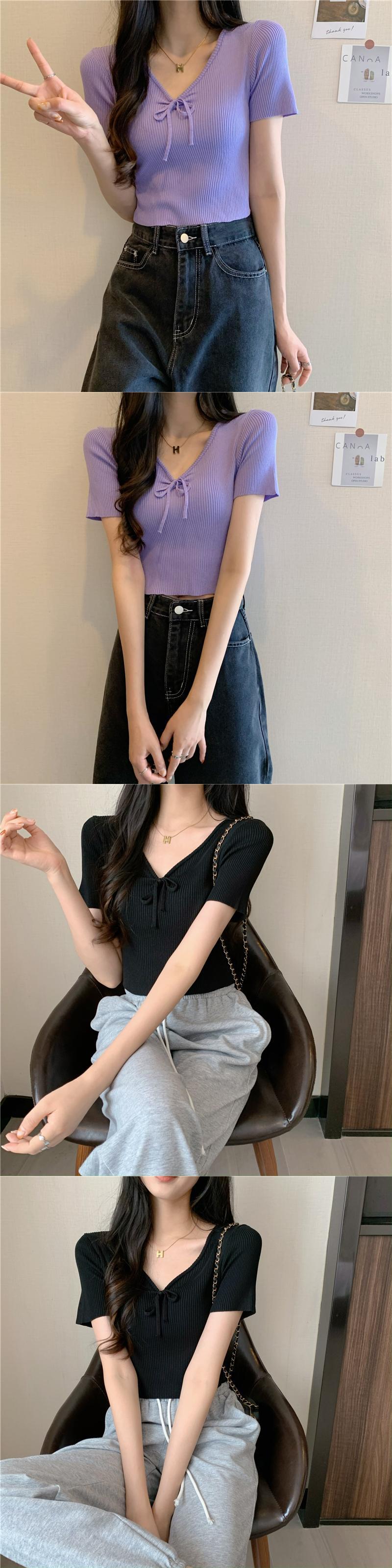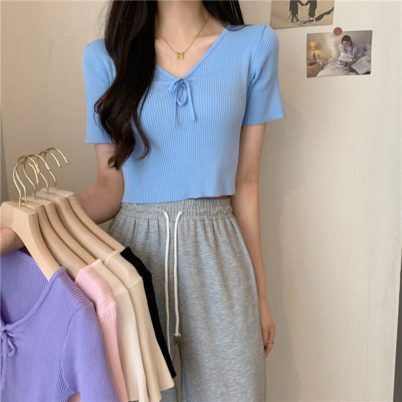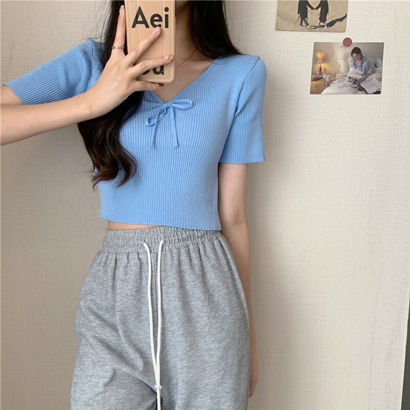 Vネックネクタイボウスリムアイスシルクニットセーター半袖Tシャツレディースサマーシンハイウエストbmスタイルショートトップ ハイウェスト リボン 夏物 7460065042324684 | framboise21
