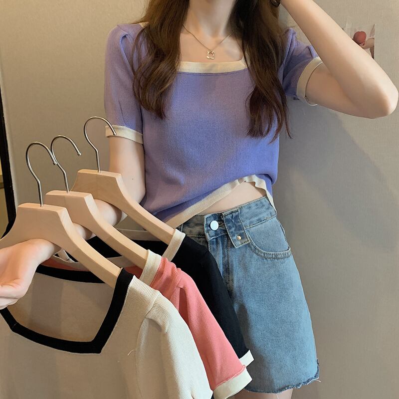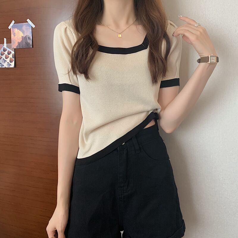 ブラックスクエアネックアイスシルクニット半袖TシャツレディースサマーフロントショルダーTシャツデザインニッチスリムショートトップ 夏物 スクウェア 7460063712141574 | framboise21