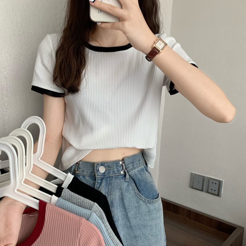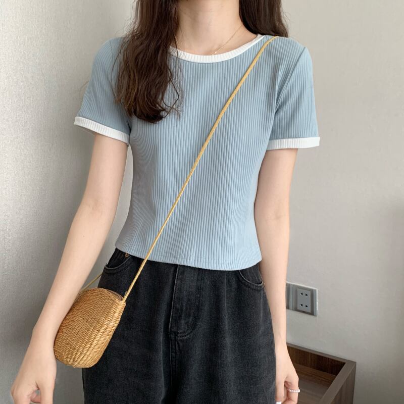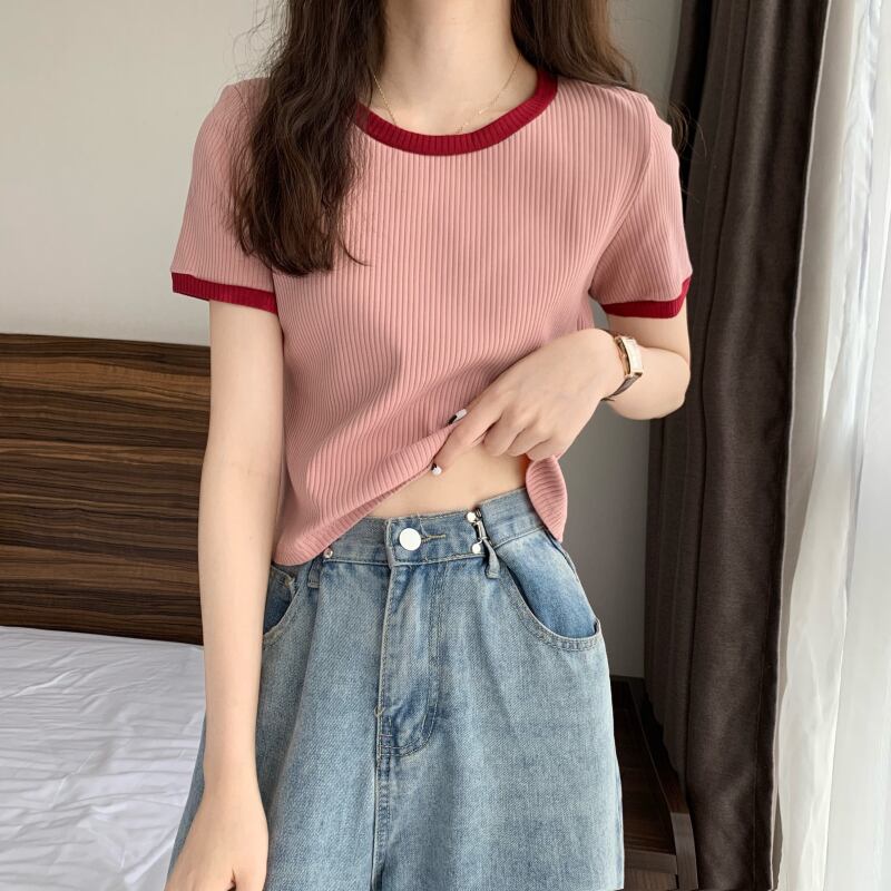 ピンクのニットショルダー半袖Tシャツレディースイントレンド2022新しいスリムフィットと薄いアイスシルクトップ夏の薄いセクション サマー 夏物 7460080596818644 | framboise21