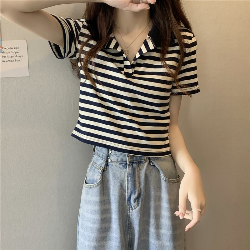 夏のルーズストライプポロカラー半袖Tシャツレディースデザインセンスニッチボトミングシャツフロントショルダーピュアデザイトップ サマー 夏物 7460036255615270 | framboise21
