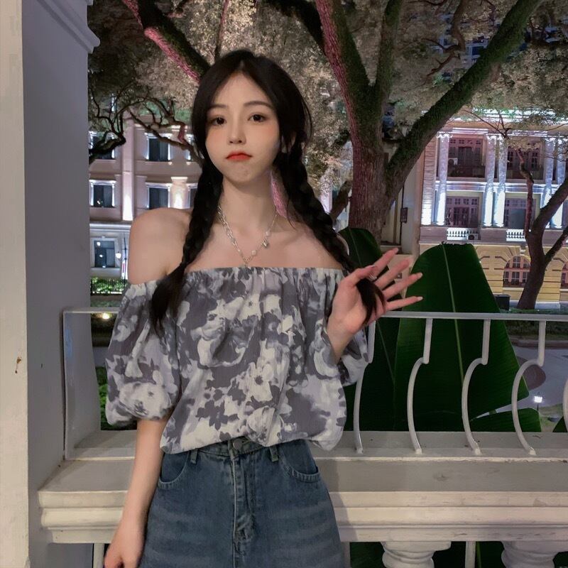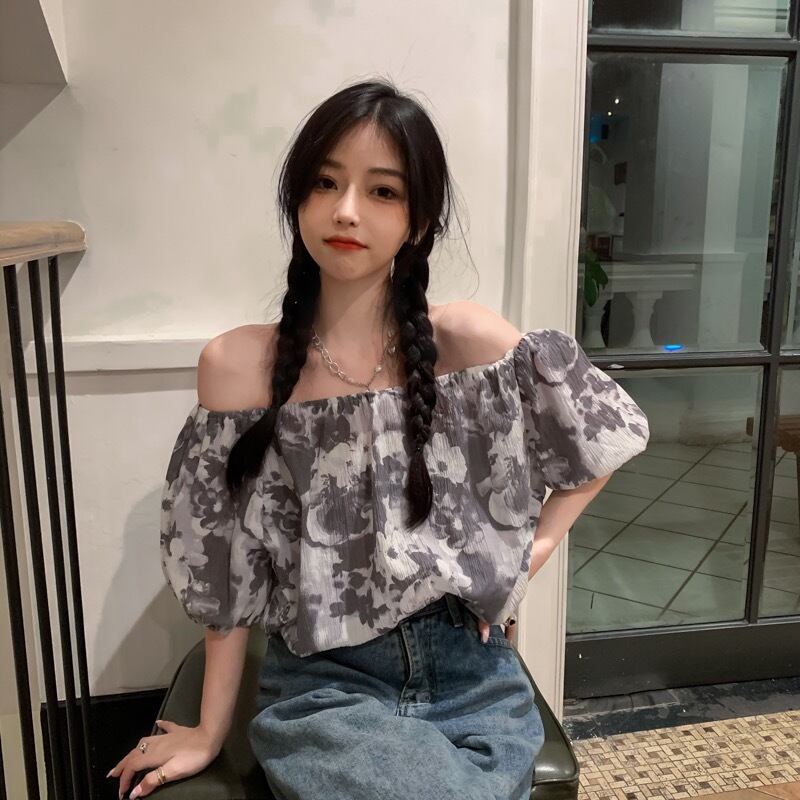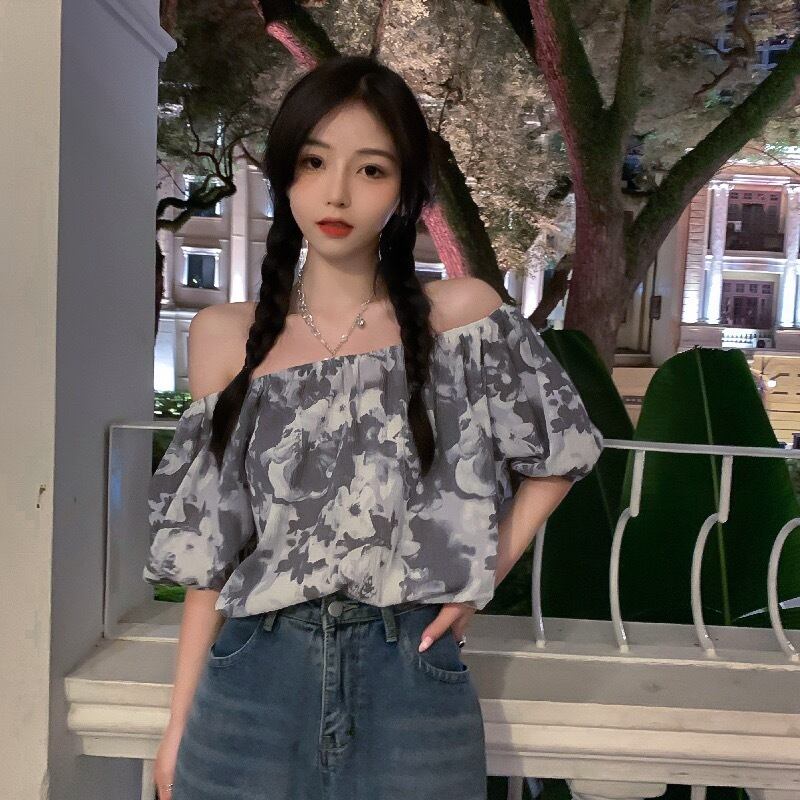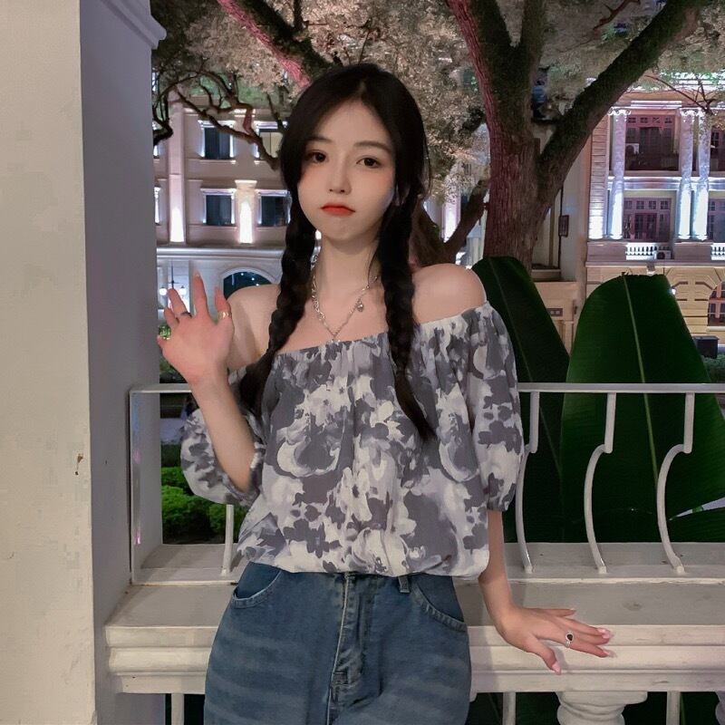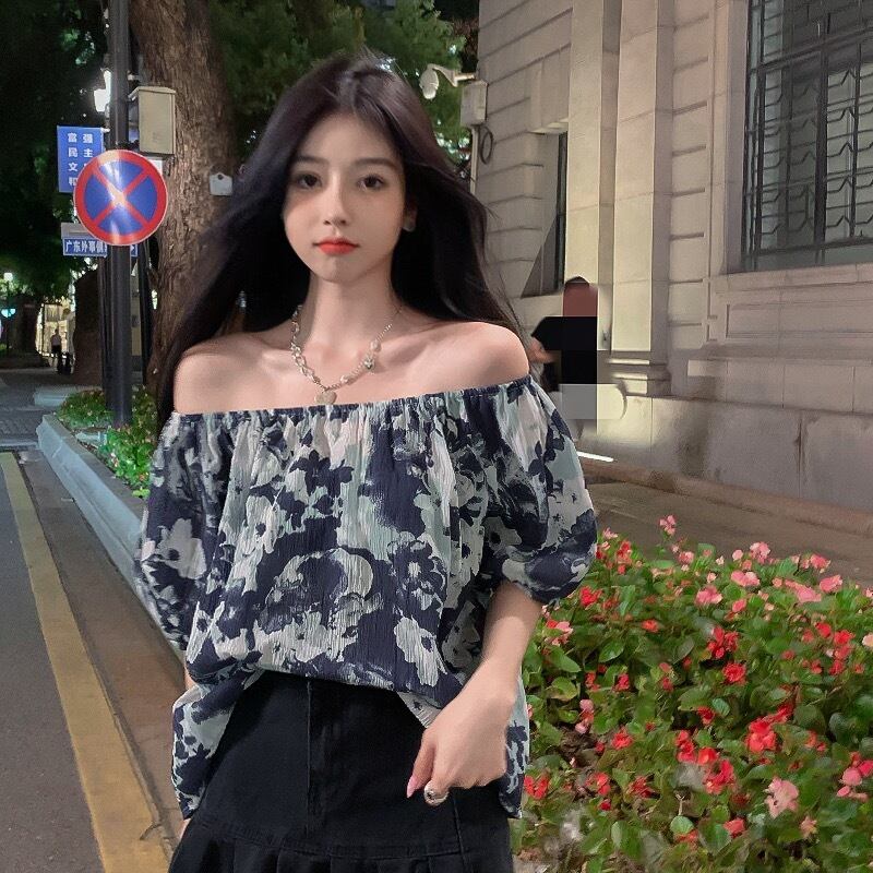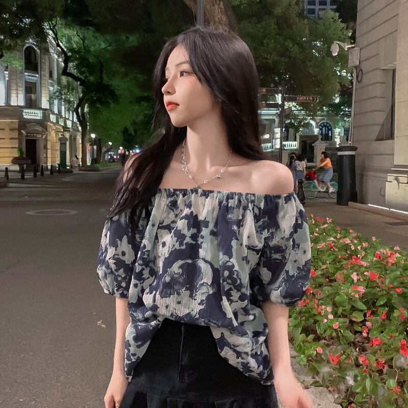 シフォン半袖シャツレディースサマースタイル2022新デザインセンスレトロインクフラワーフラワーワンショルダートップトレンディ 夏物 フラワーデザイン 7460048771065115 | framboise21