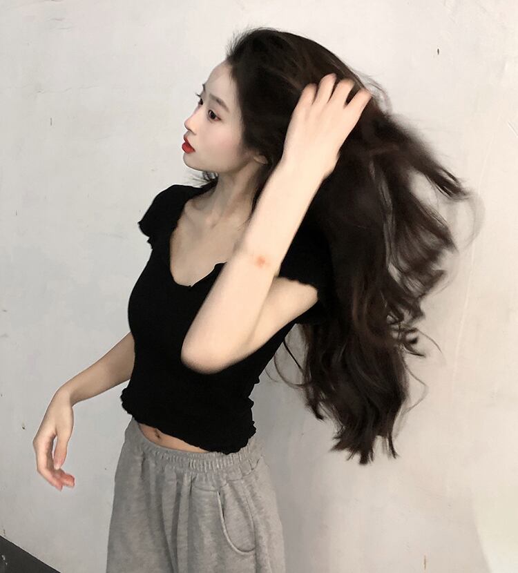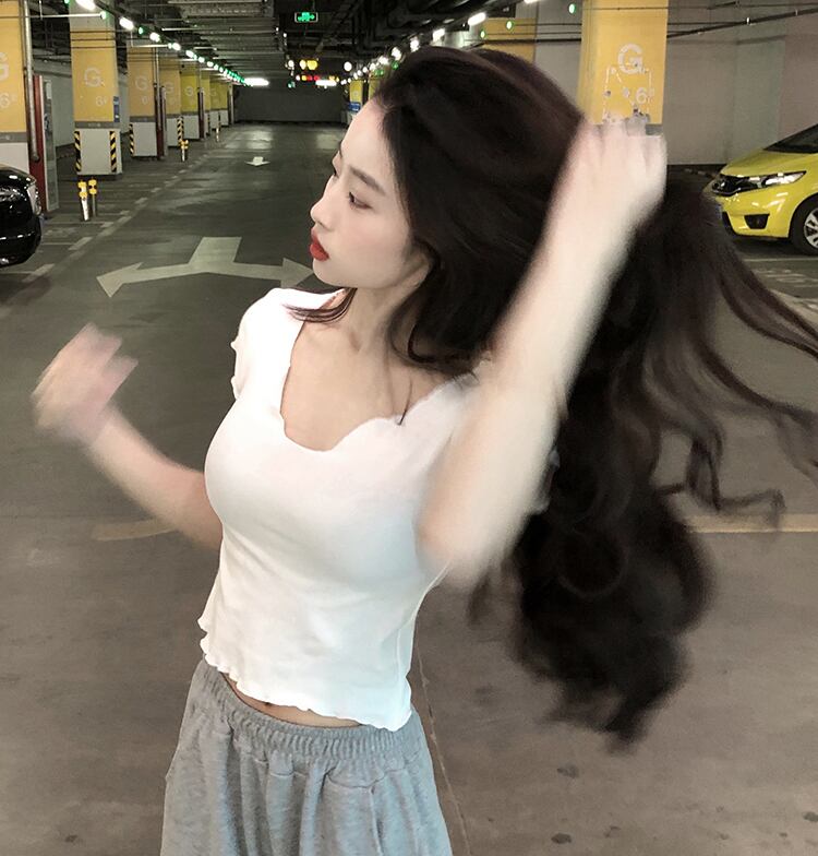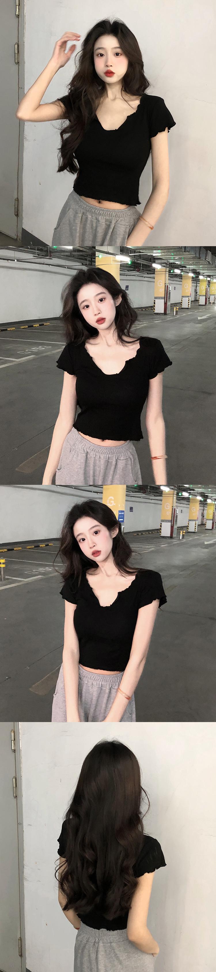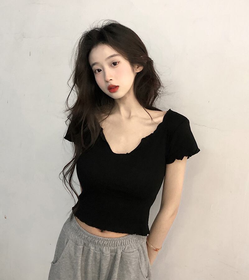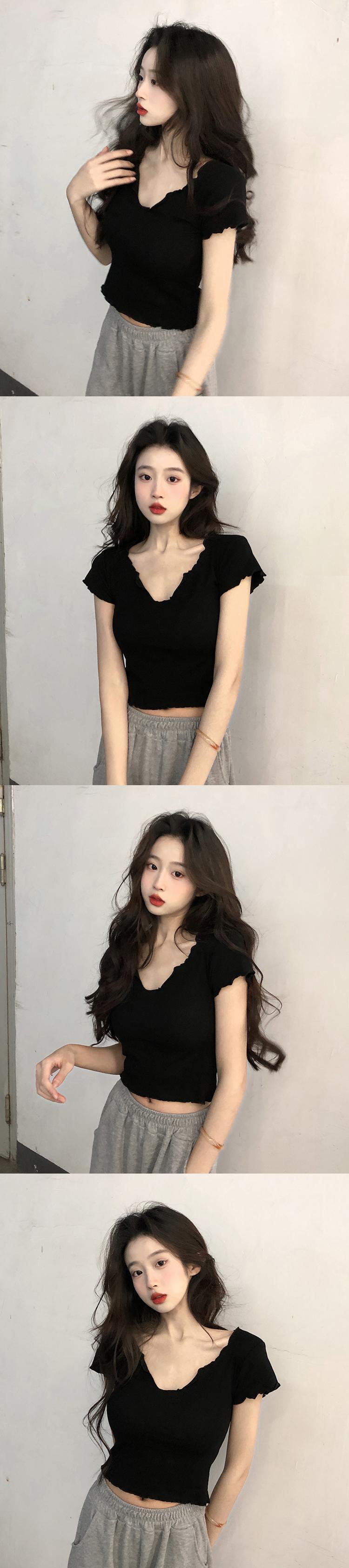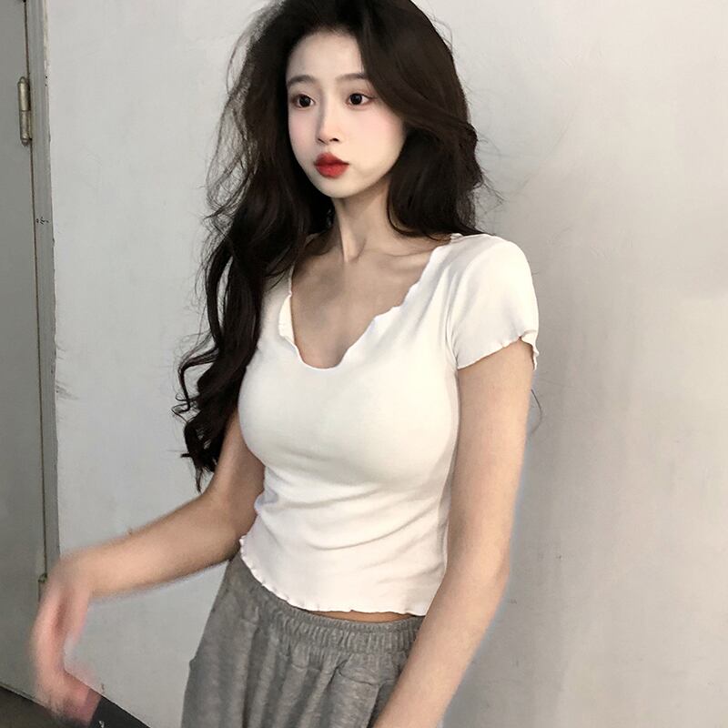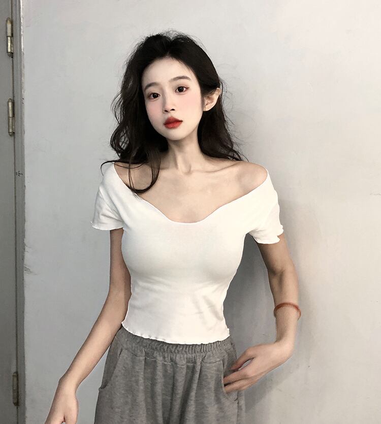 ホワイトVネック半袖Tシャツレディース夏夏ピュアコットンショルダーTシャツ無地スリムショートトップデザインニッチ サマー 夏物 ソリッドカラー 7460042118709376 | framboise21