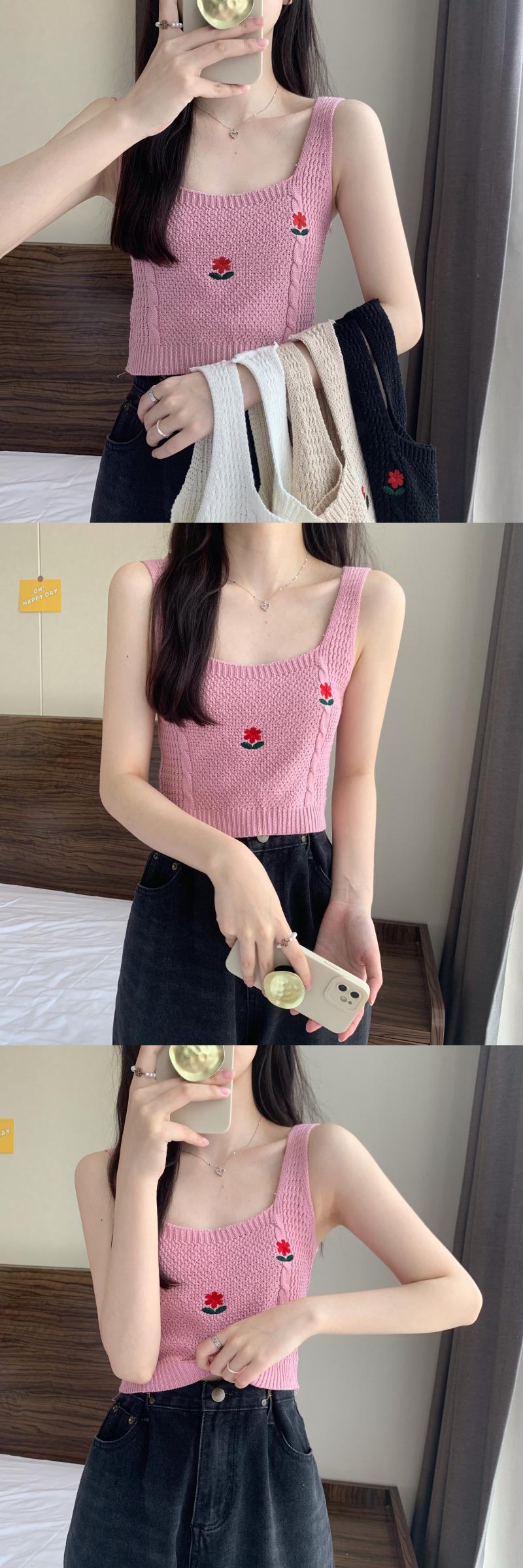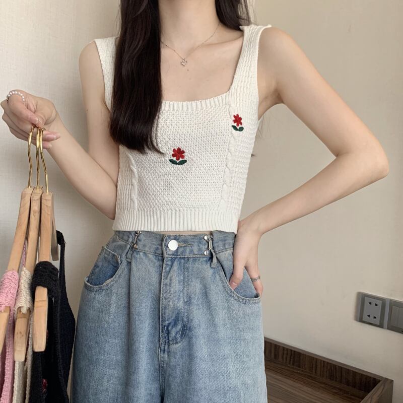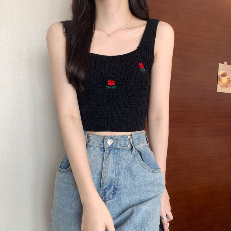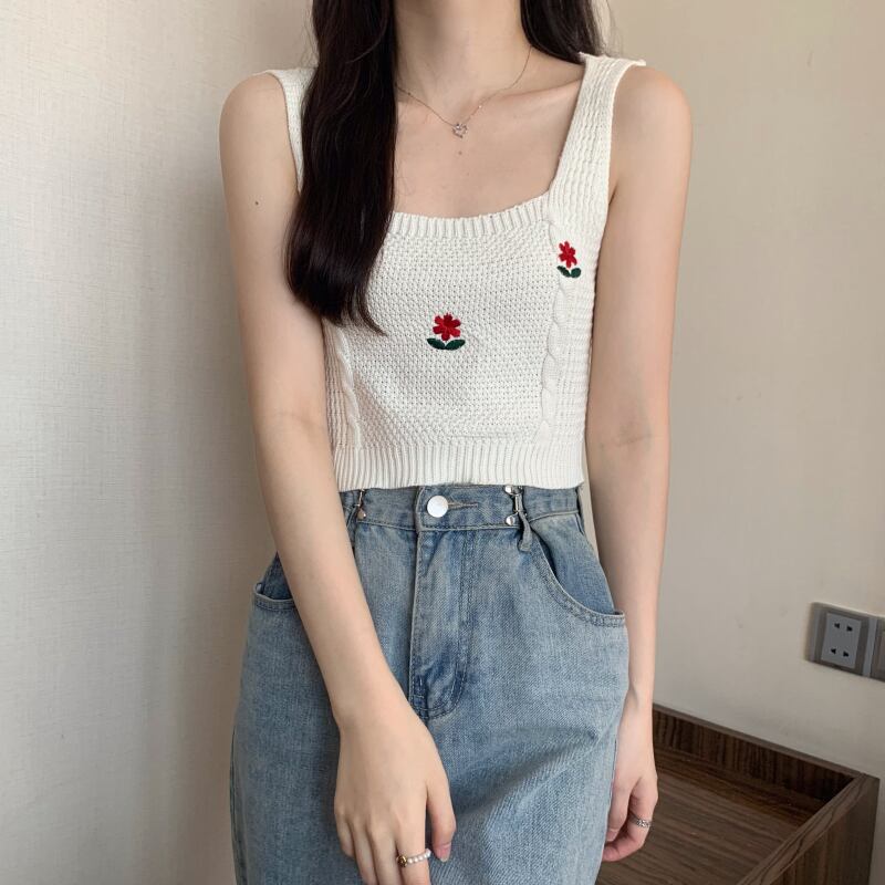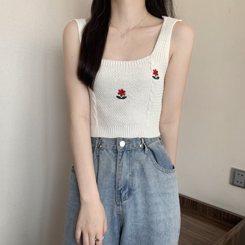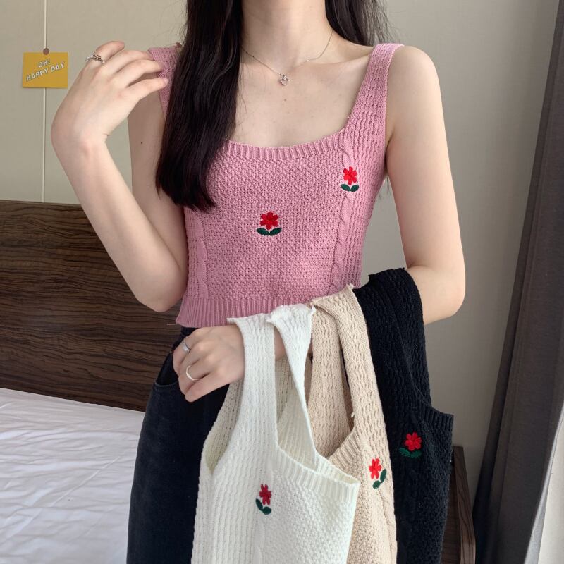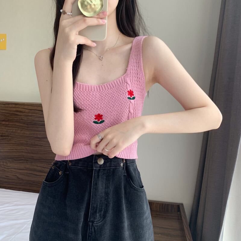 夏フレンチピンクボトミング刺繡小花キャミソールレディースデザインセンスニッチビューティーバックノースリーブチューブトップトップ 刺繍 サマー 夏物 フラワーデザイン 7460042287671791 | framboise21