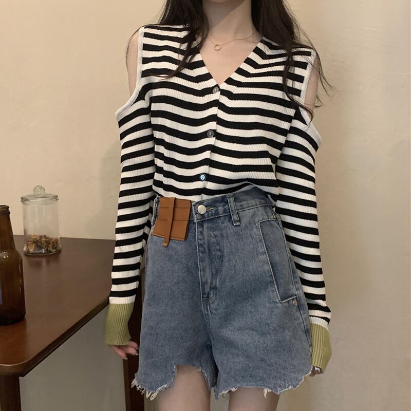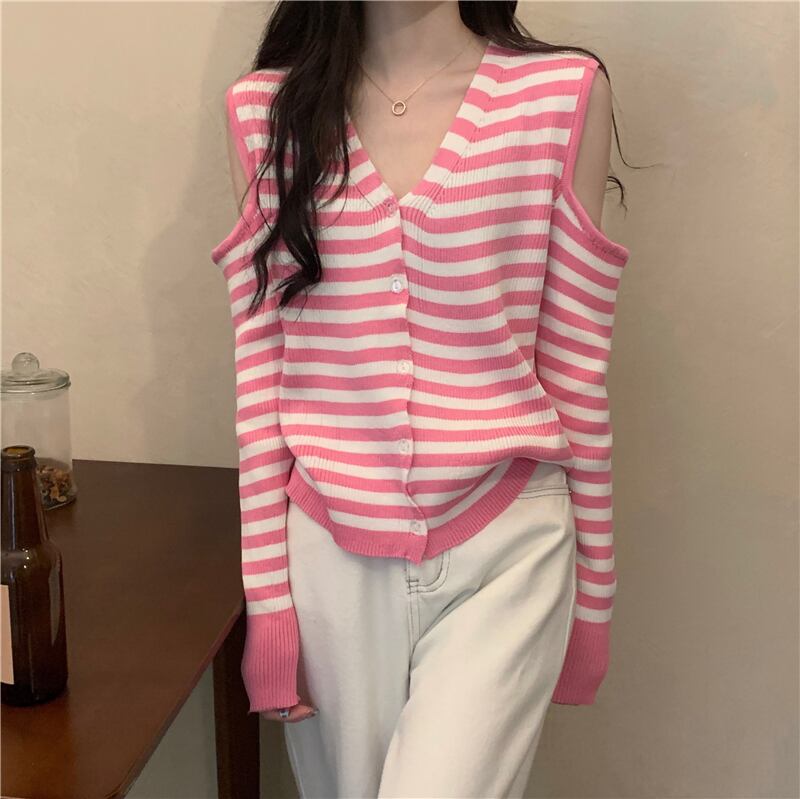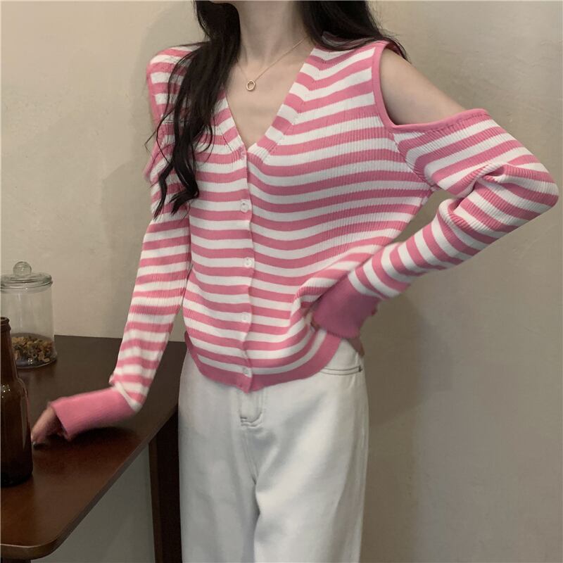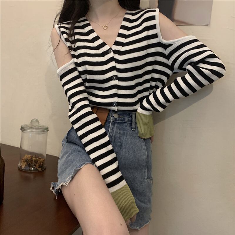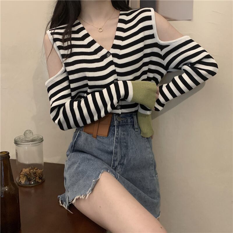ストライプのVネックオフショルダー長袖ニットTシャツレディース春夏デザイントレンディなインススモールシャツシックなスウィートトップ ロング 大人ガーリー キュート カジュアル スプリング 春物 サマー 夏物 7460065490613387 | framboise21
