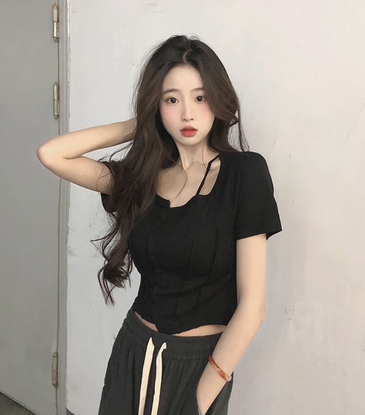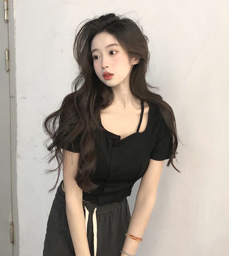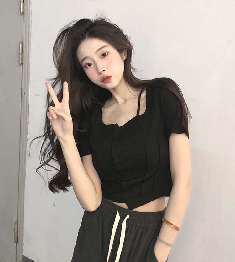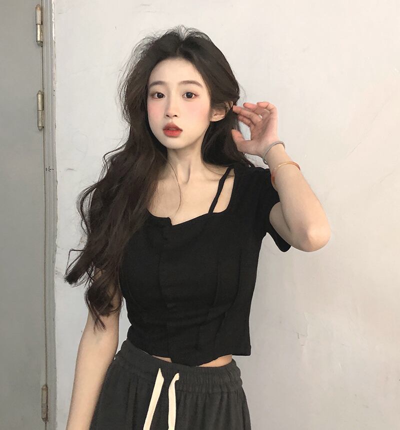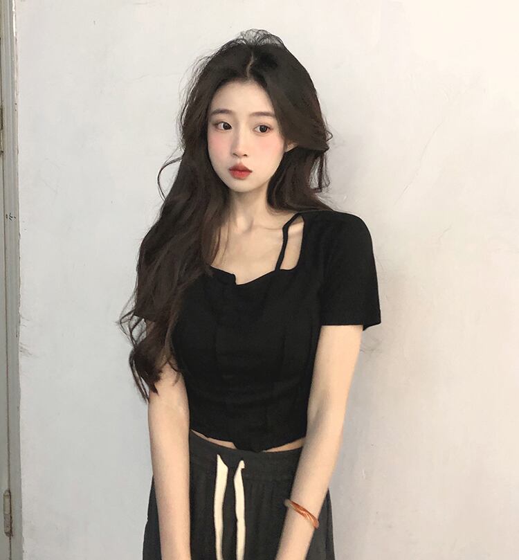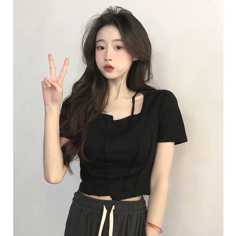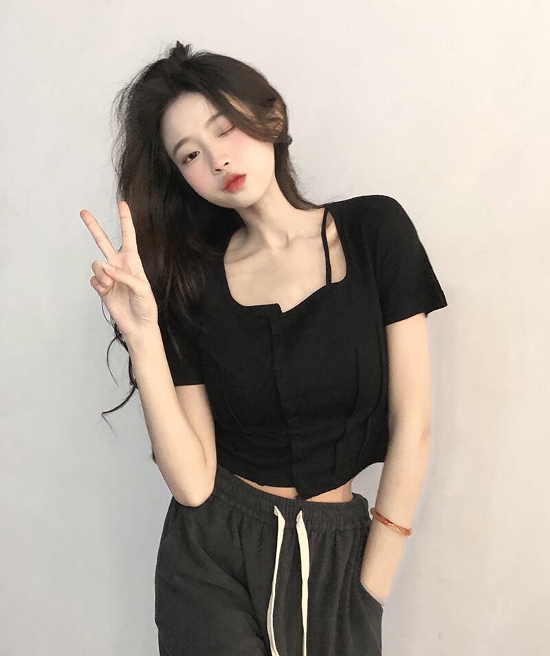 黒のスクエアネック半袖Tシャツ女性の2022年夏の新しい薄片デザインセンスニッチ純粋な欲望コンピオネートショートトップ ブラック サマー 夏物 ピュア スクウェア 7460093510604926 | framboise21
