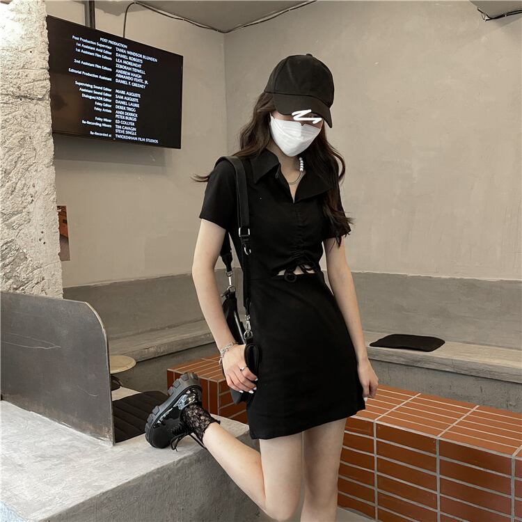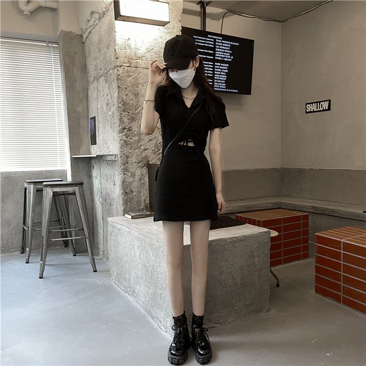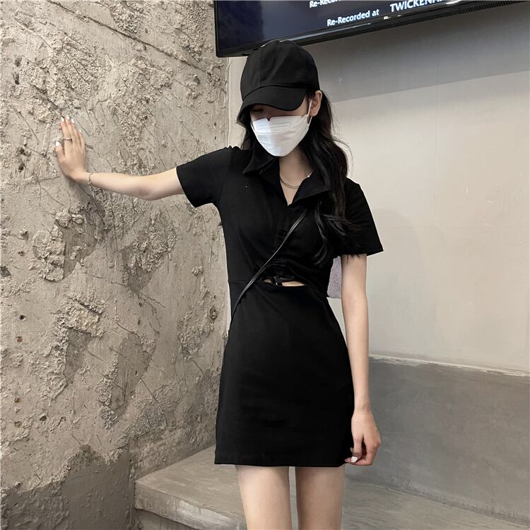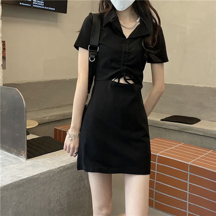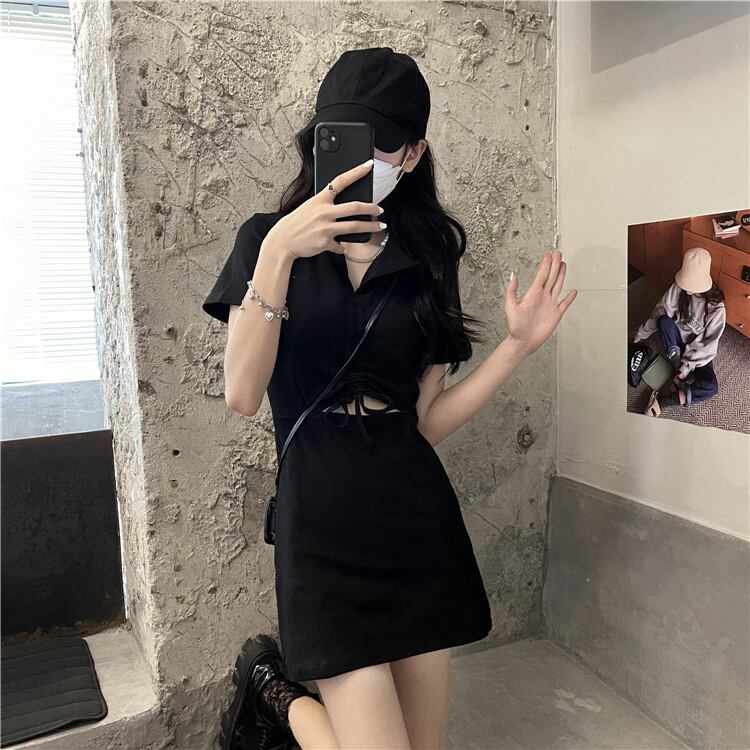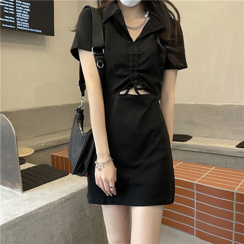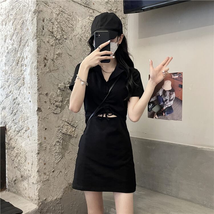 ポロカラードレスウエストレディースサマーセルフカルチャーリークウエスト巾着中空Aラインバッグヒップブラックセクシーピュアデザイスカート 夏物 7460086875956515 | framboise21