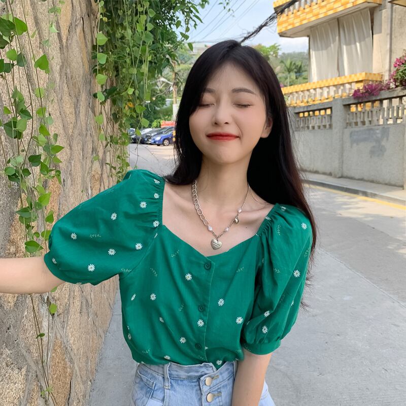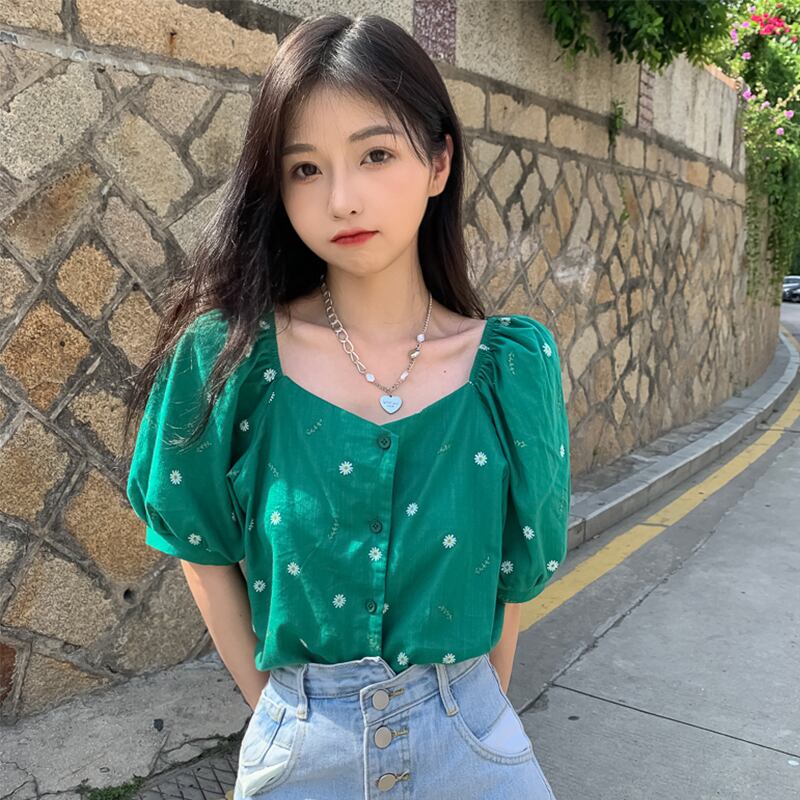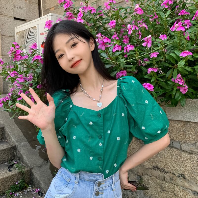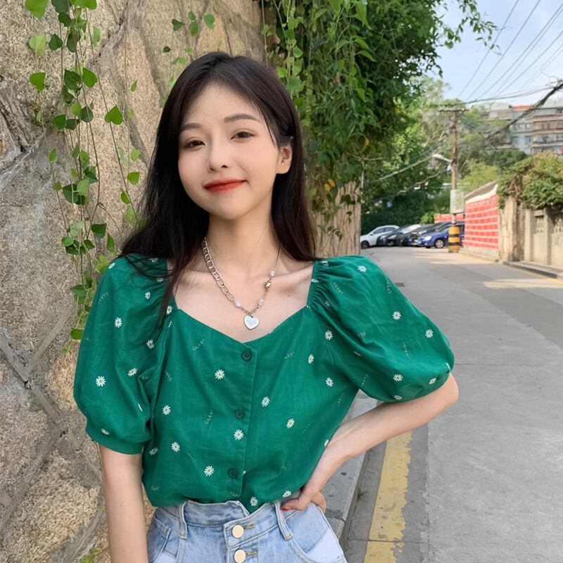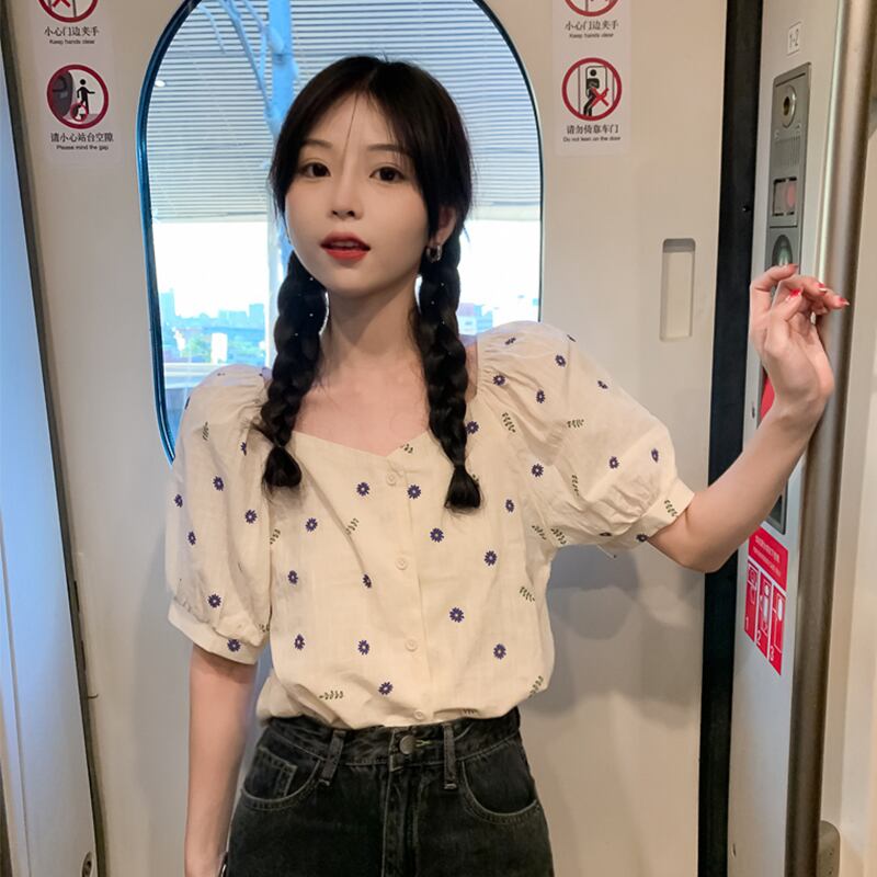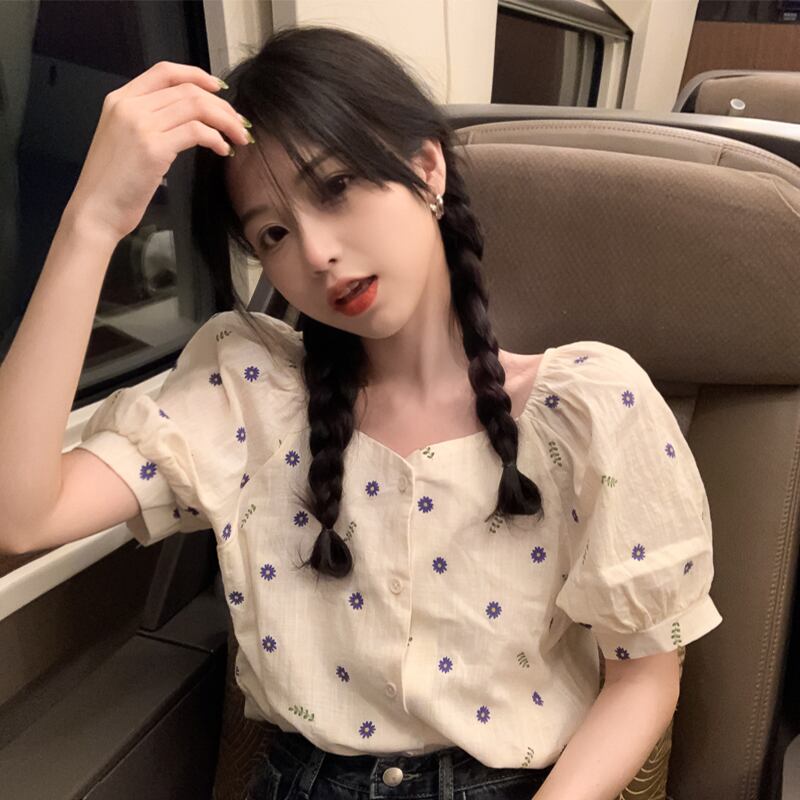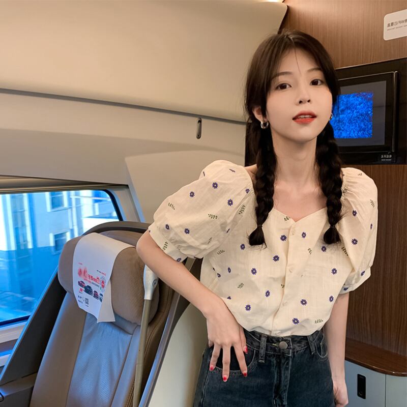 2022年の新しい半袖の白い花柄のパフスリーブシャツの女性の夏の小さな新鮮な甘いトップシックで美しい小さなシャツ ホワイト 大人ガーリー スウィート キュート カジュアル サマー 夏物 7460030134057856 | framboise21