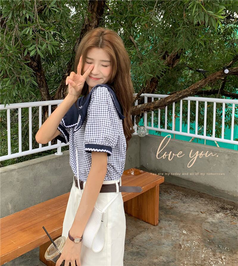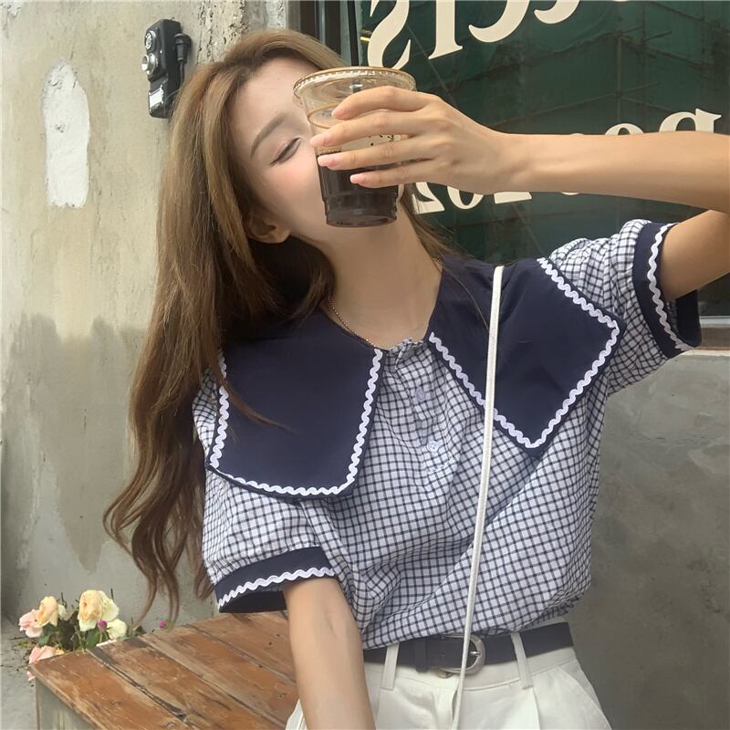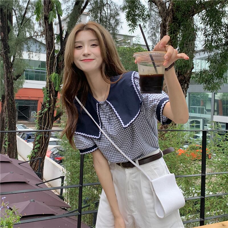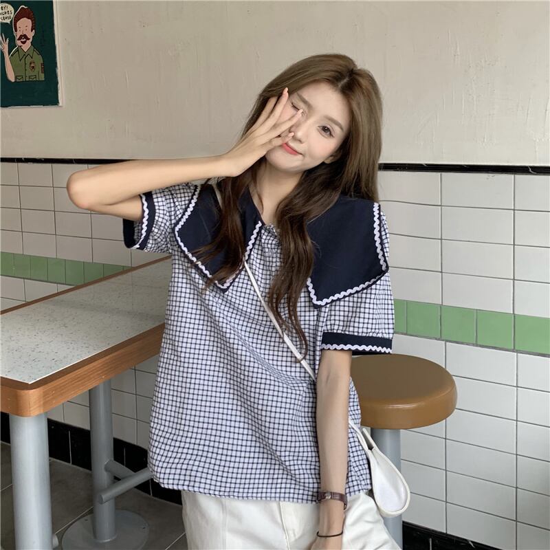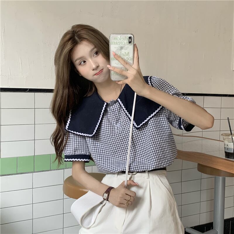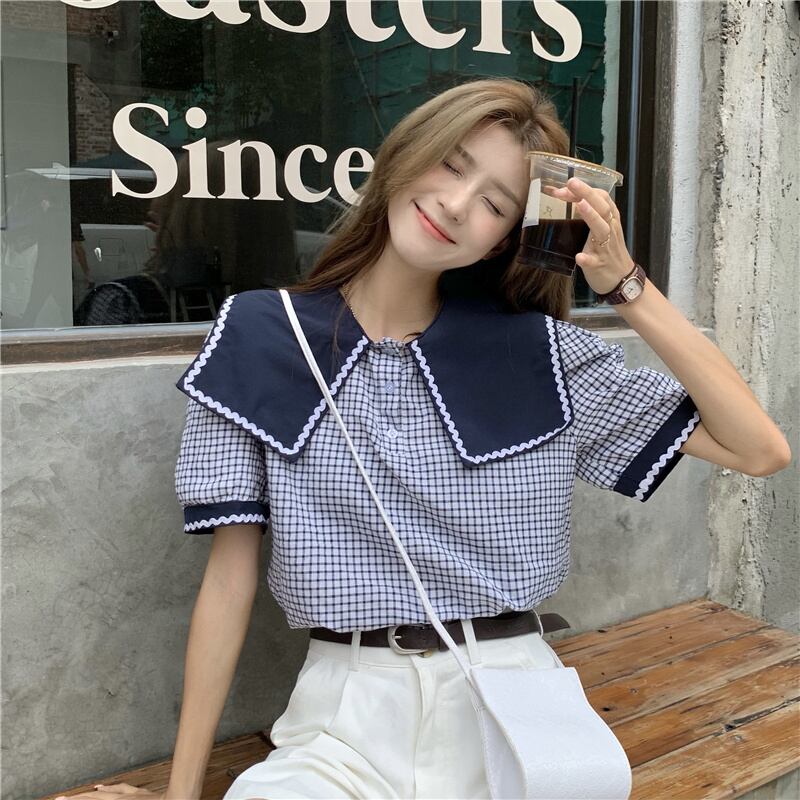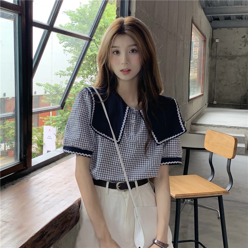 レトロネイビーカラーチェック柄シャツレディース半袖サマースモールフレンチスウィートシックパフスリーブトップ ショート ハーフスリーブ 大人ガーリー キュート カジュアル 夏物 746006748557475 | framboise21