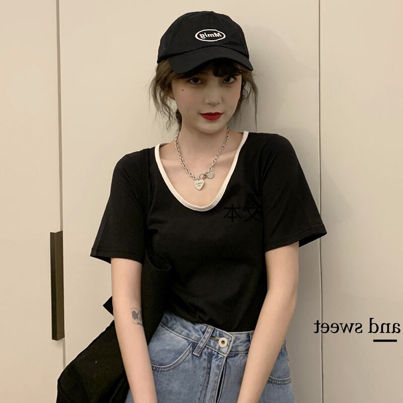 黒の半袖Tシャツレディース2022年夏ニッチなスリムなフロントショルダーVネックトップイントレンドの新しいルーズなデザインセンス ブラック サマー 夏物 746005177403805 | framboise21